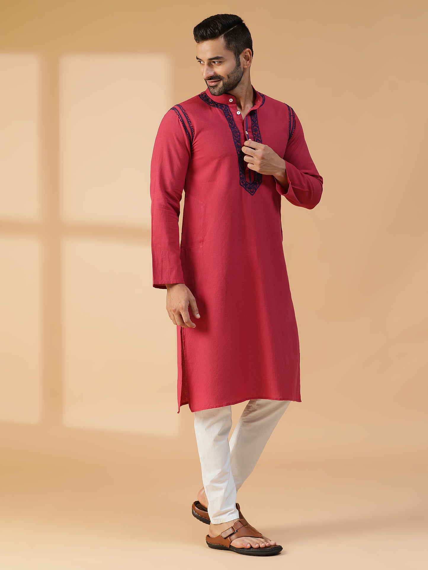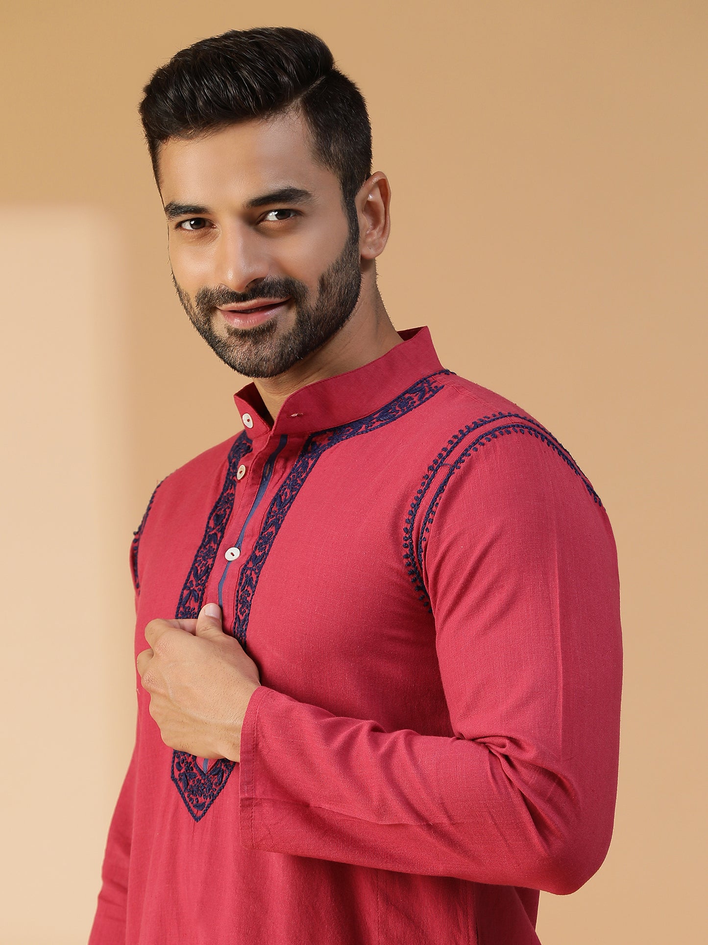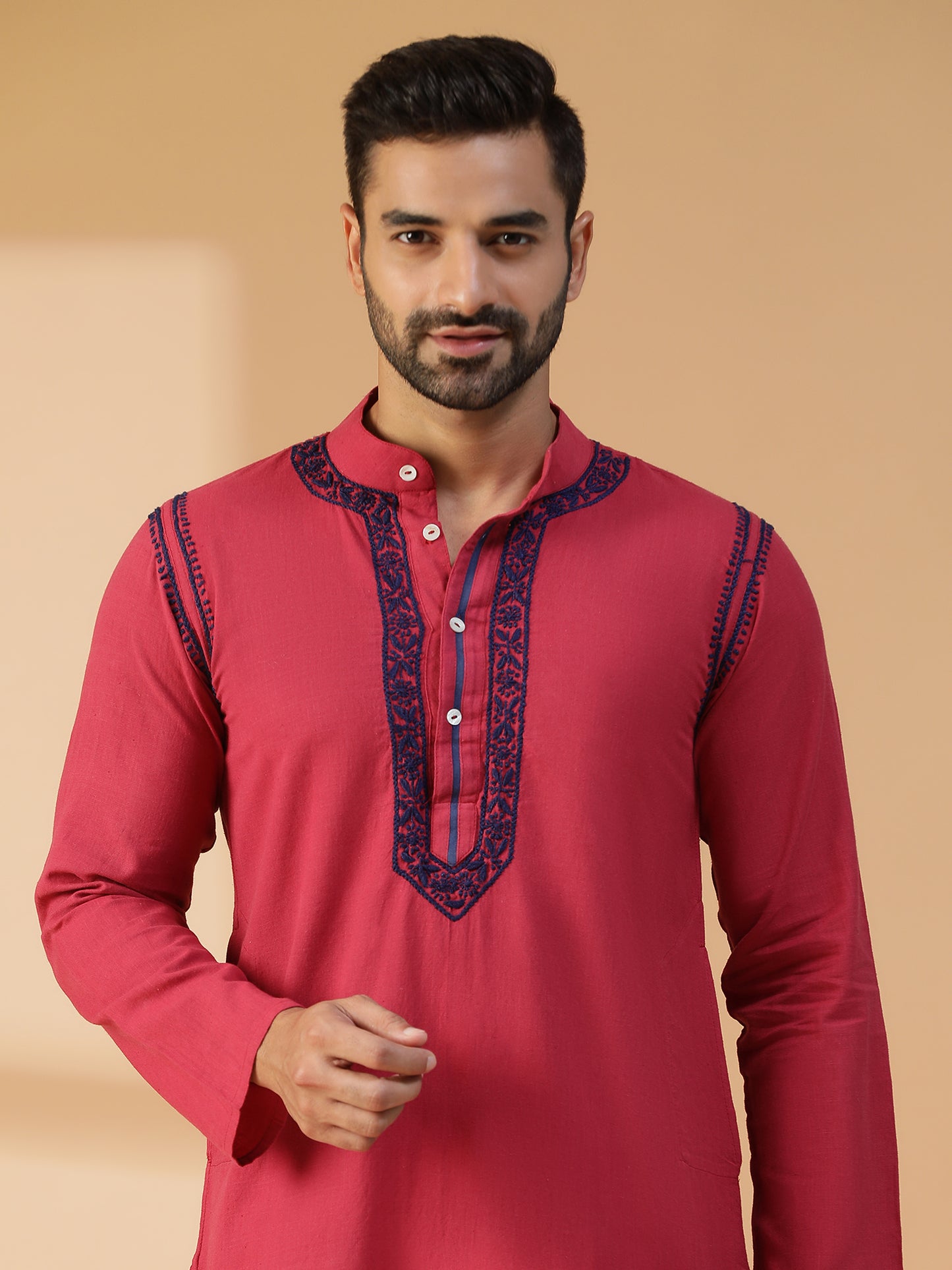 Hand Embroidered Maroon Lucknowi Chikankari Cotton A-Line Men's Kurta CH0300