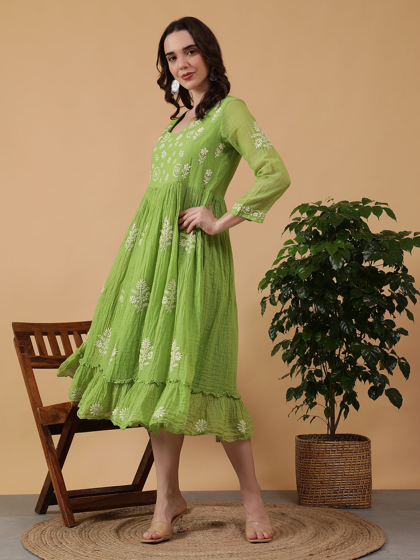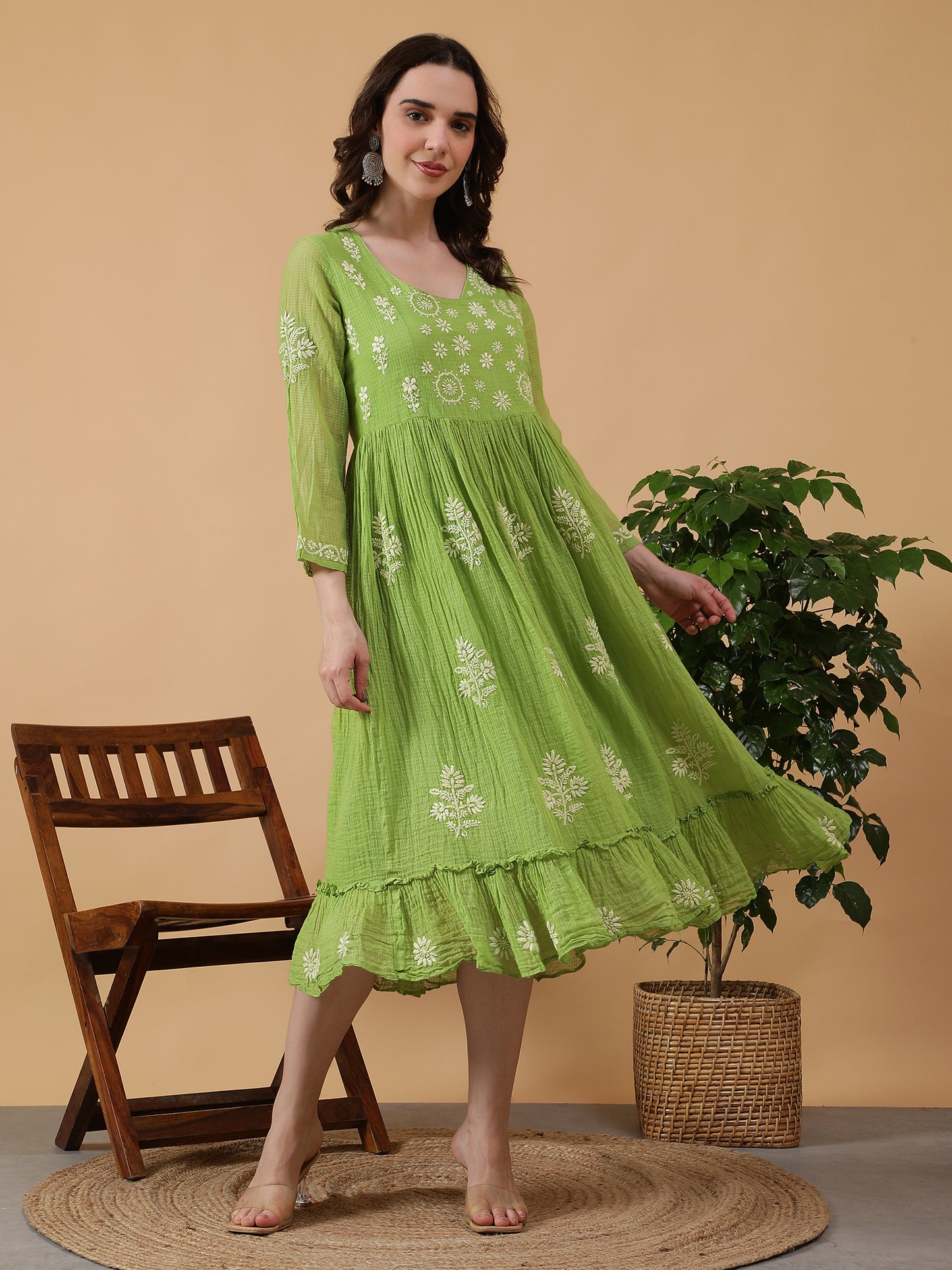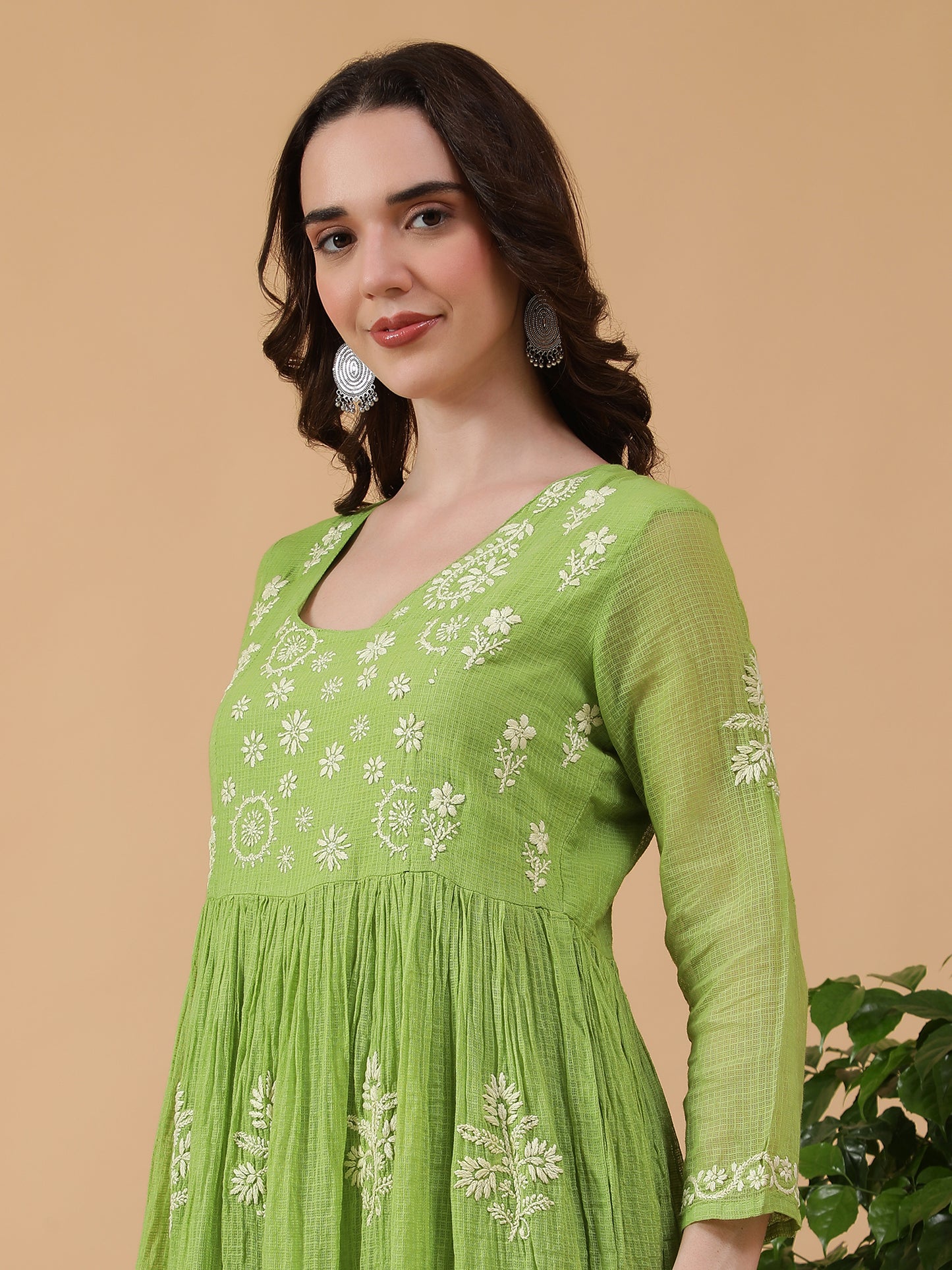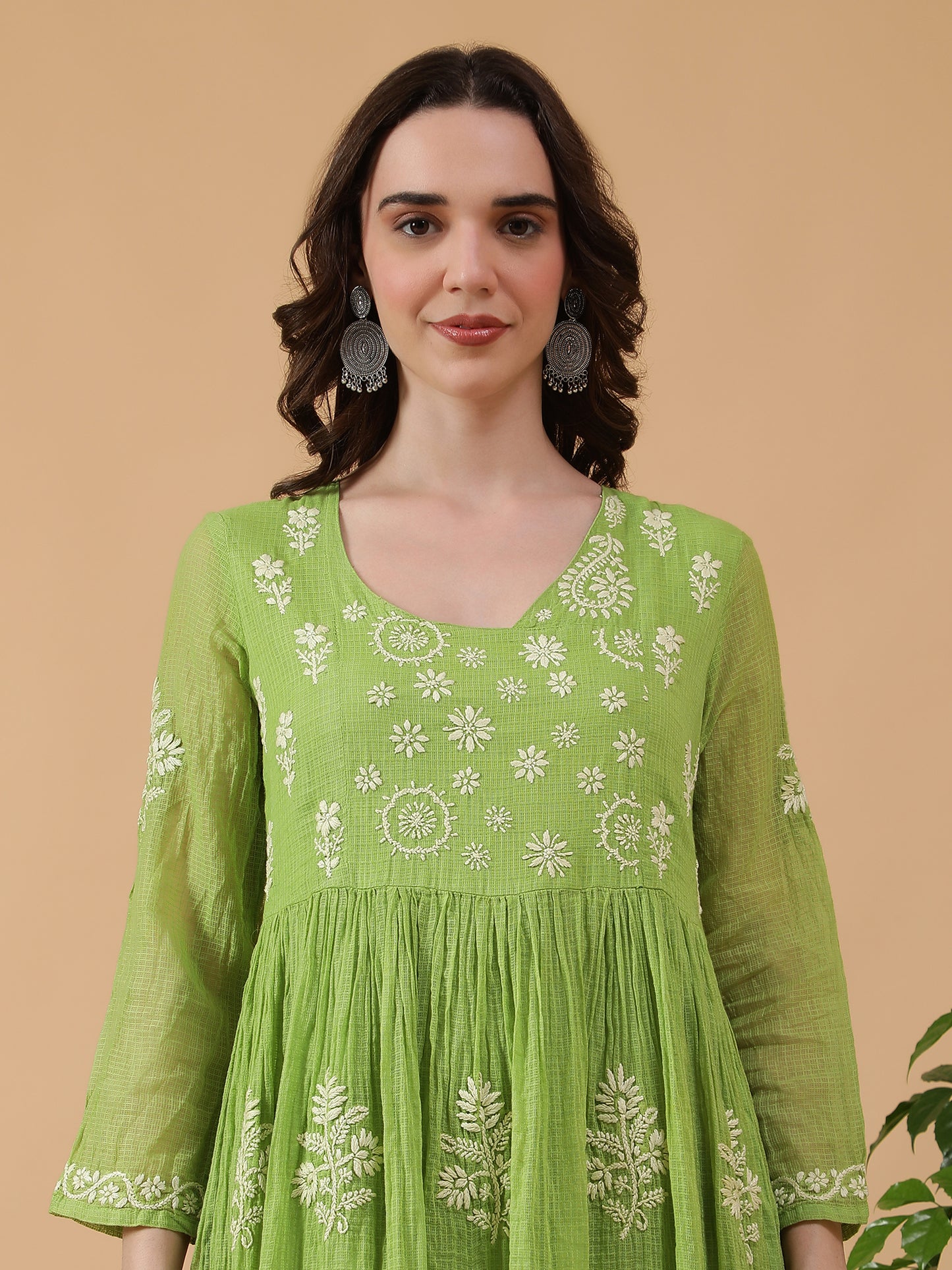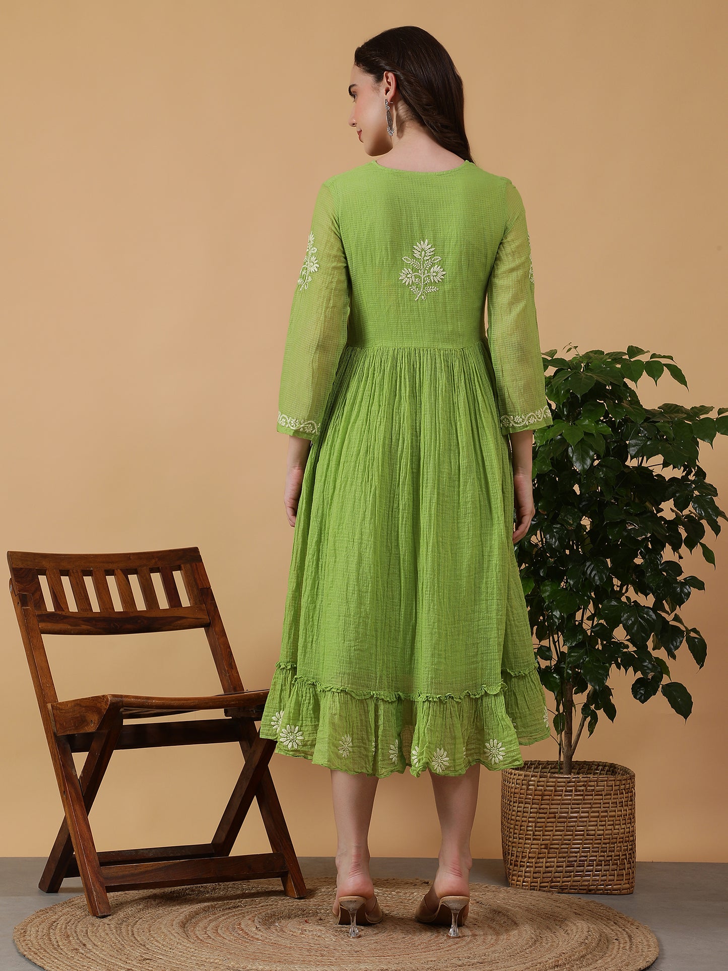 Hand Embroidered Lucknowi Chikankari Green Kota Cotton Dress with Hem Frill CH0145N