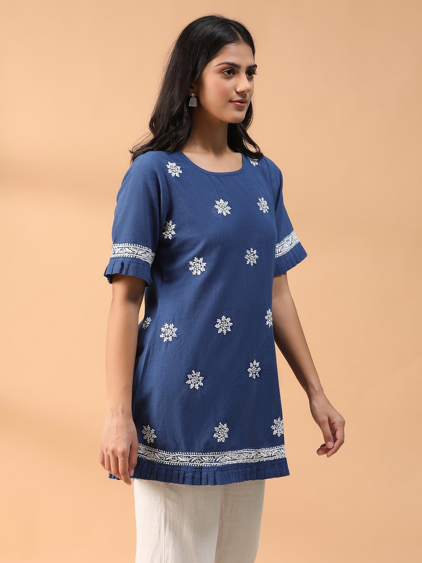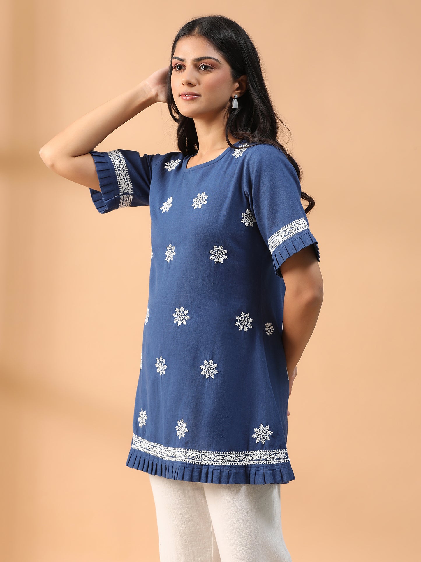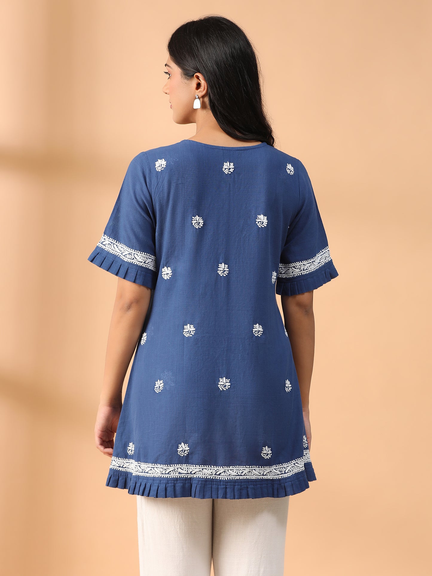 Hand Embroidered Indigo Lucknowi Chikankari Khadi Cotton Long Top CH0250