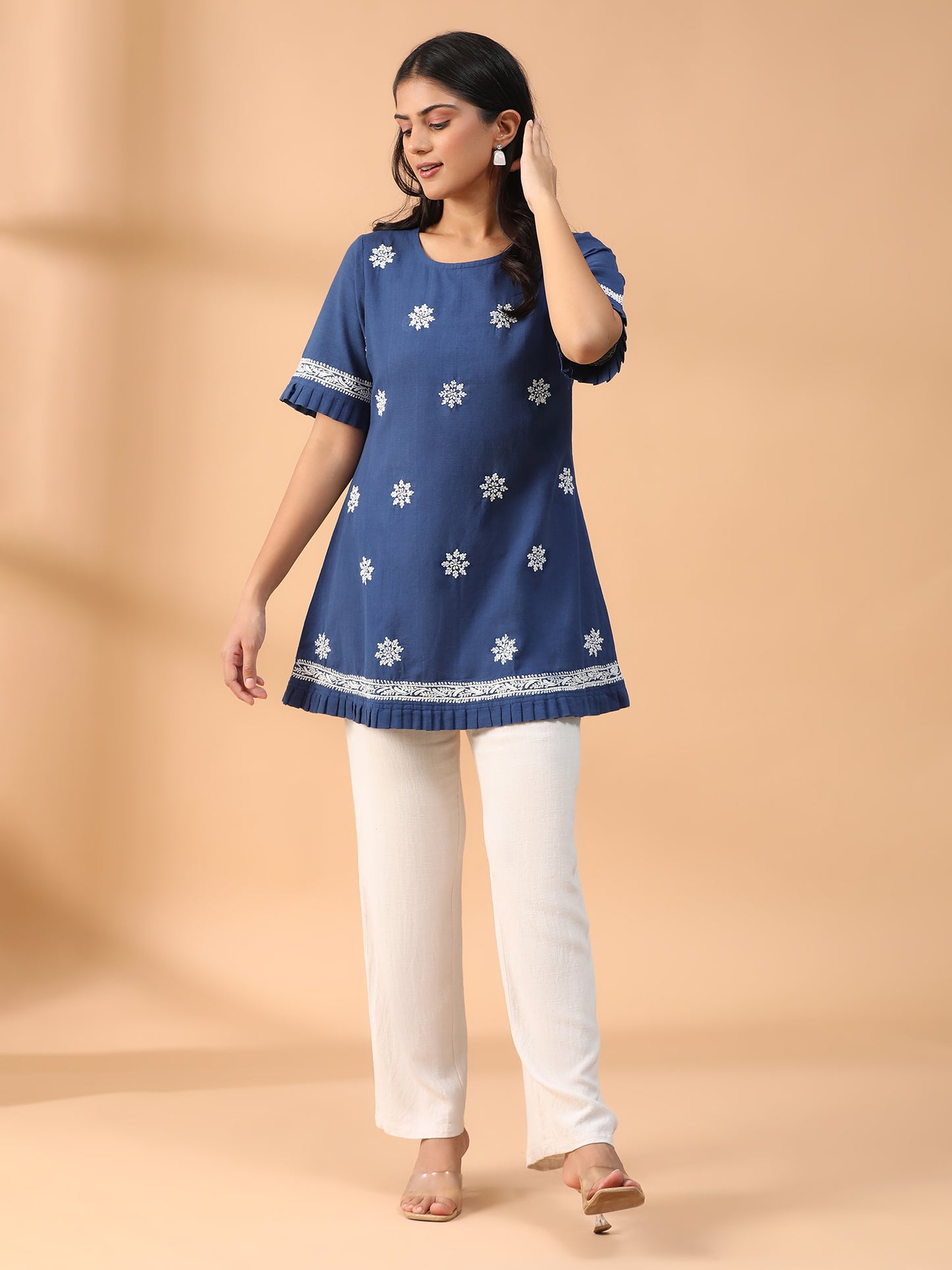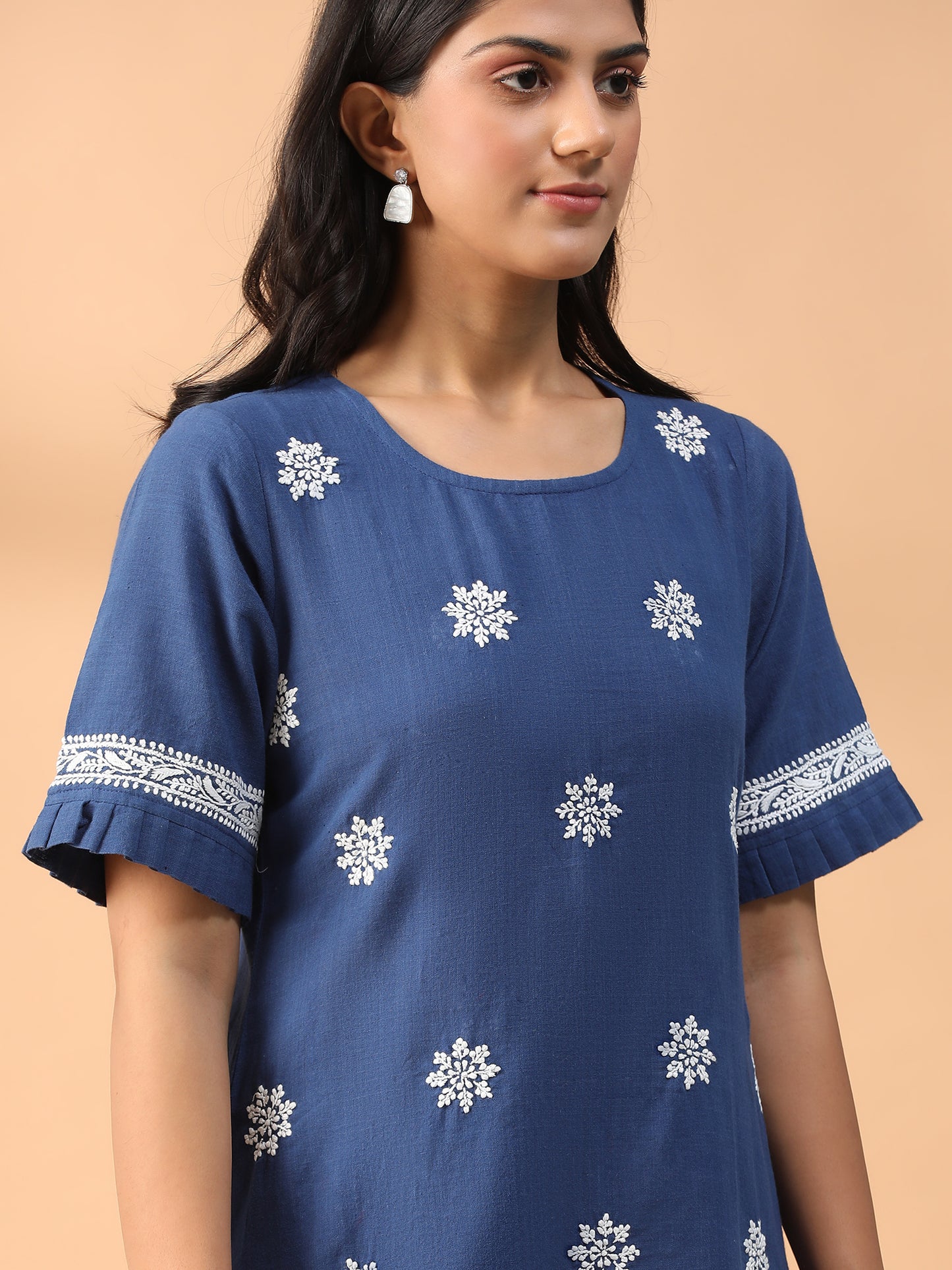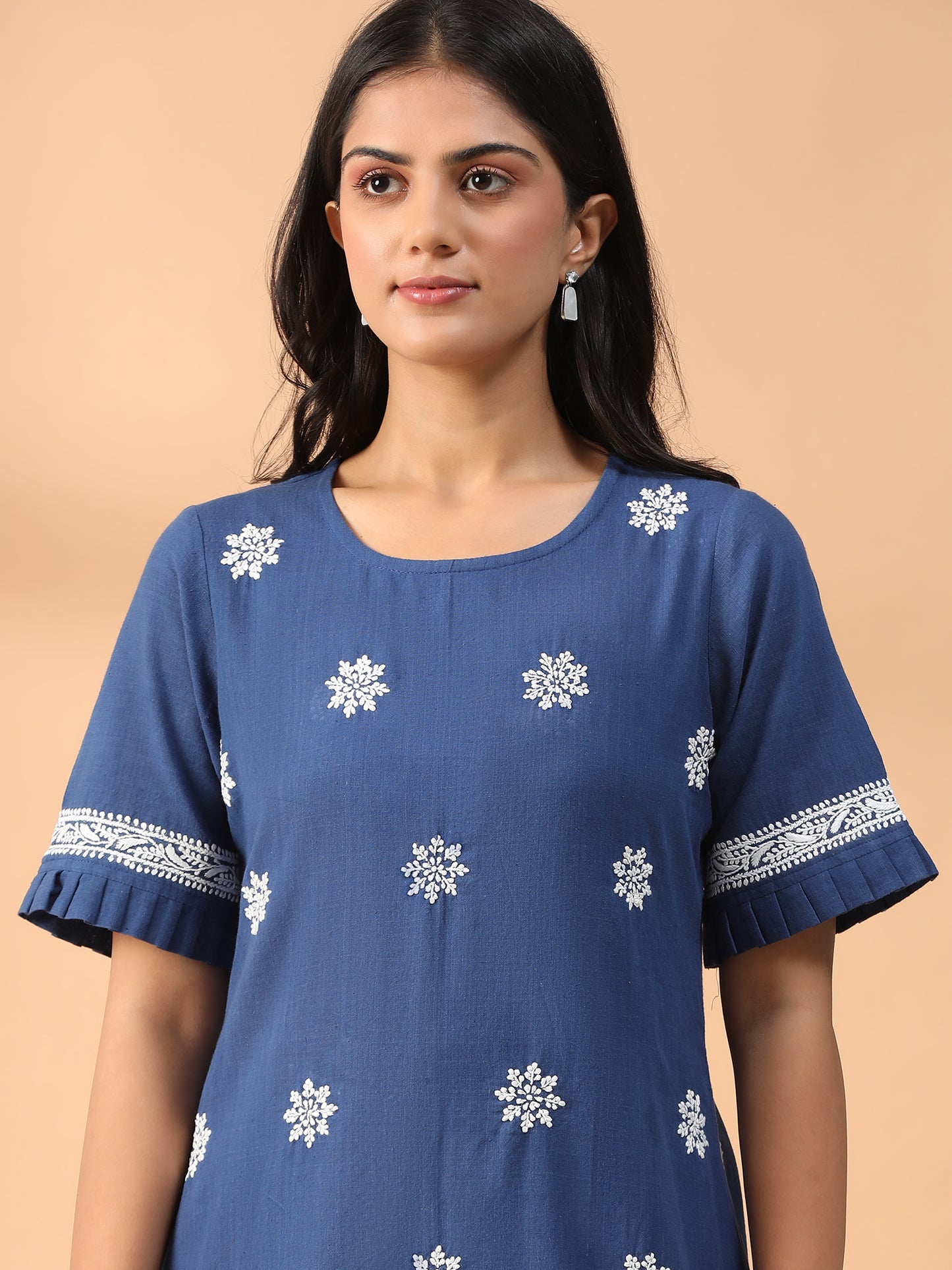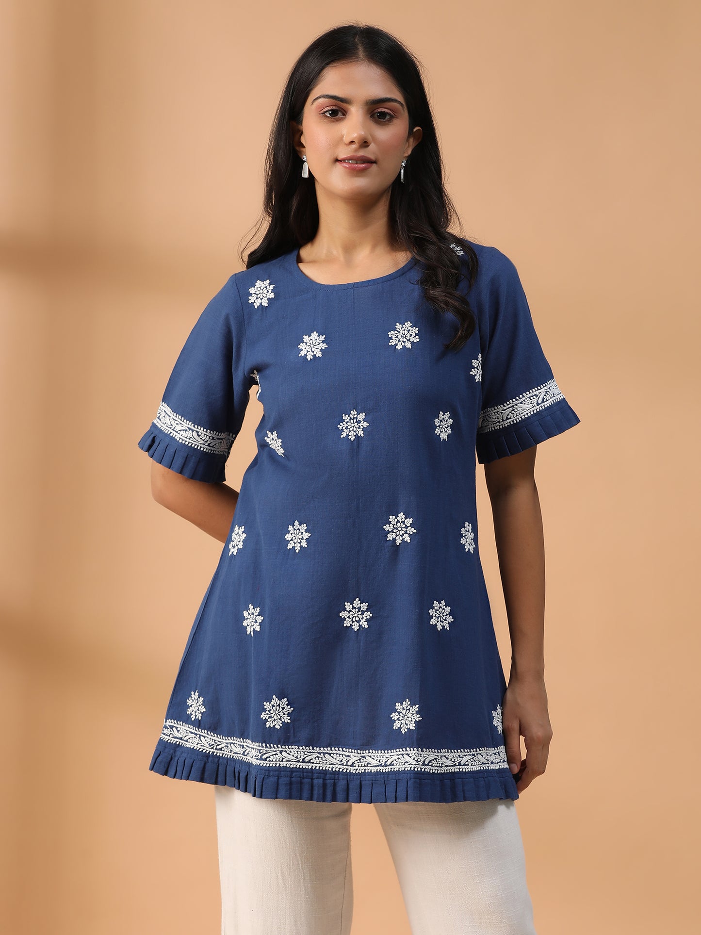 Hand Embroidered Indigo Lucknowi Chikankari Khadi Cotton Long Top CH0250