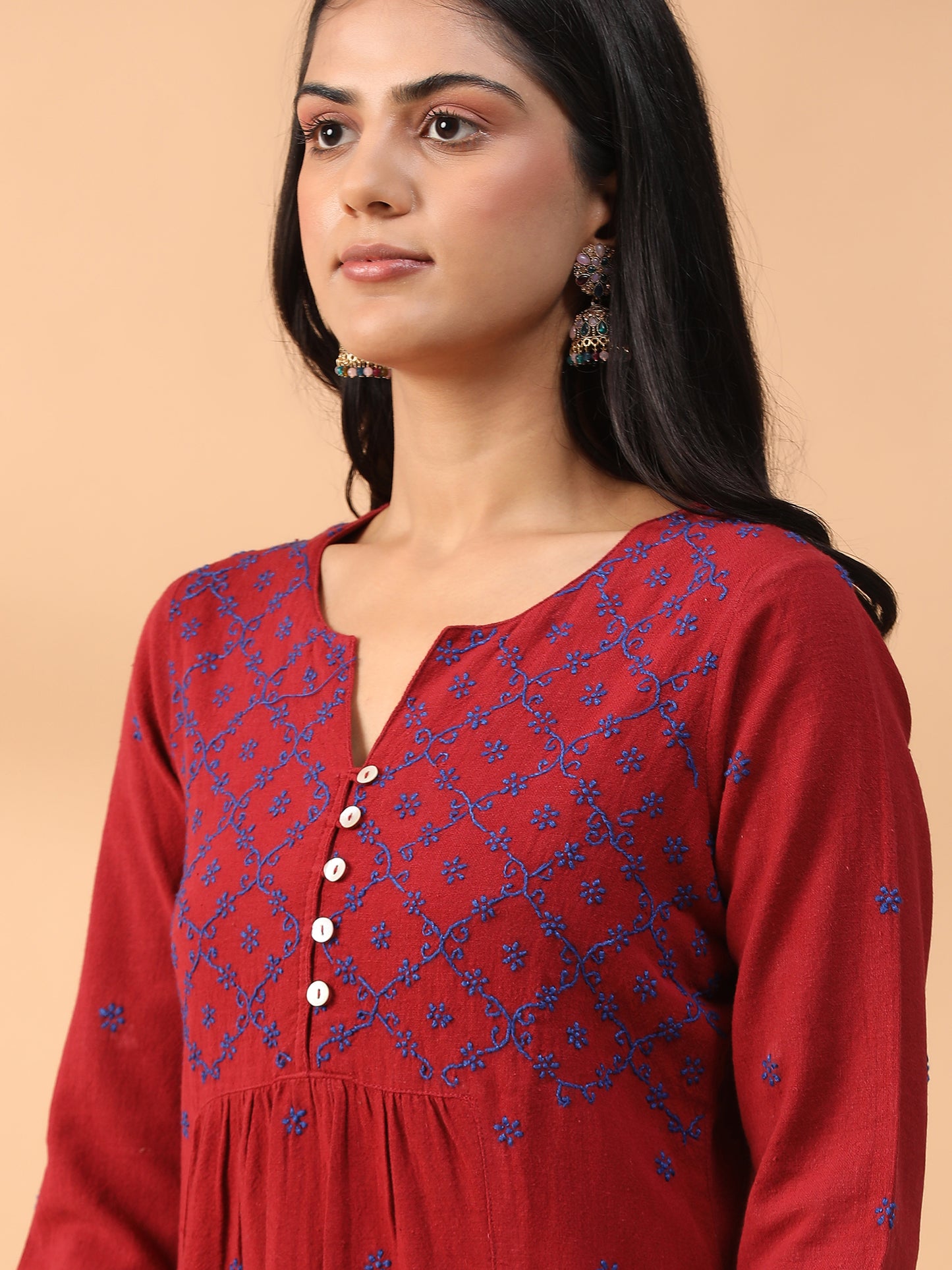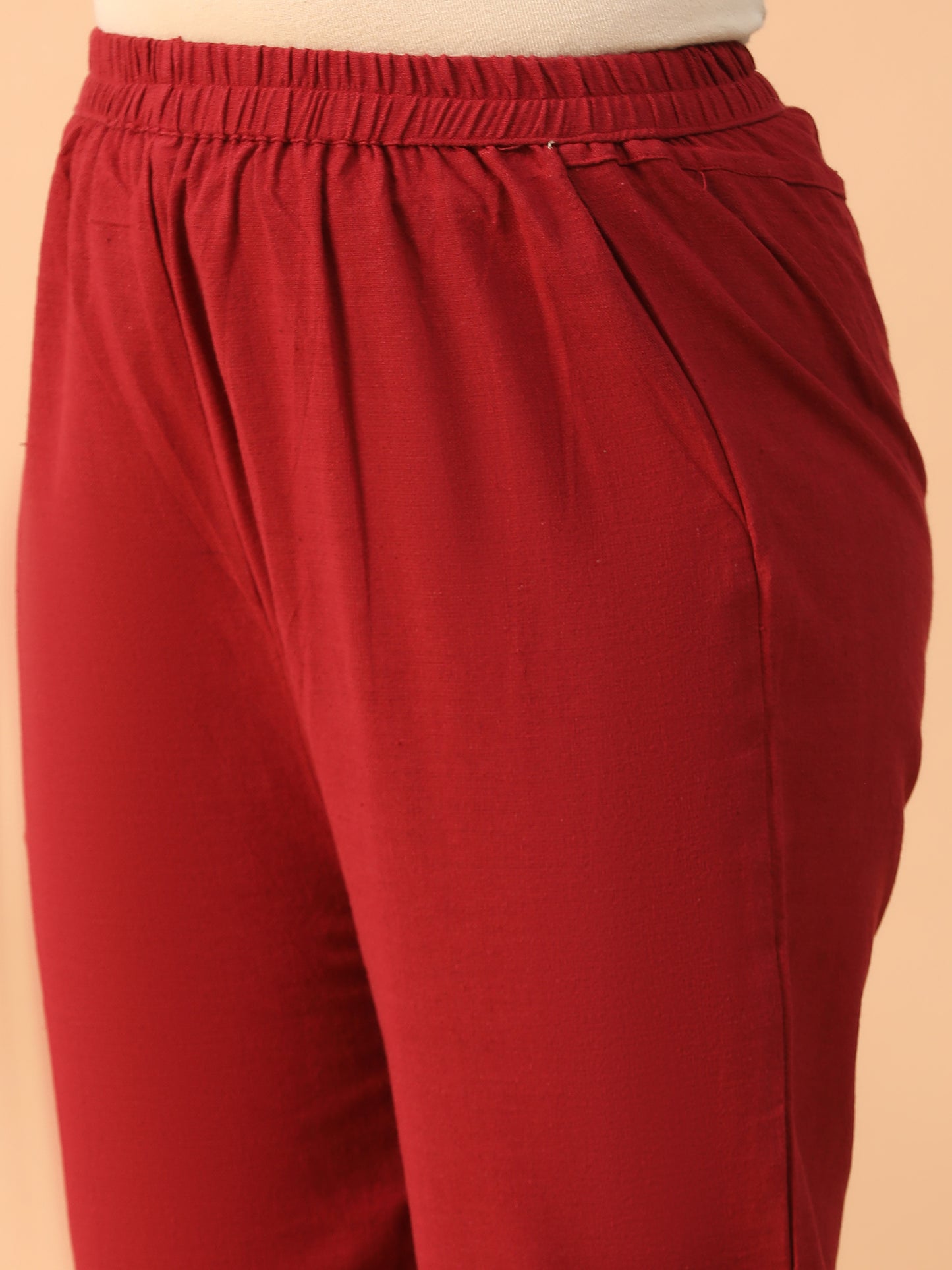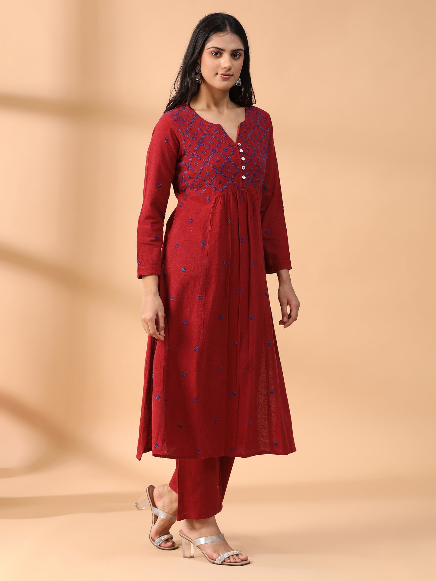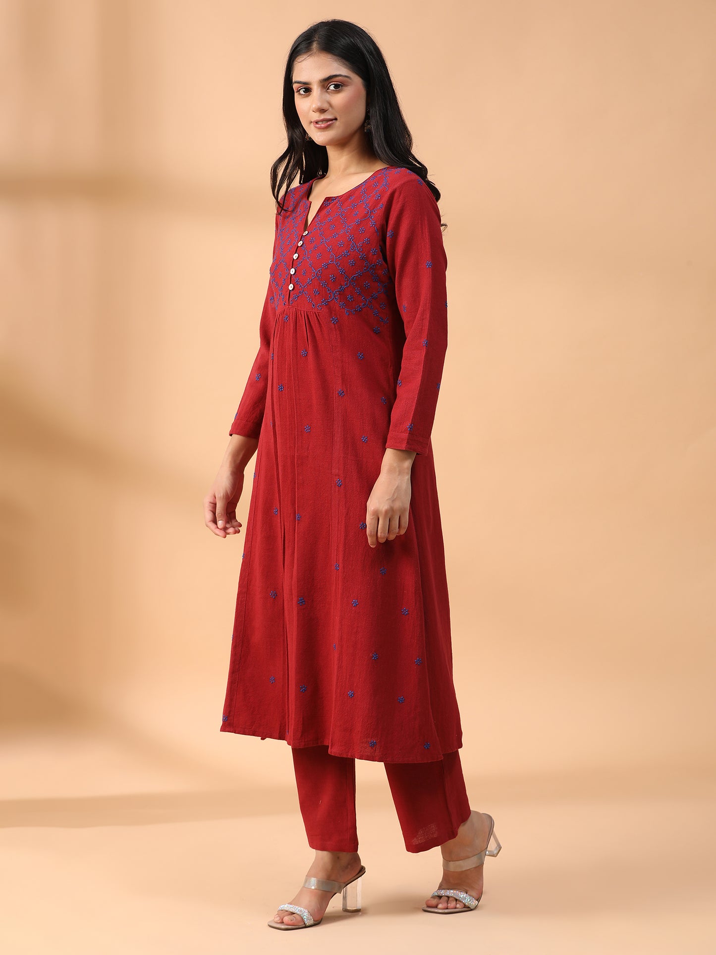 Hand Embroidered Maroon Lucknowi Chikankari Khadi Cotton A-Line Kurta With Pant Set CH0264