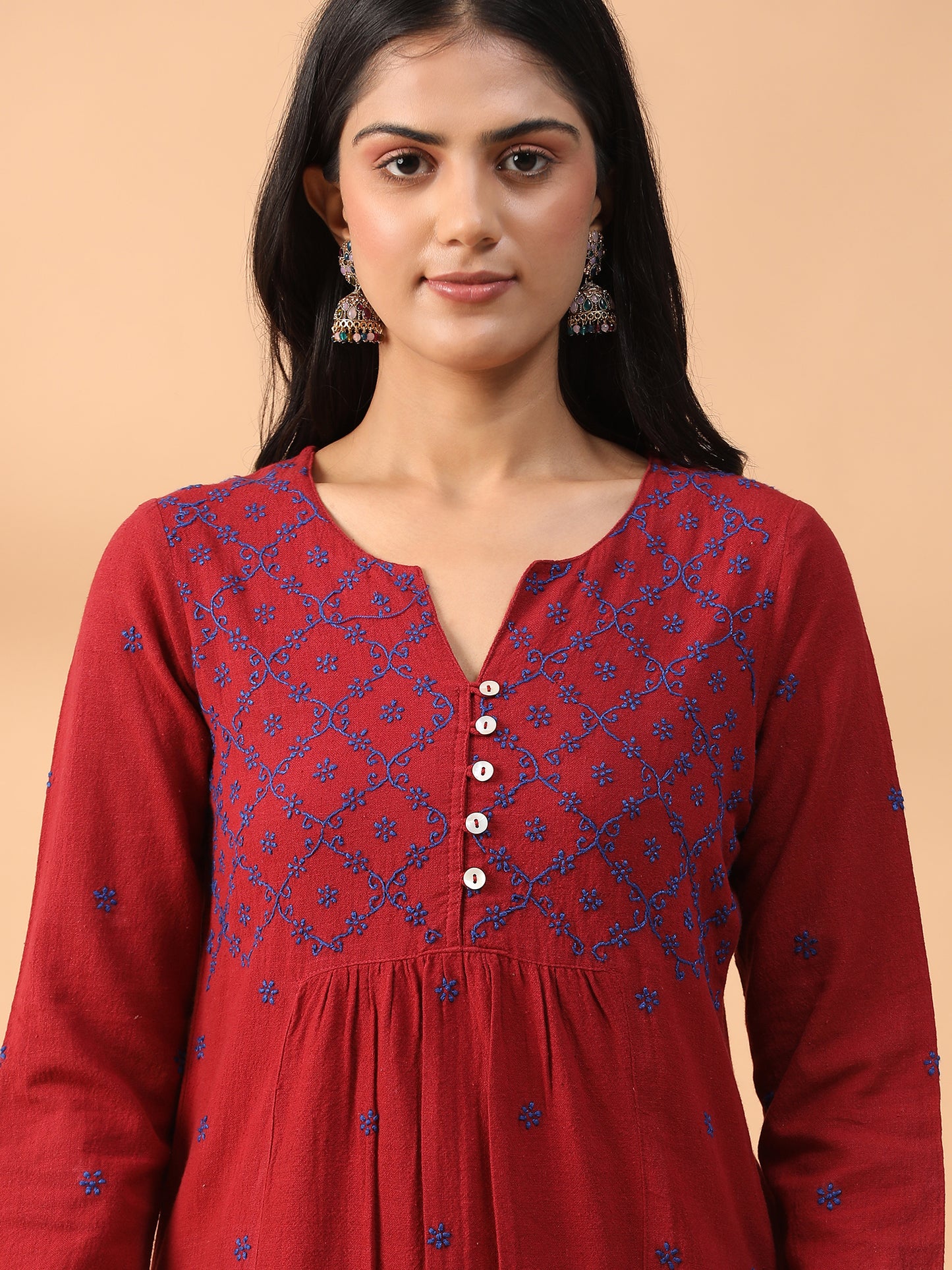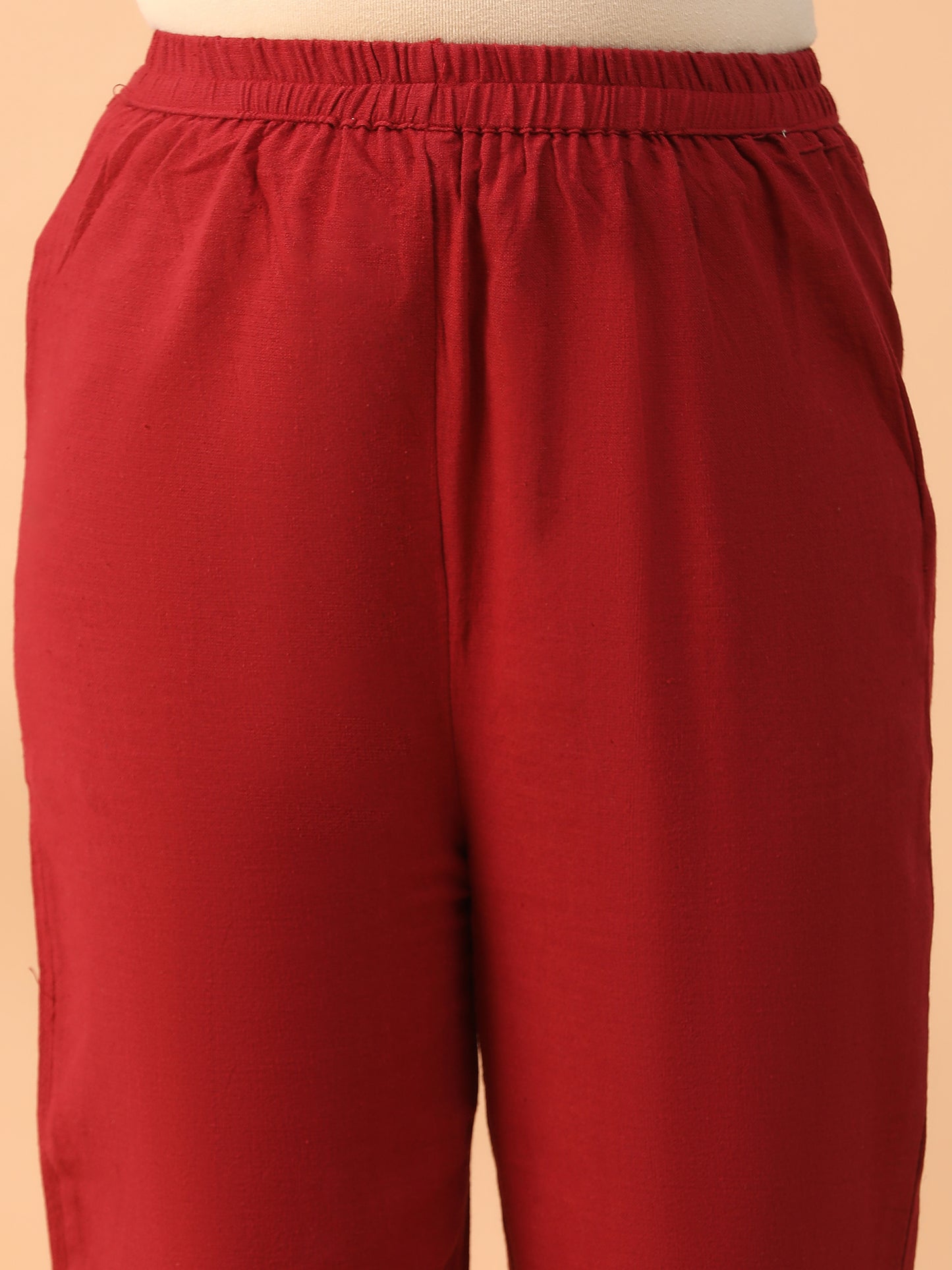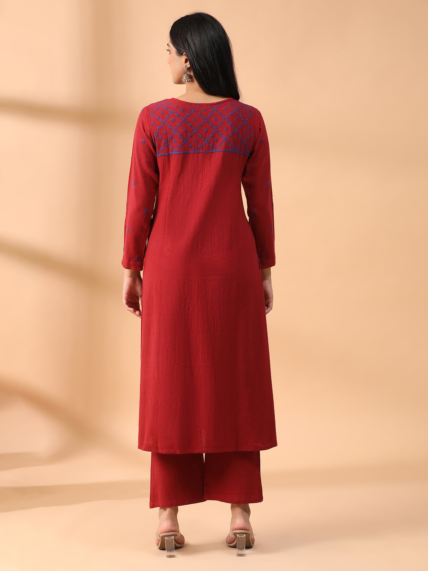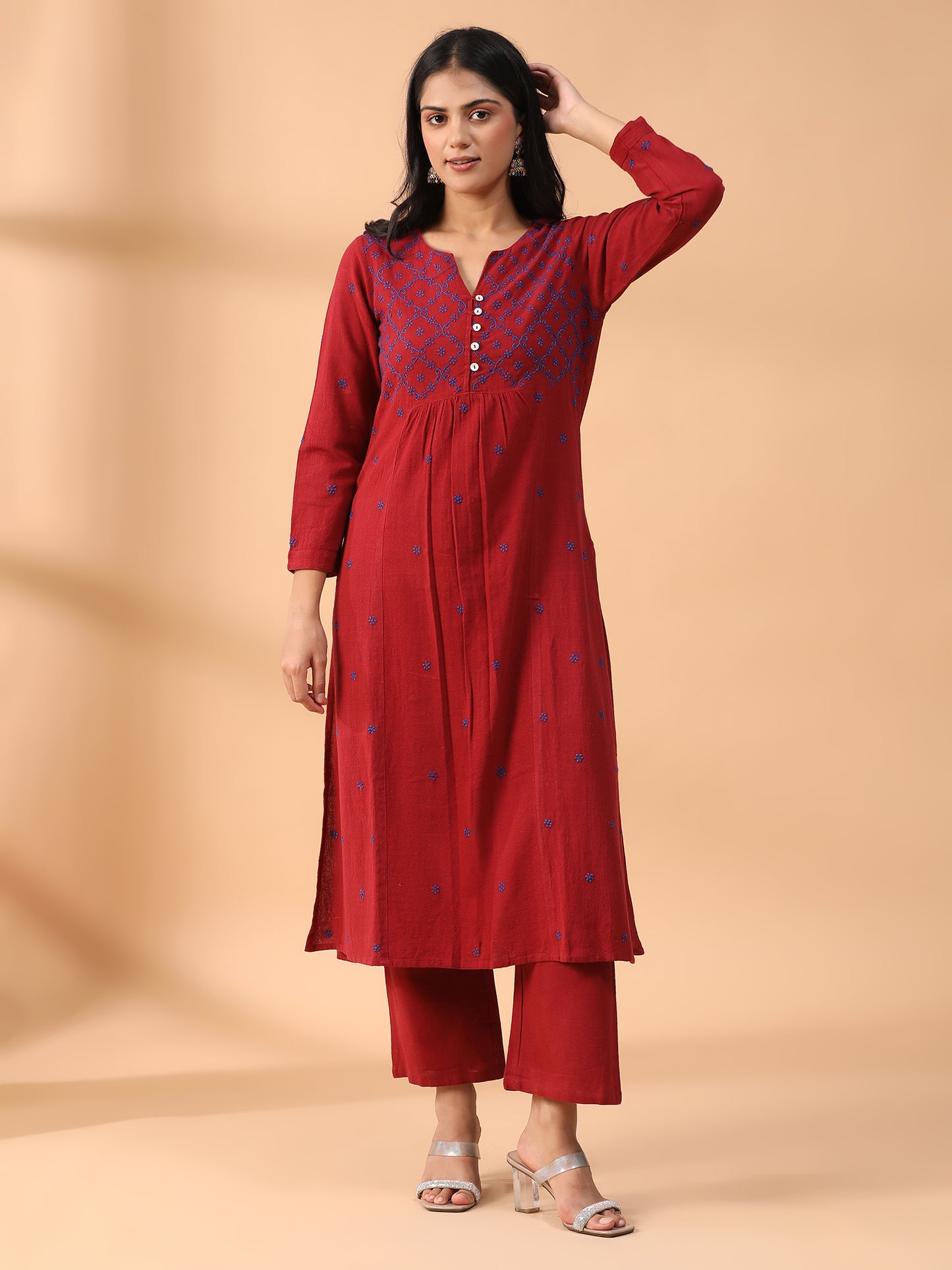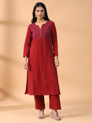 Hand Embroidered Maroon Lucknowi Chikankari Khadi Cotton A-Line Kurta With Pant Set CH0264