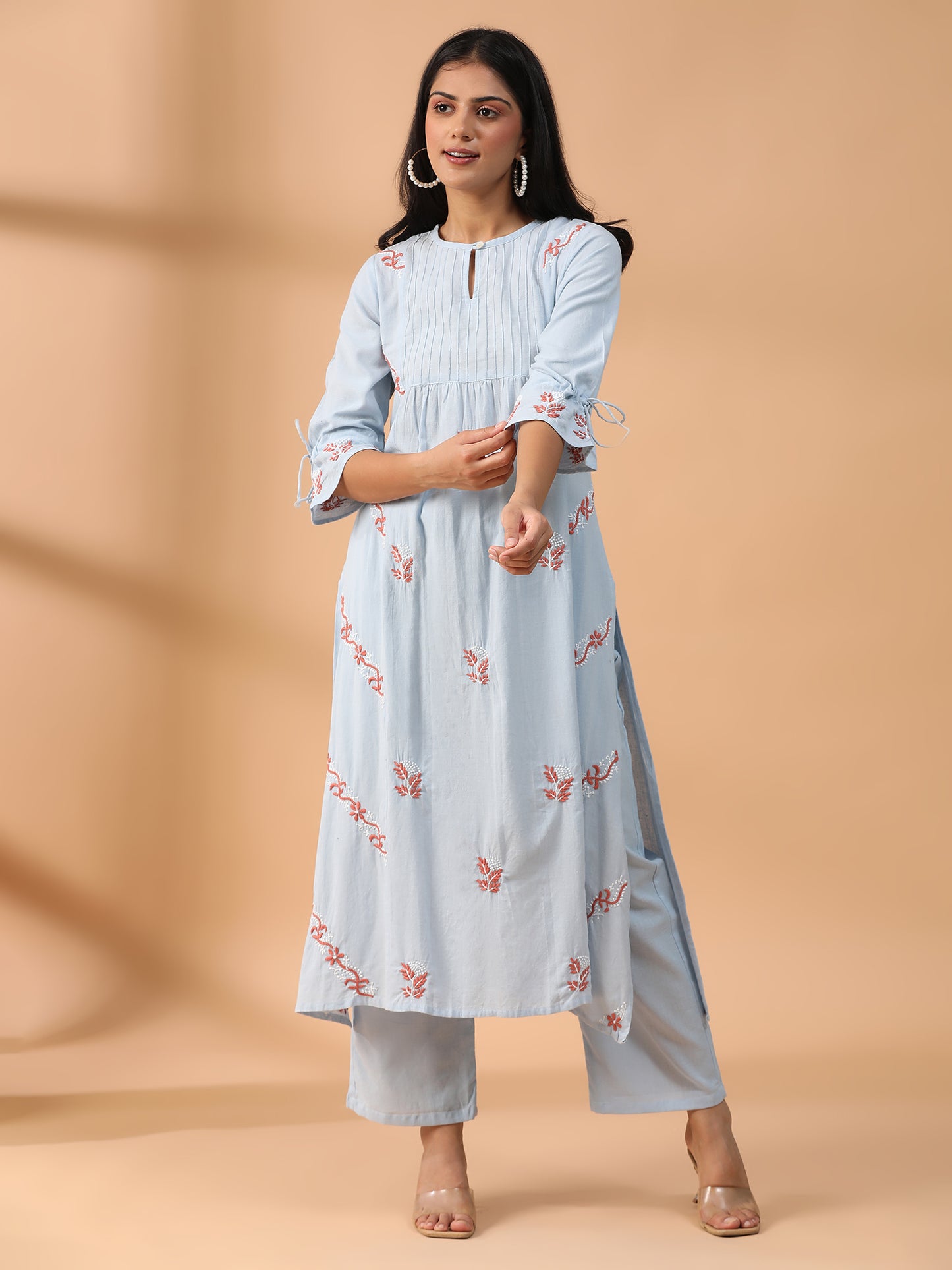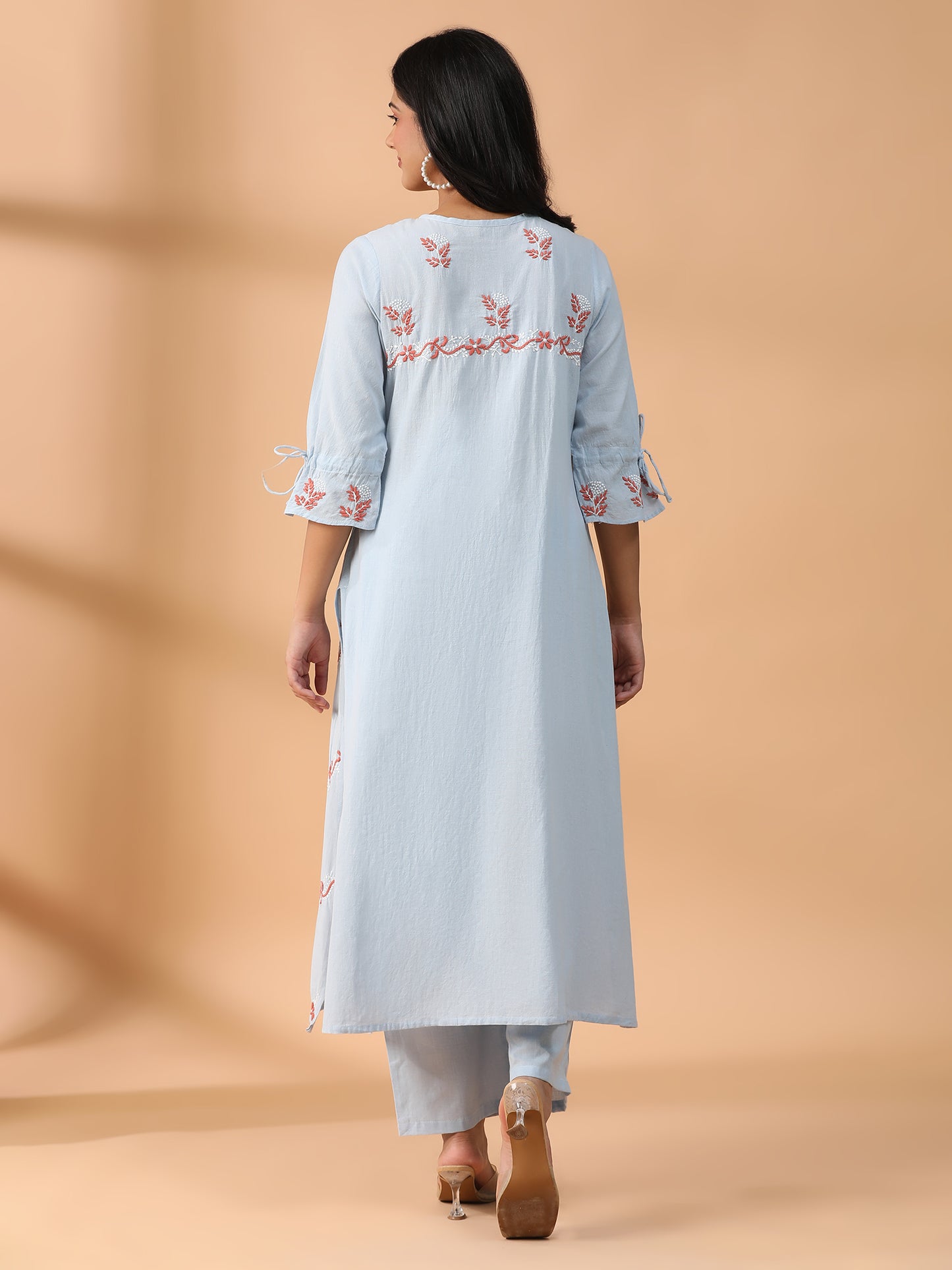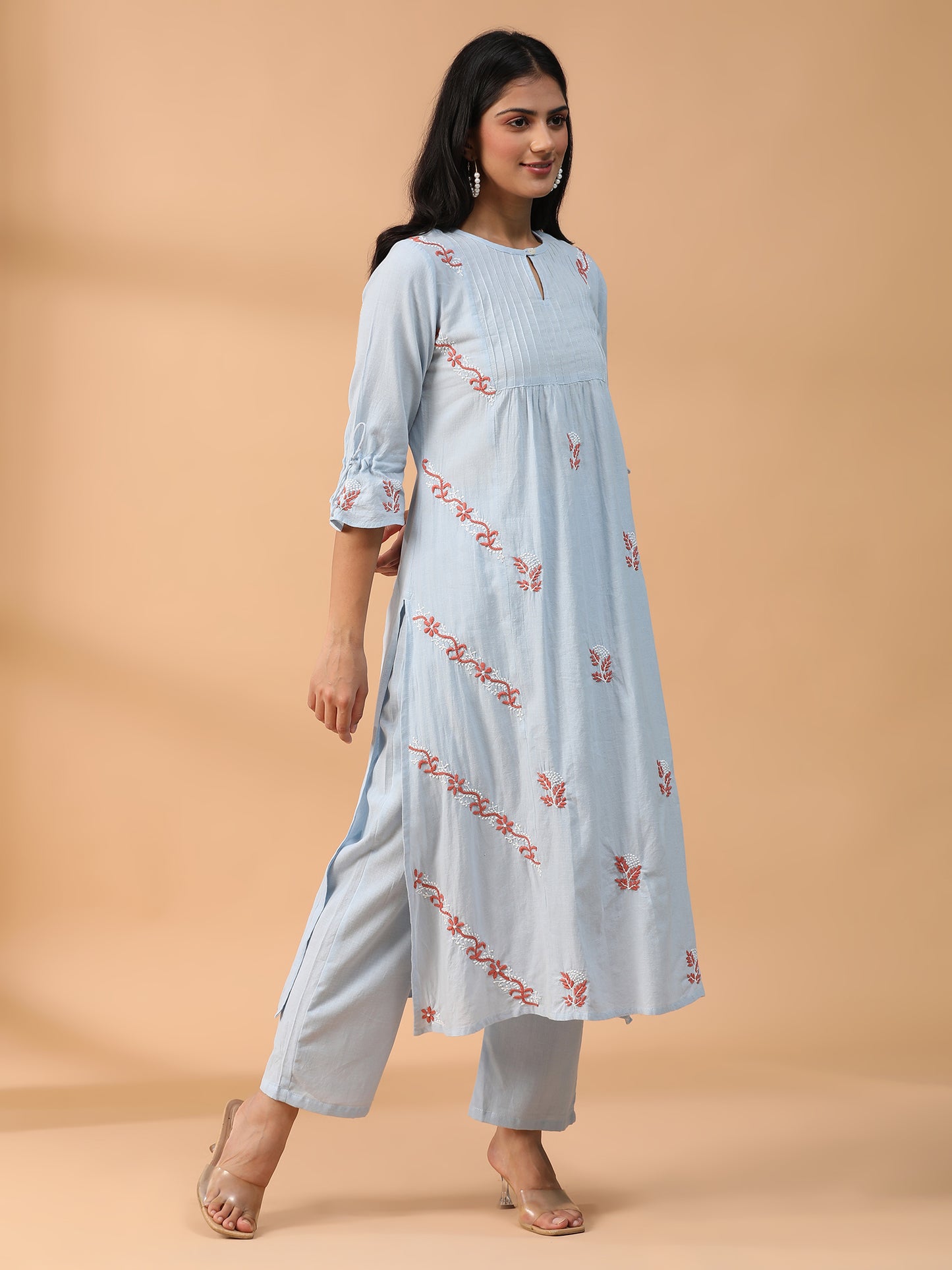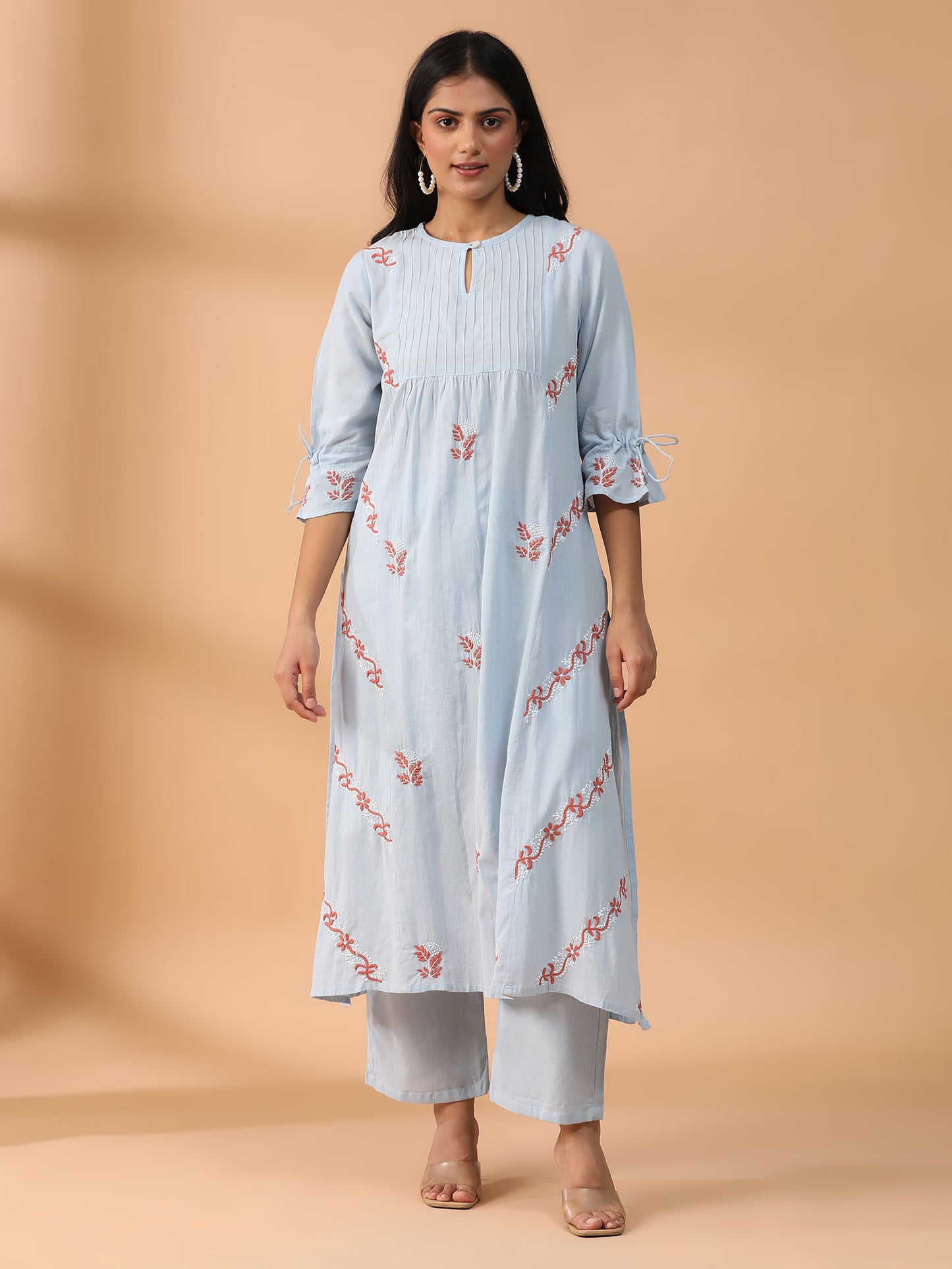 Hand Embroidered Powder Blue Lucknowi Chikankari Khadi Cotton A-Line Kurta With Pants Set CH0288