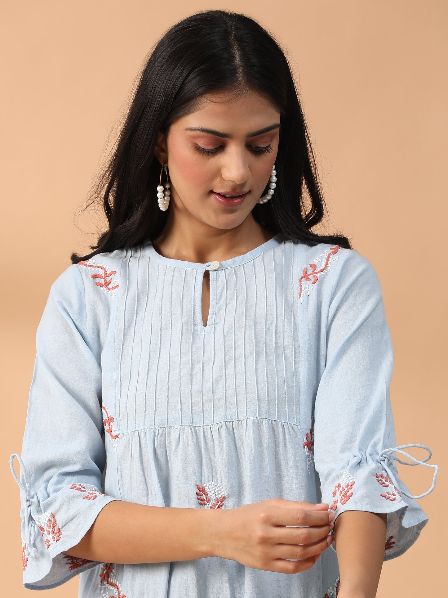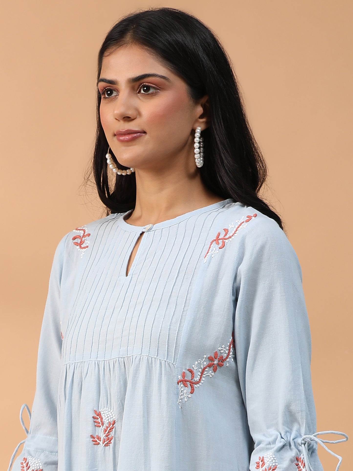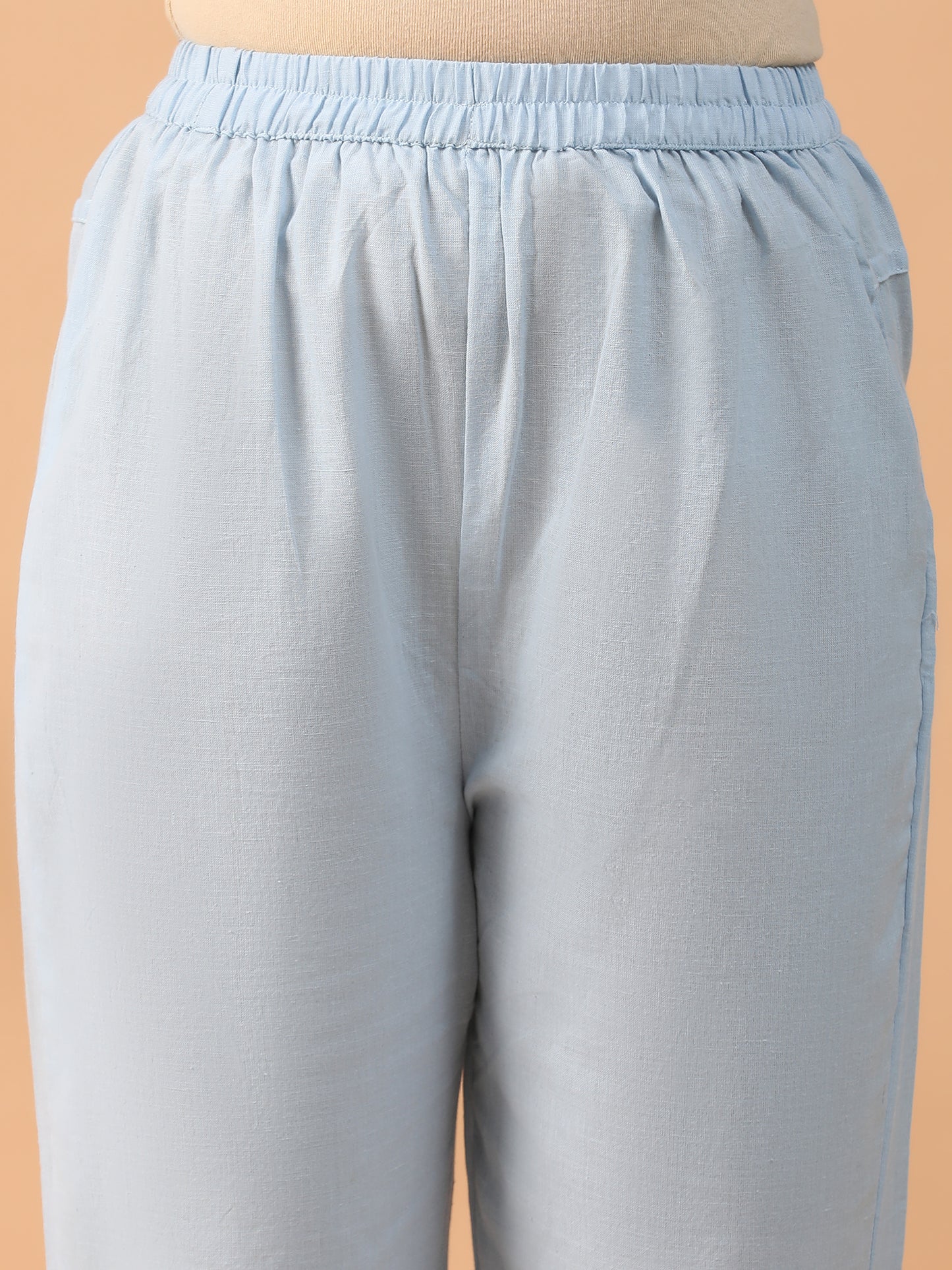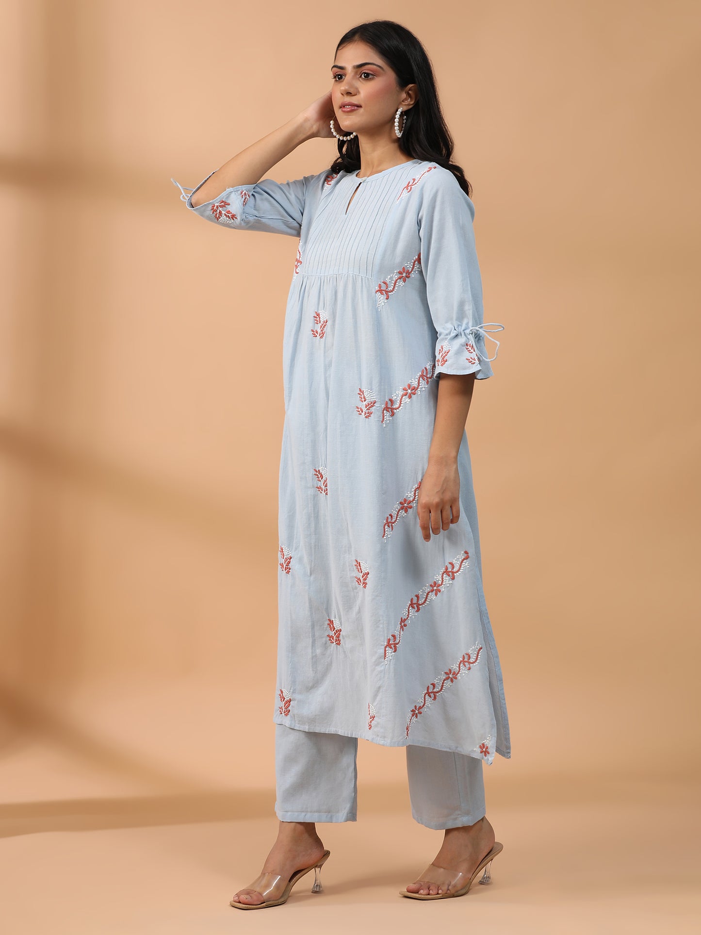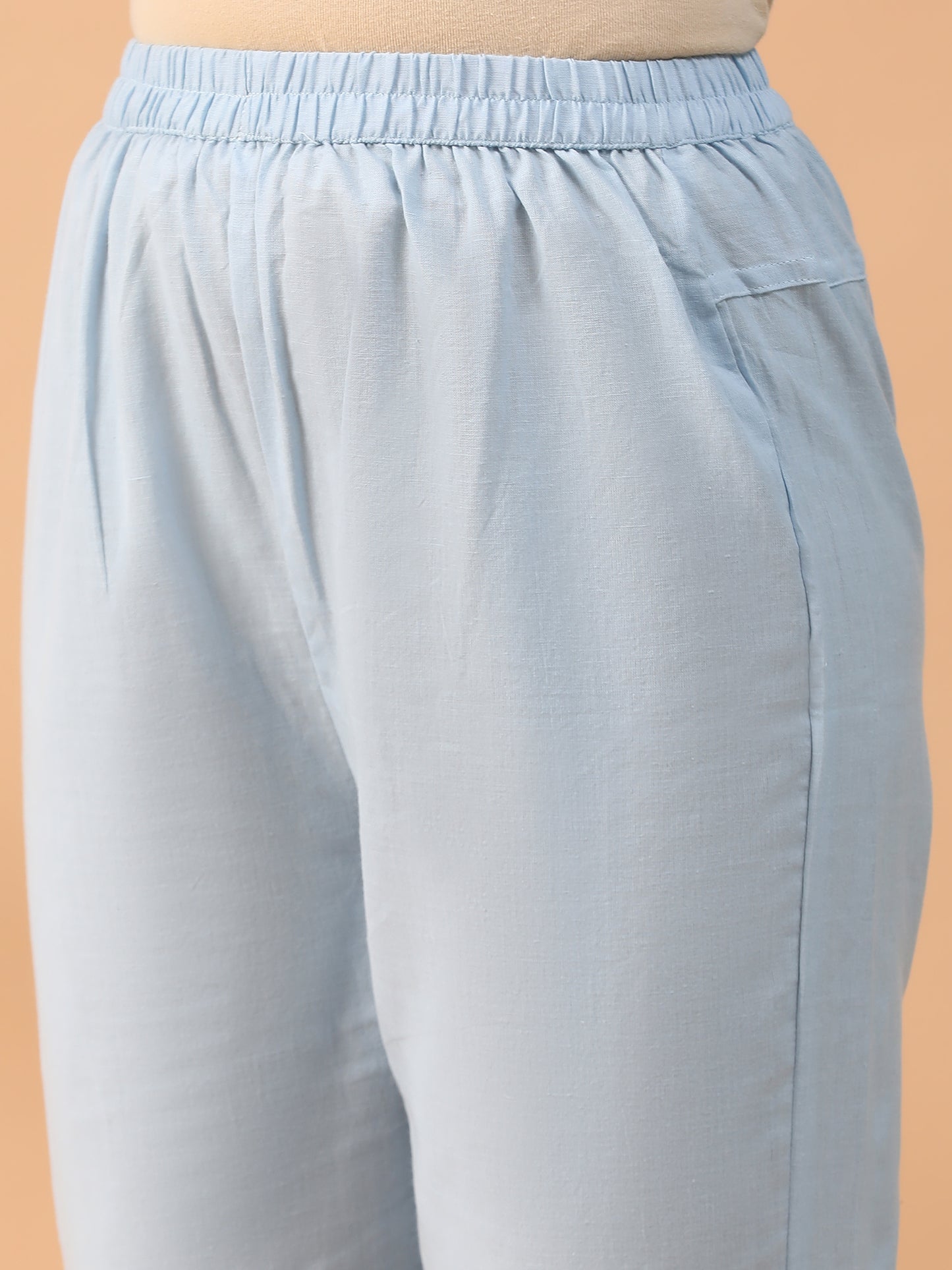 Hand Embroidered Powder Blue Lucknowi Chikankari Khadi Cotton A-Line Kurta With Pants Set CH0288