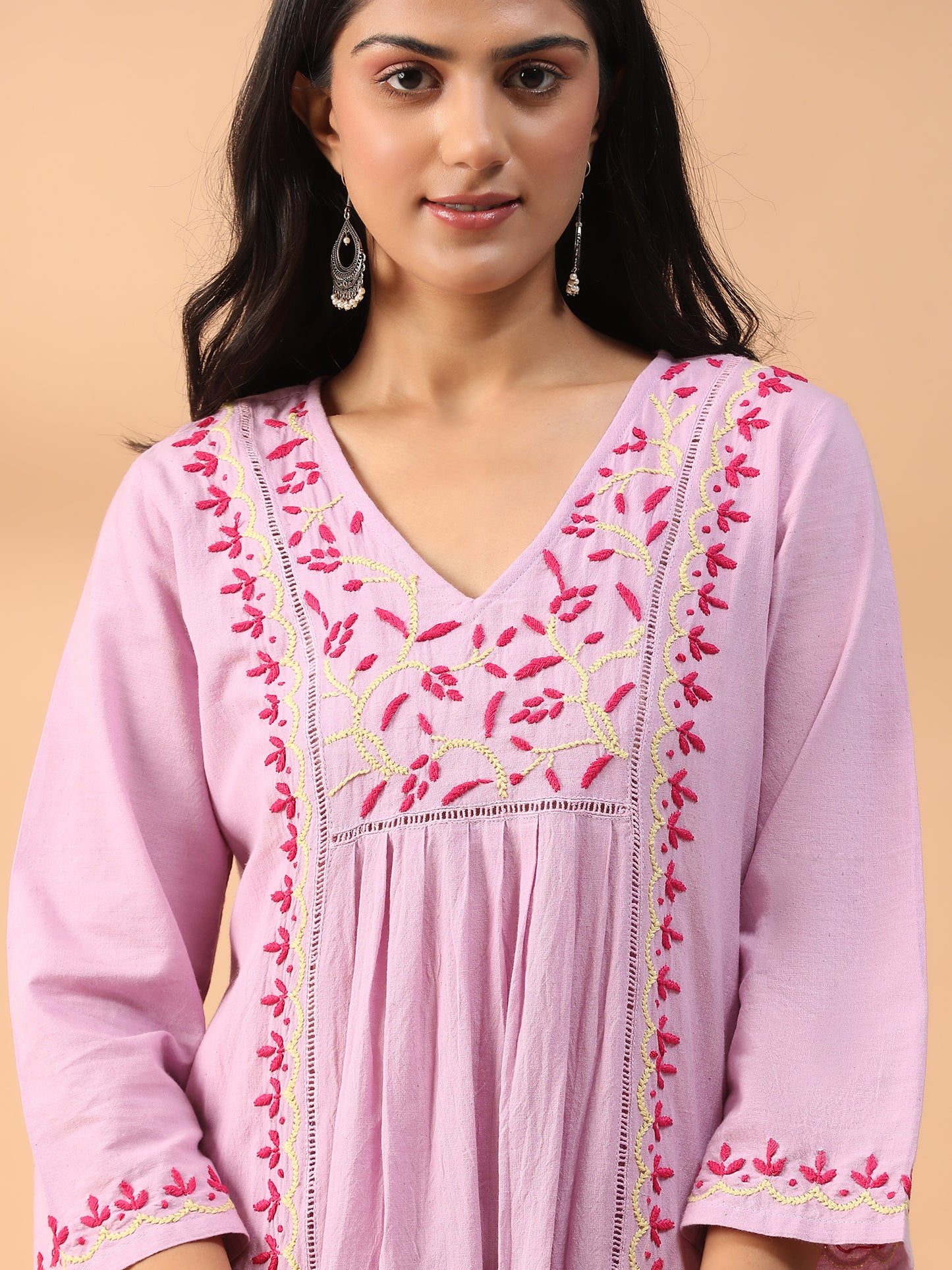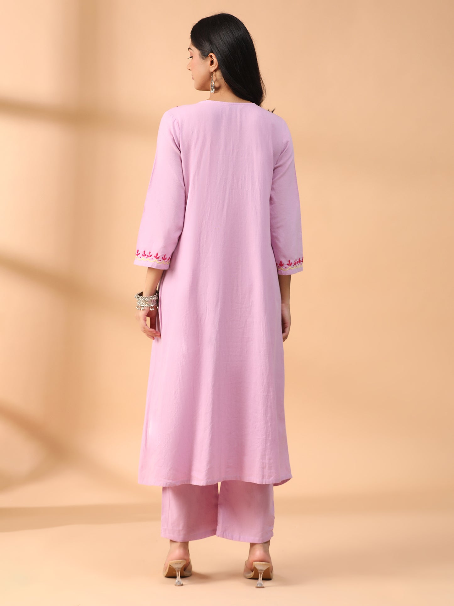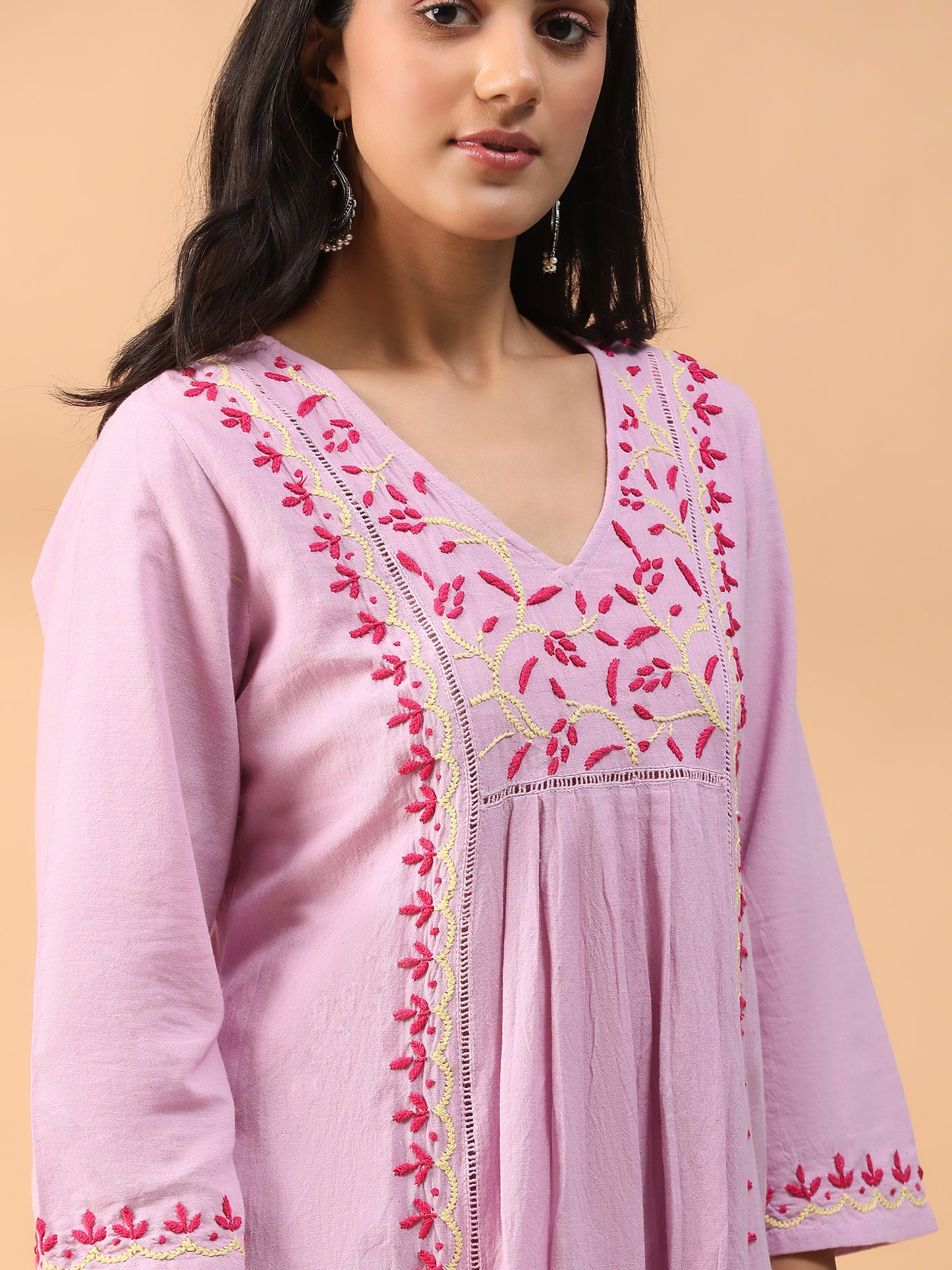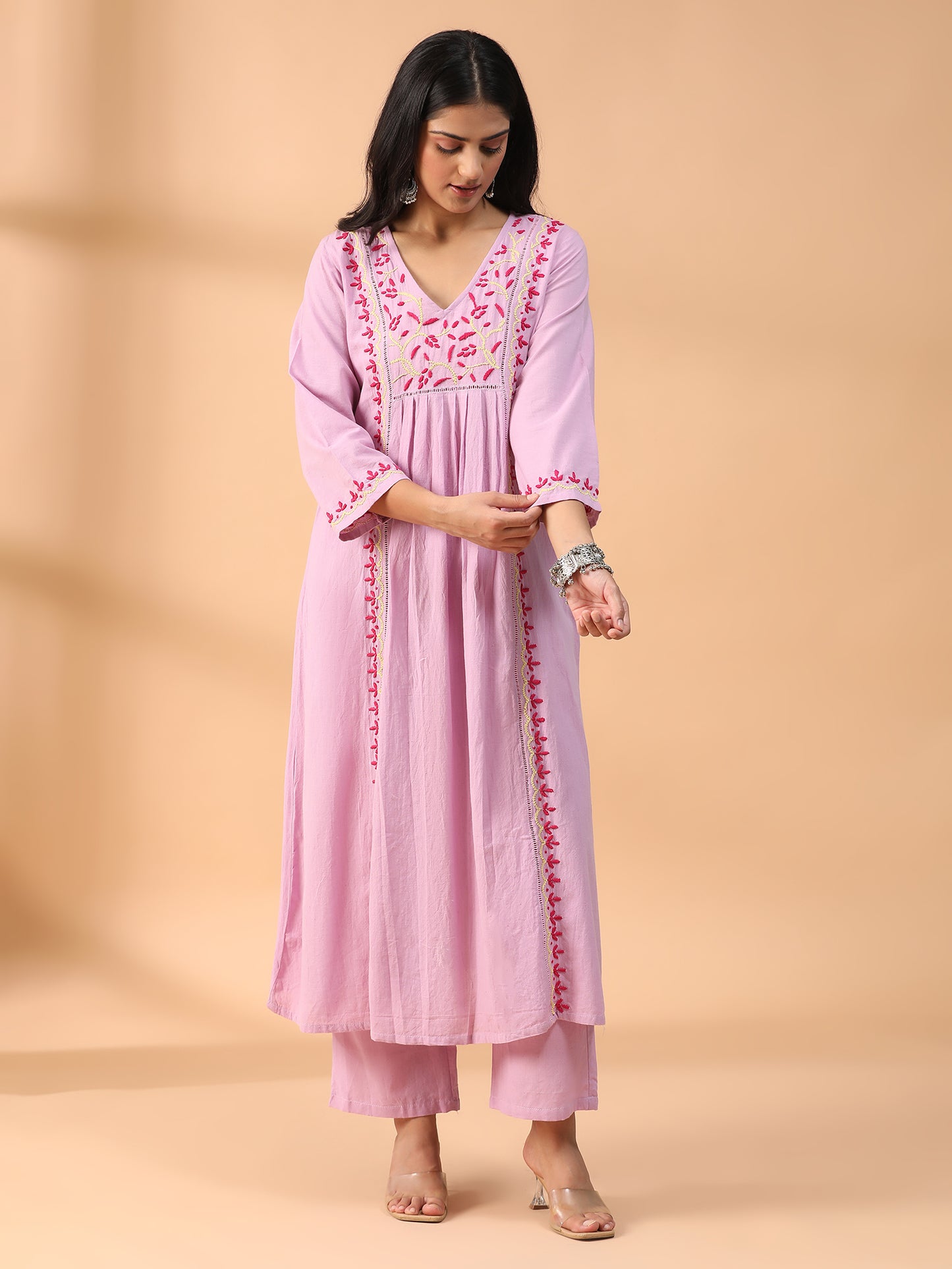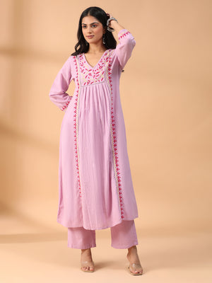 Hand Embroidered Pink Lucknowi Chikankari Khadi Cotton A-Line Kurta With Pants Set CH0289