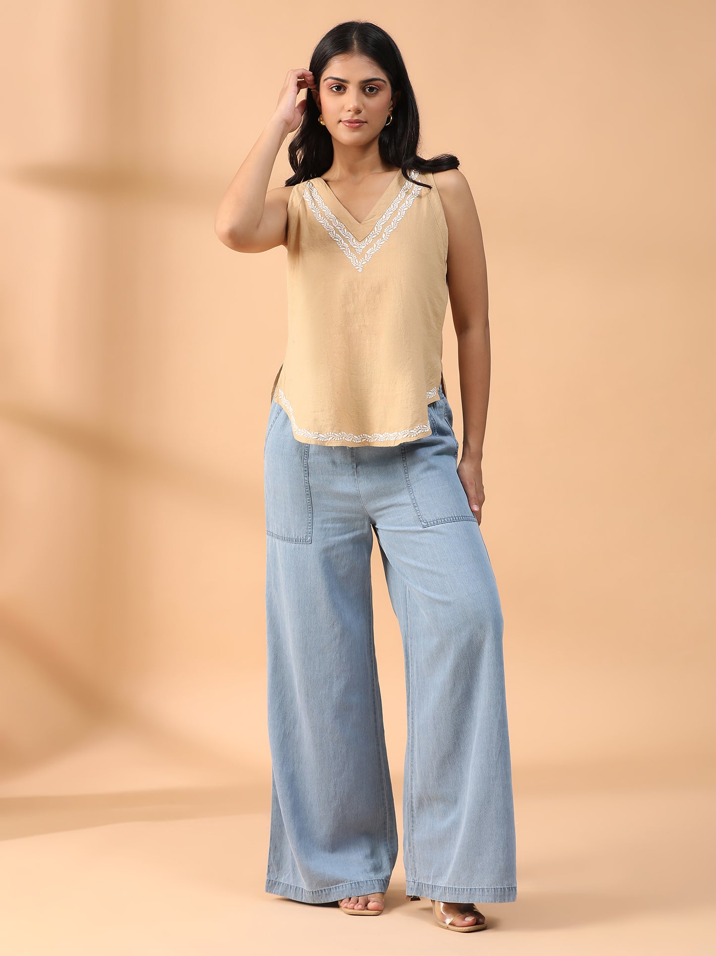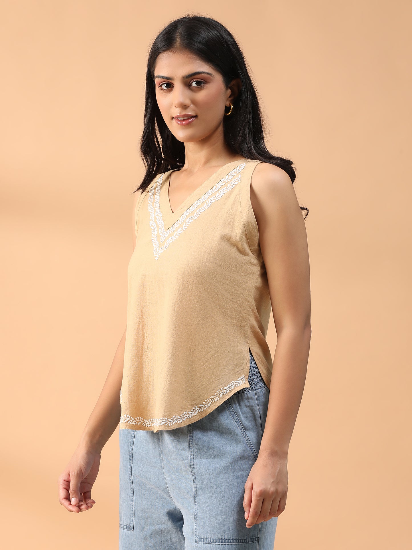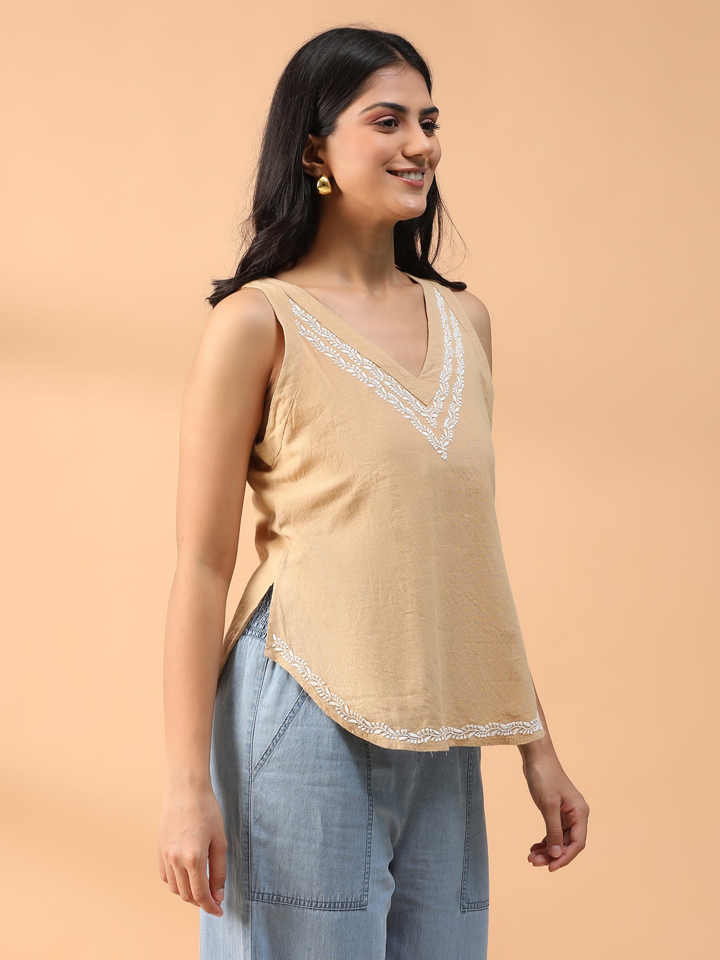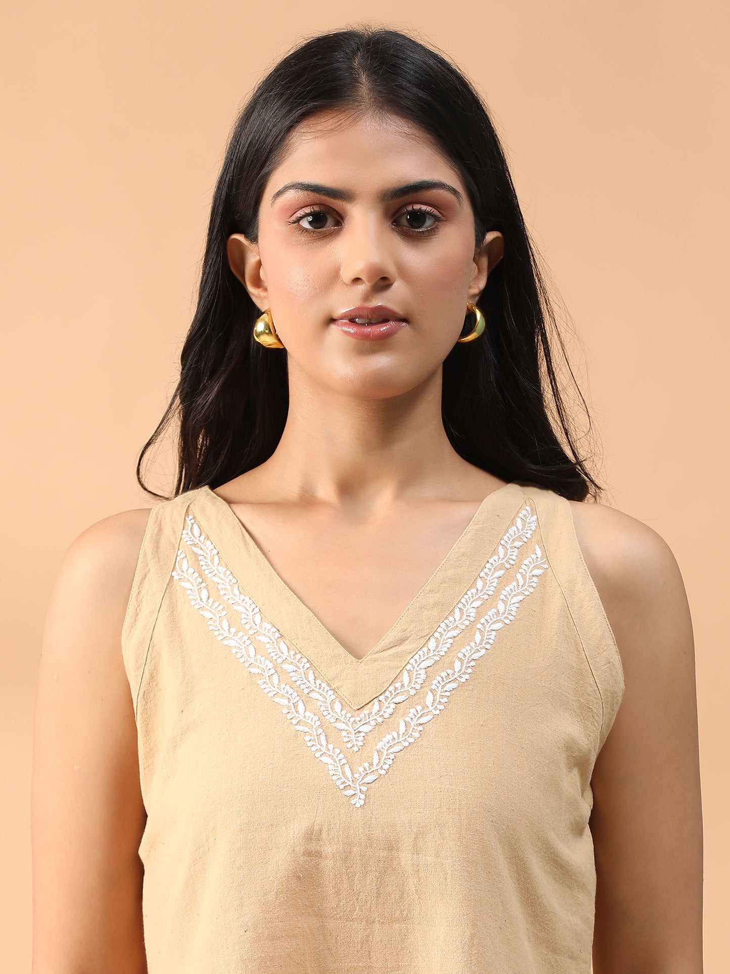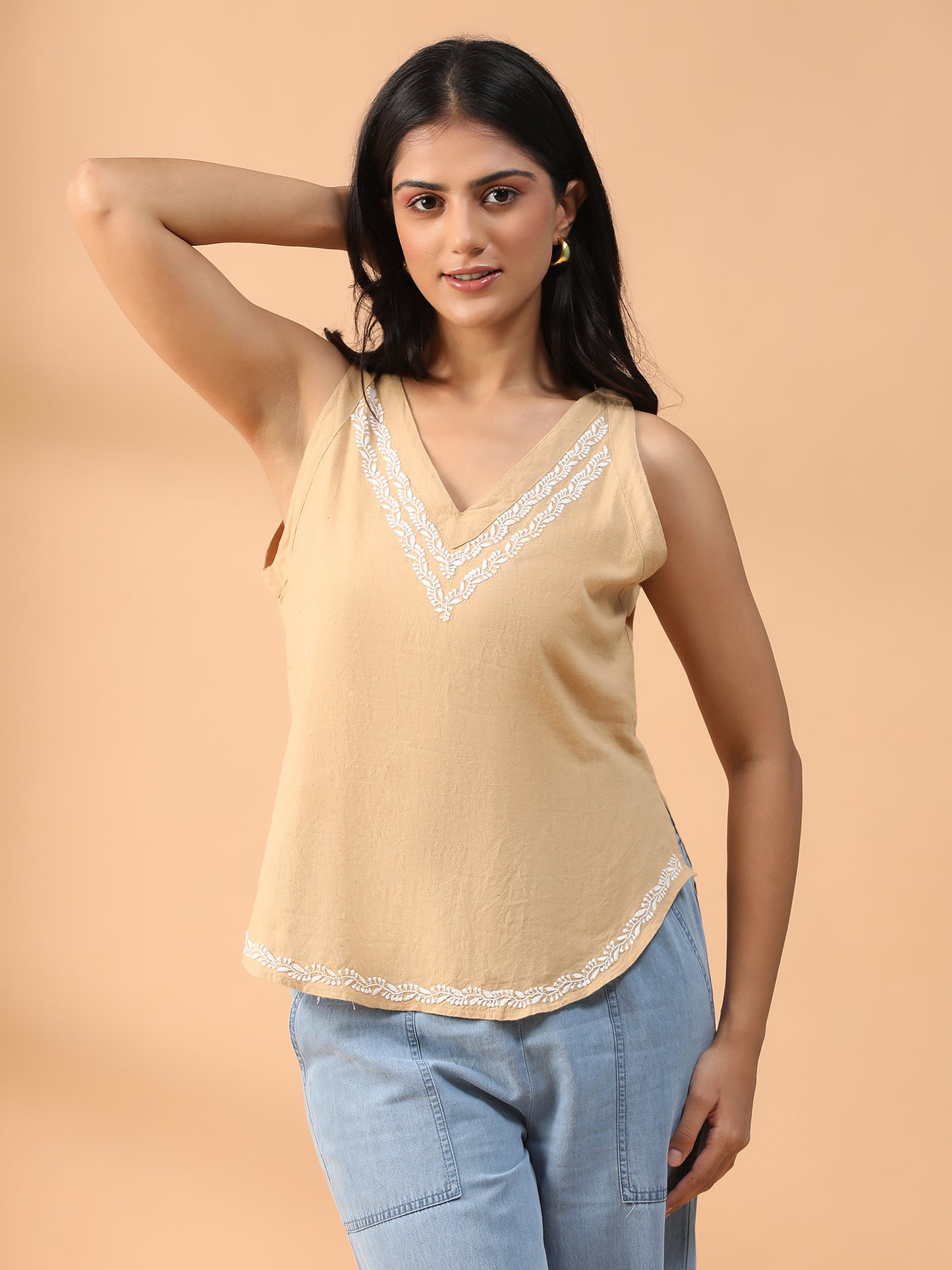 Hand Embroidered Beige Lucknowi Chikankari Khadi Cotton Short Top CH0291