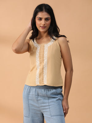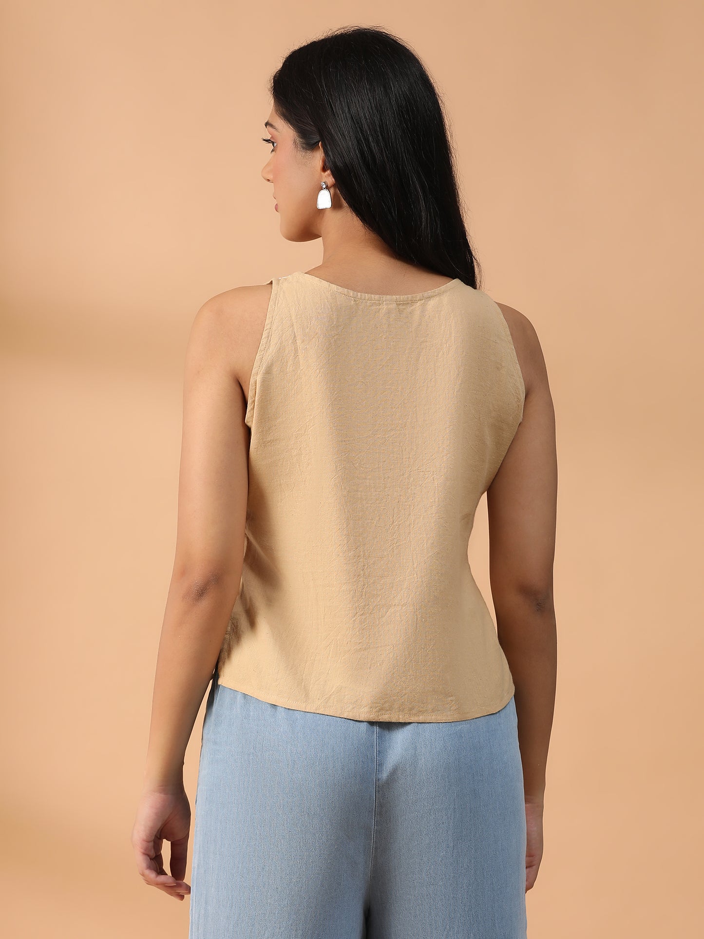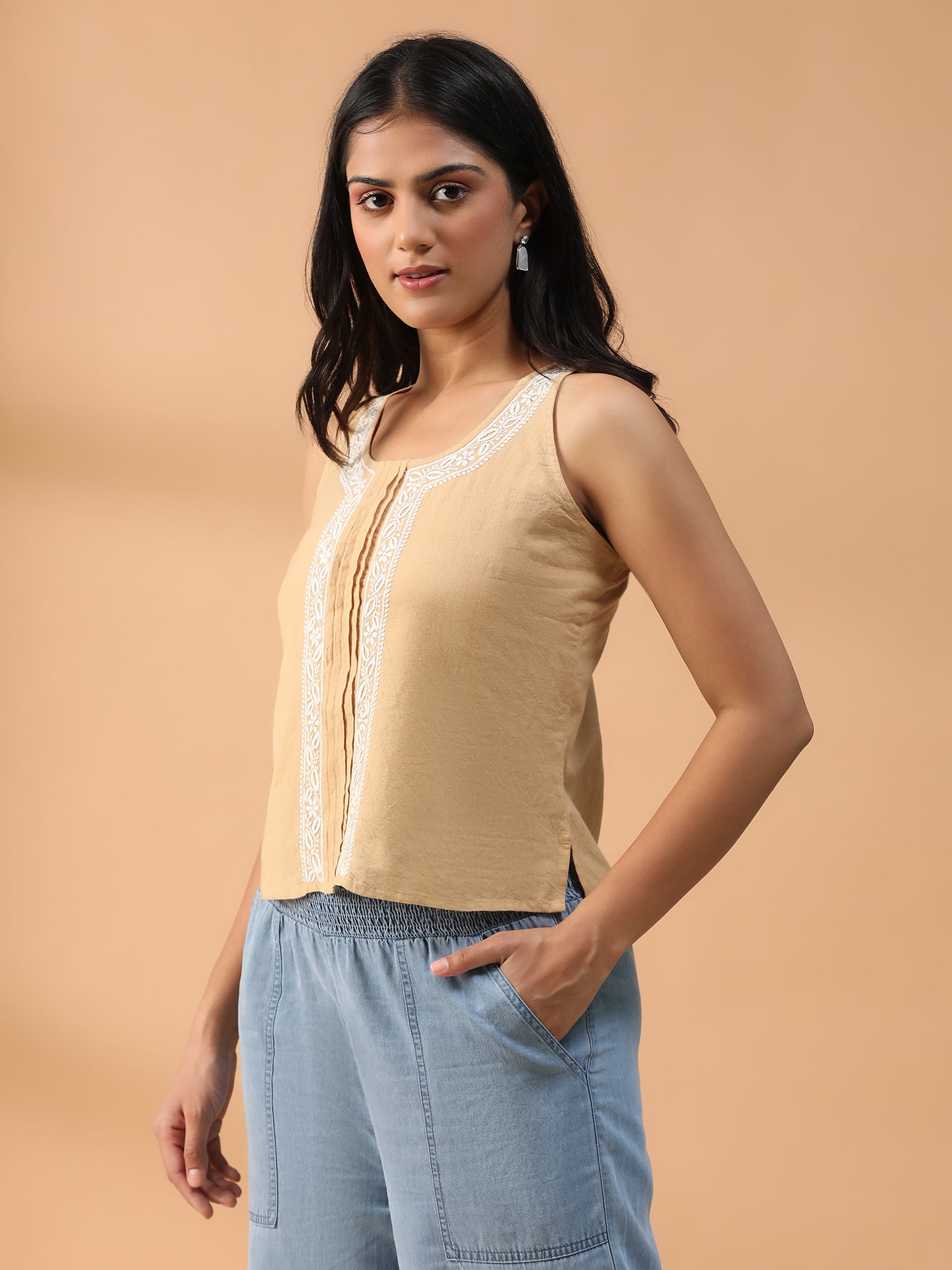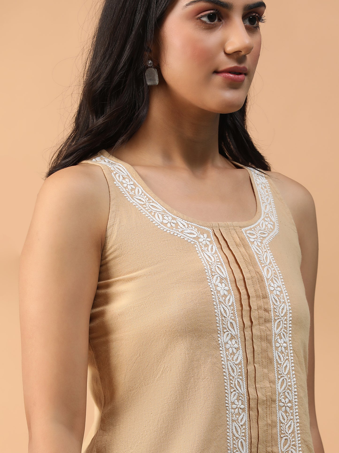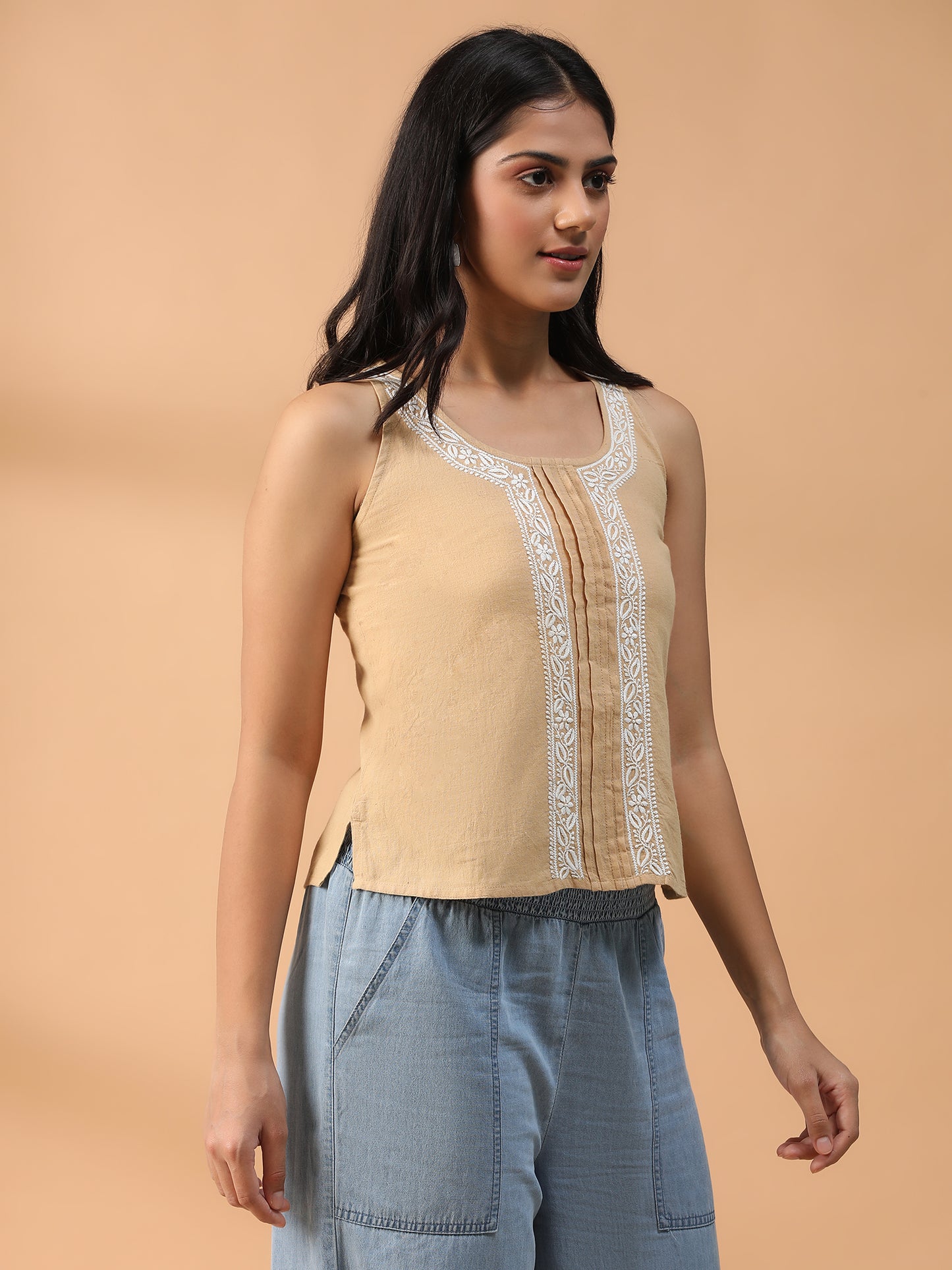 Hand Embroidered Beige Lucknowi Chikankari Khadi Cotton Crop Top CH0292