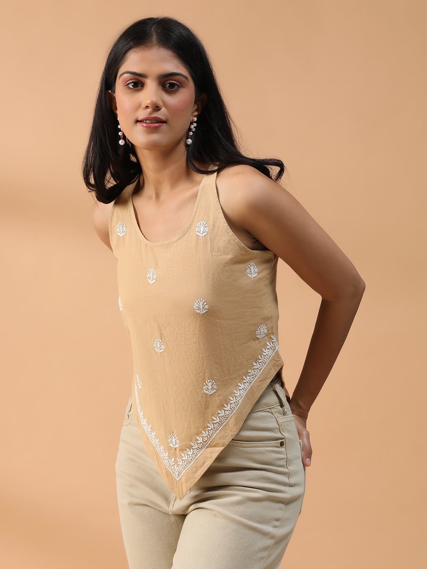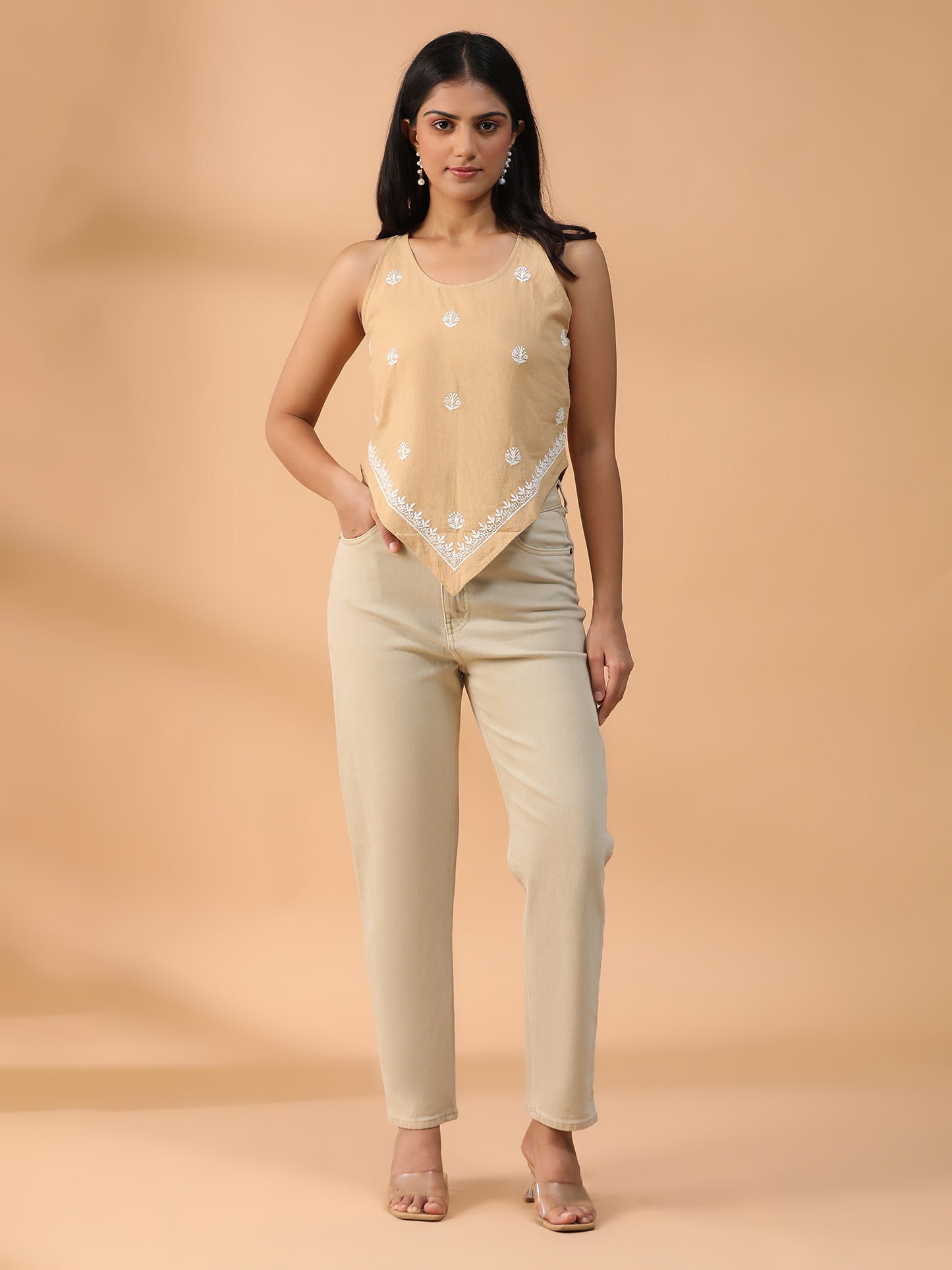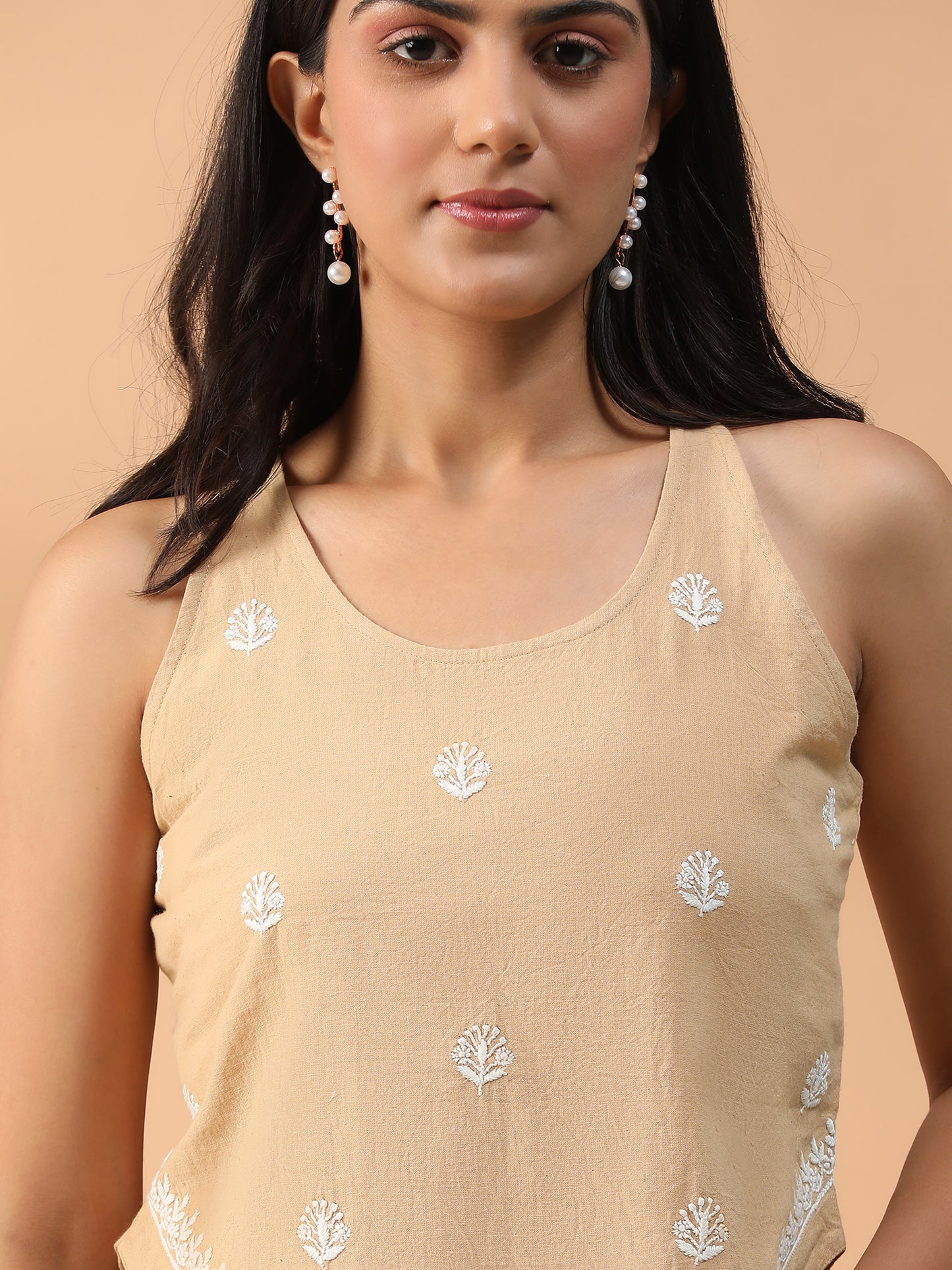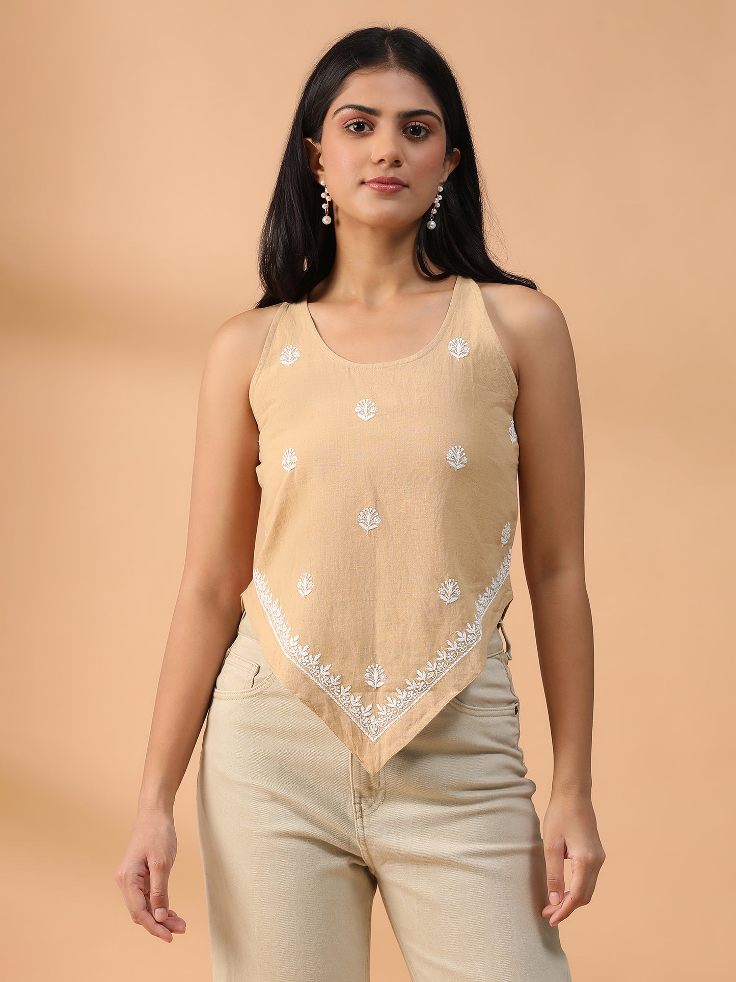 Hand Embroidered Beige Lucknowi Chikankari Khadi Cotton Short Top CH0294