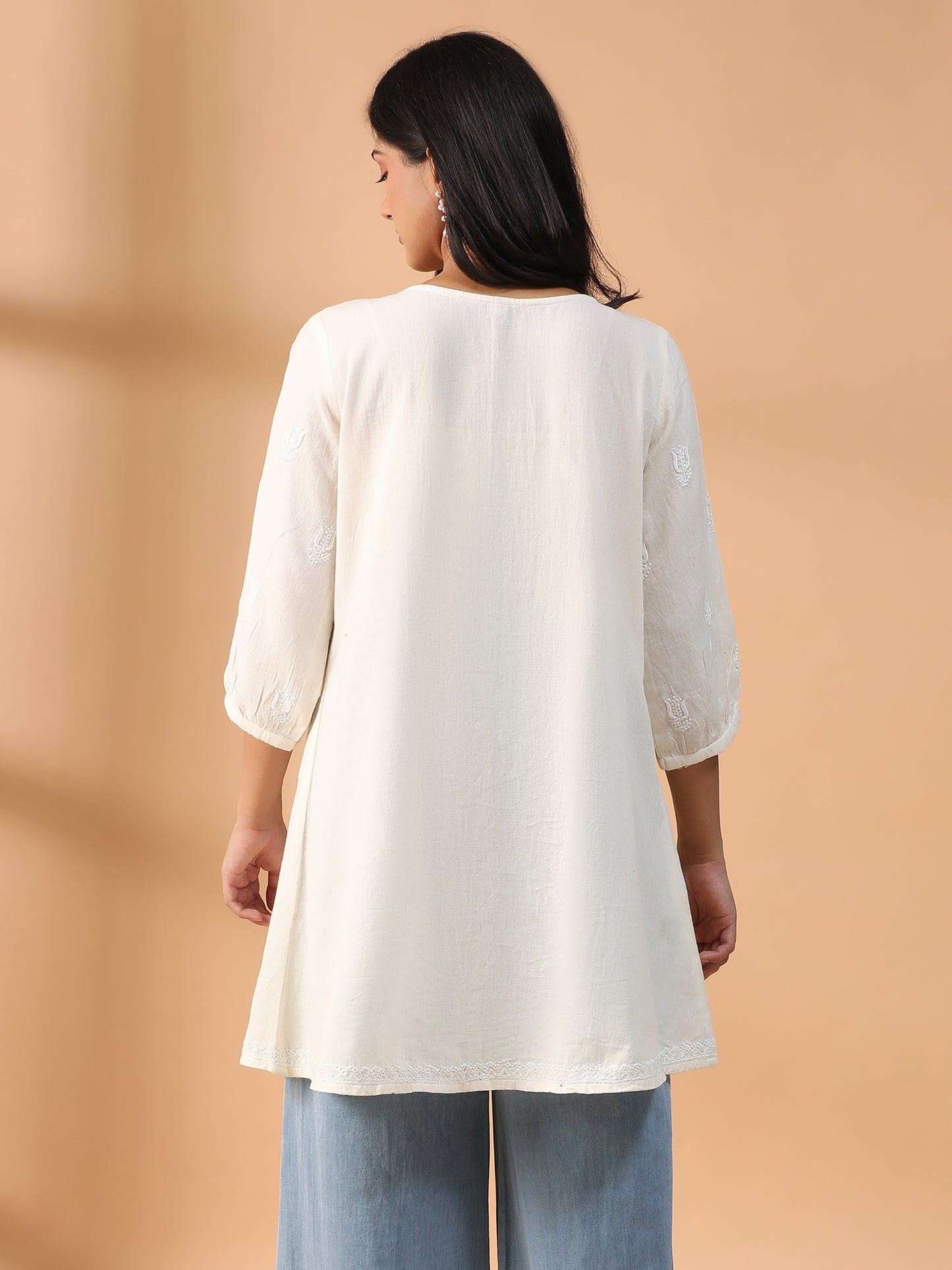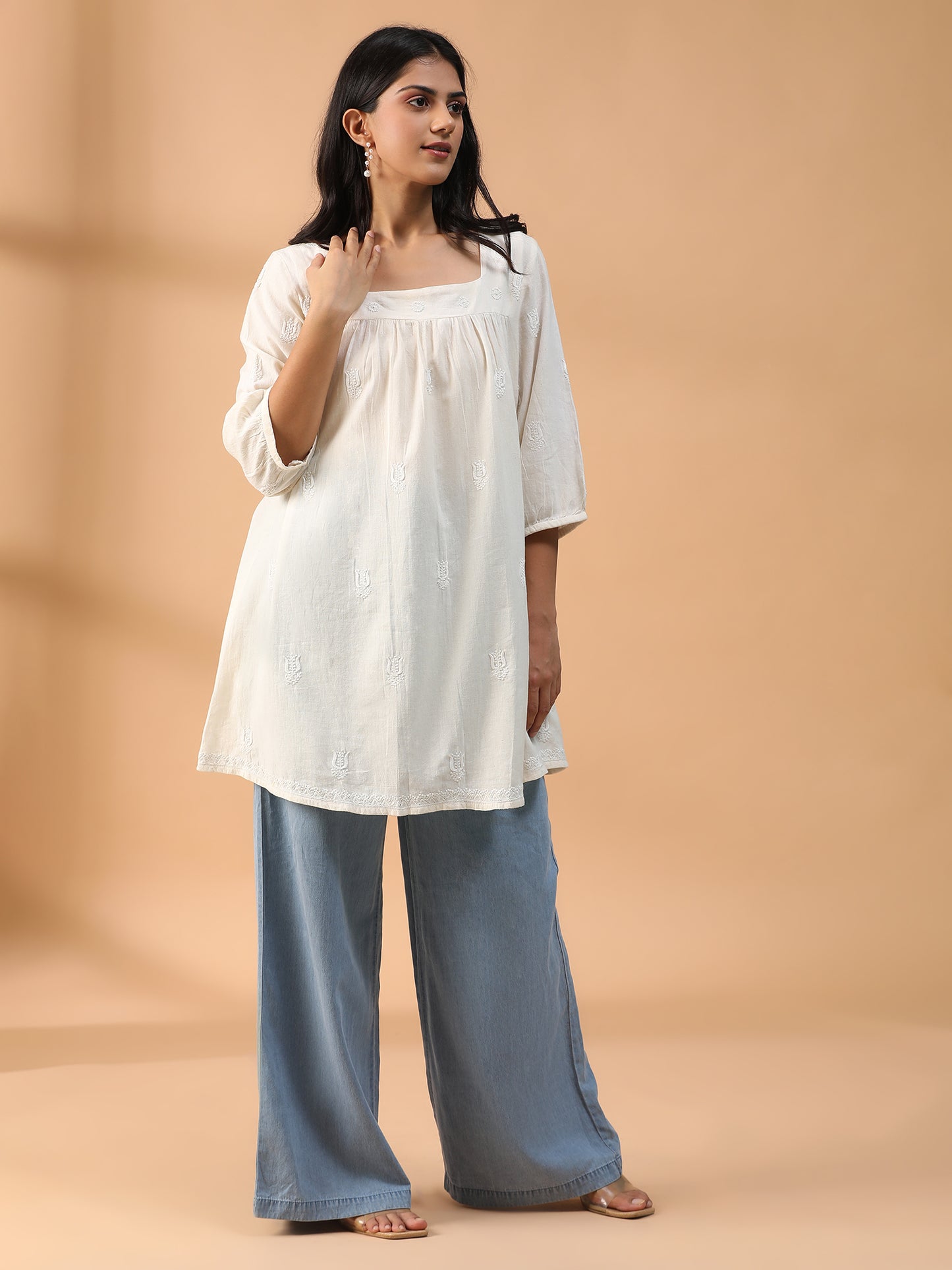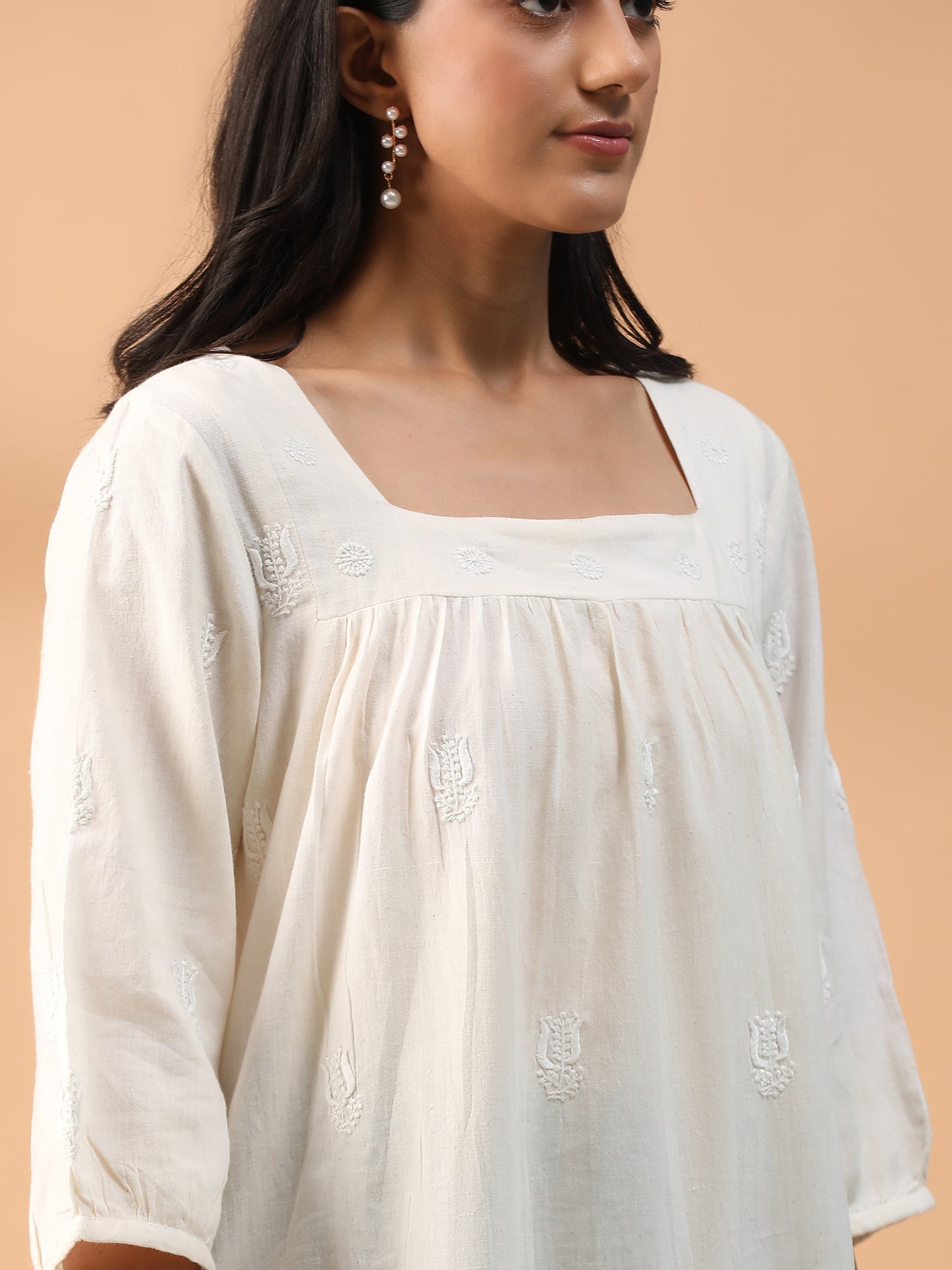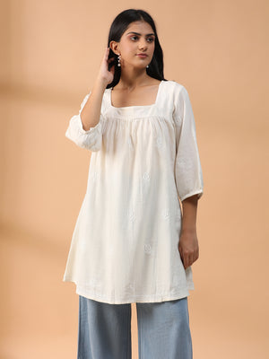 Hand Embroidered Natural White Lucknowi Chikankari Khadi Cotton Flared Top CH0297