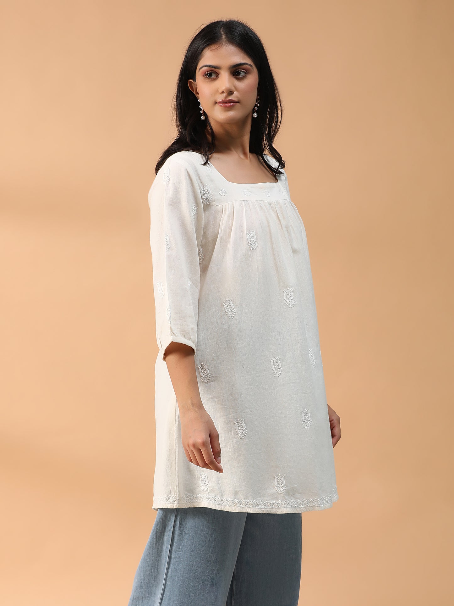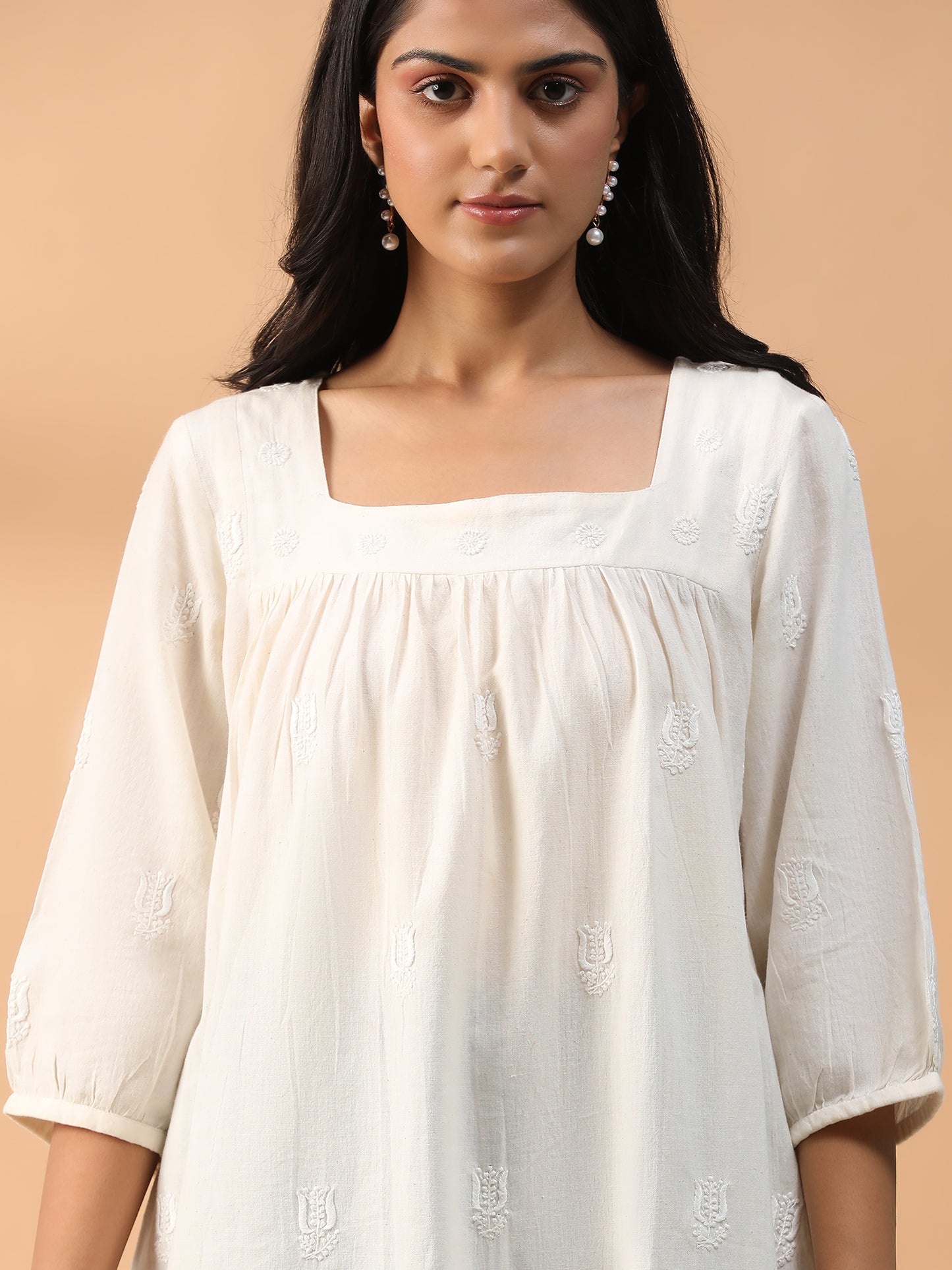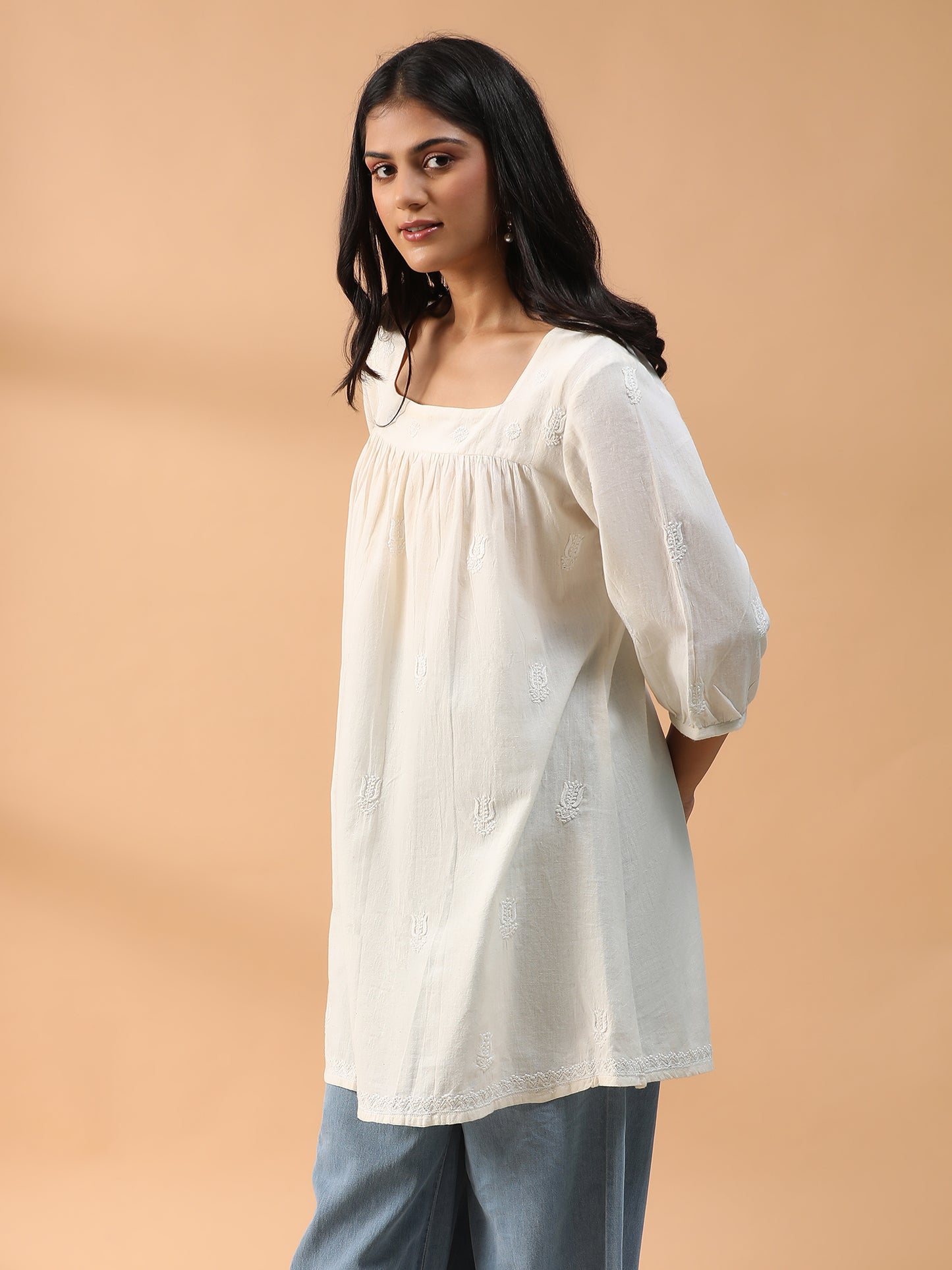 Hand Embroidered Natural White Lucknowi Chikankari Khadi Cotton Flared Top CH0297