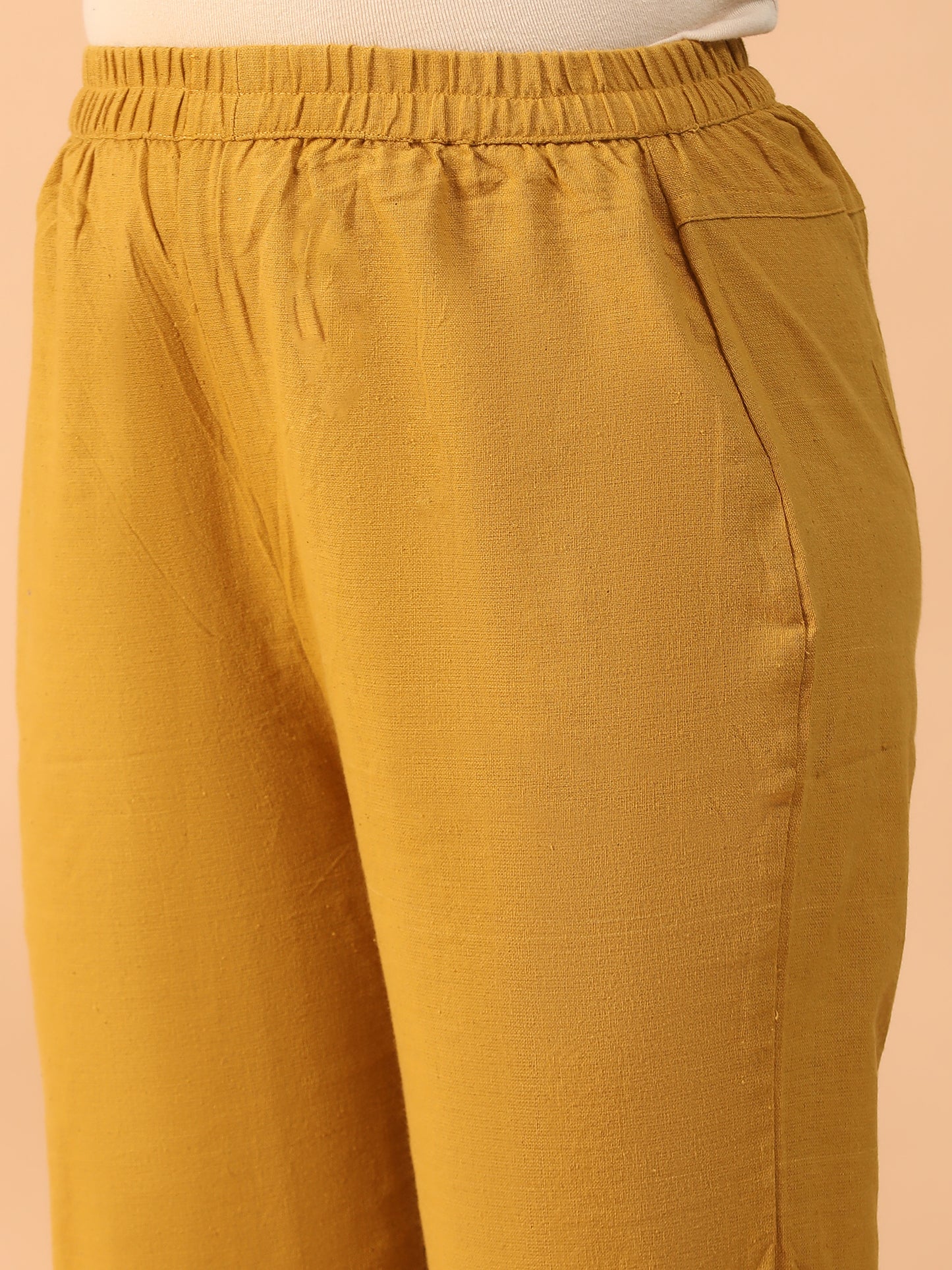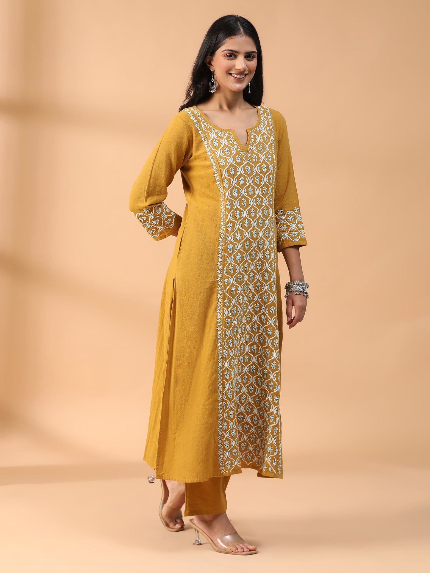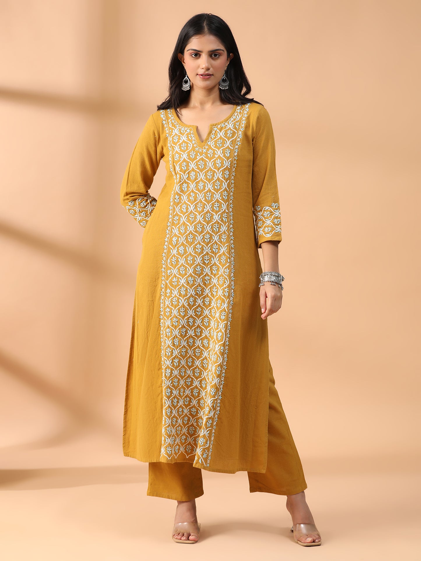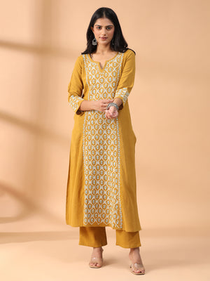 Hand Embroidered Mustard Colour Lucknowi Chikankari Khadi Cotton A-Line Kurta With Pant Set CH0305