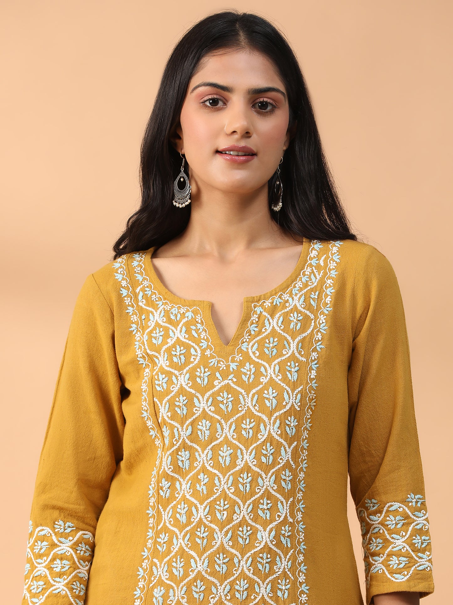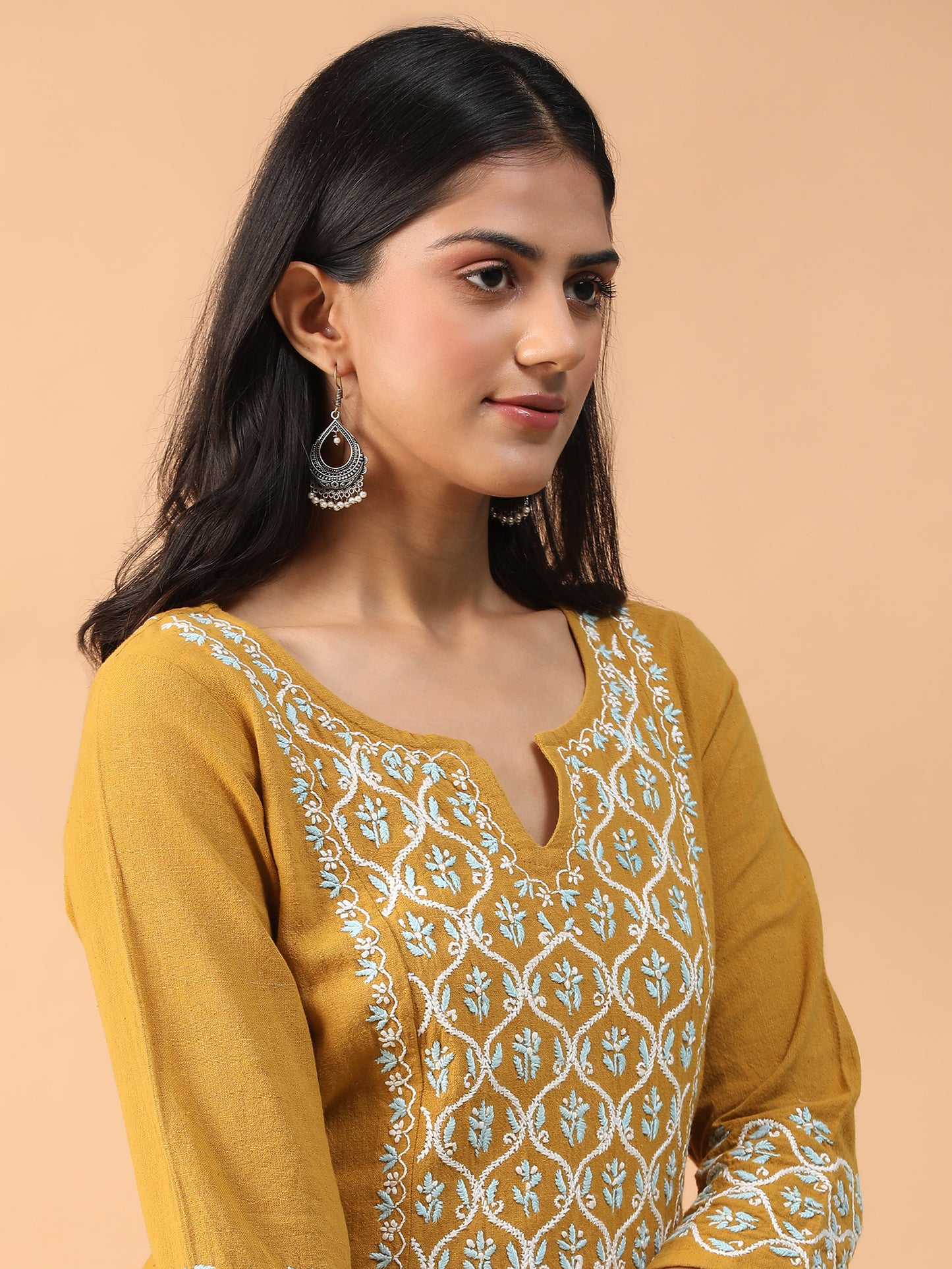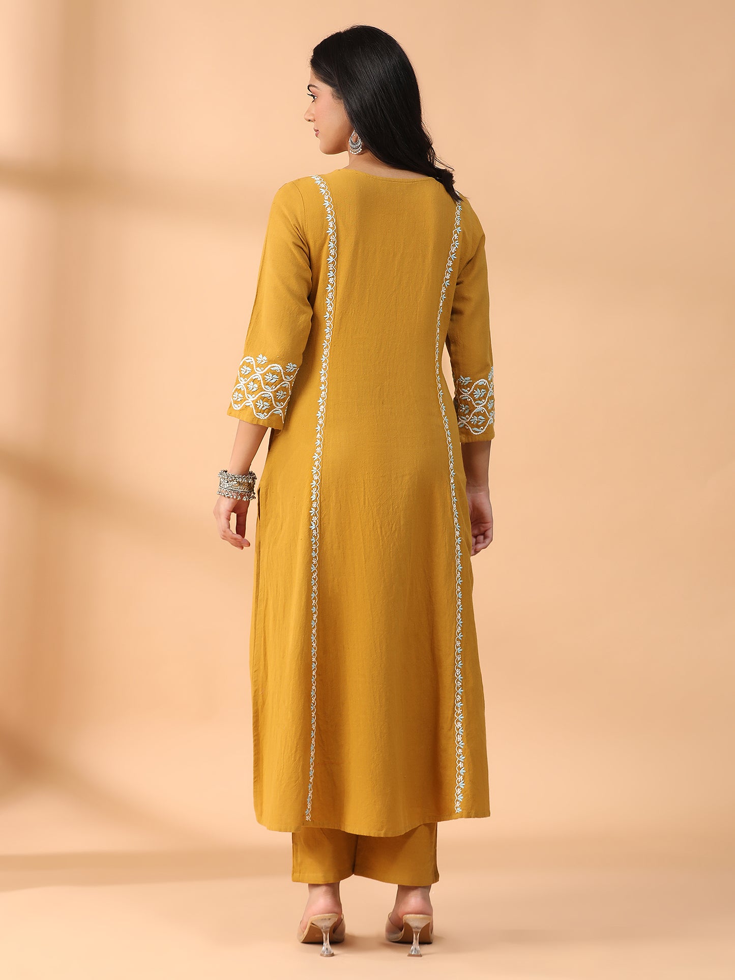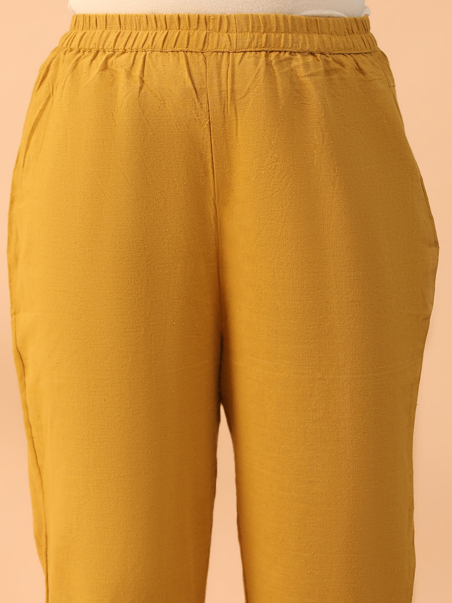 Hand Embroidered Mustard Colour Lucknowi Chikankari Khadi Cotton A-Line Kurta With Pant Set CH0305