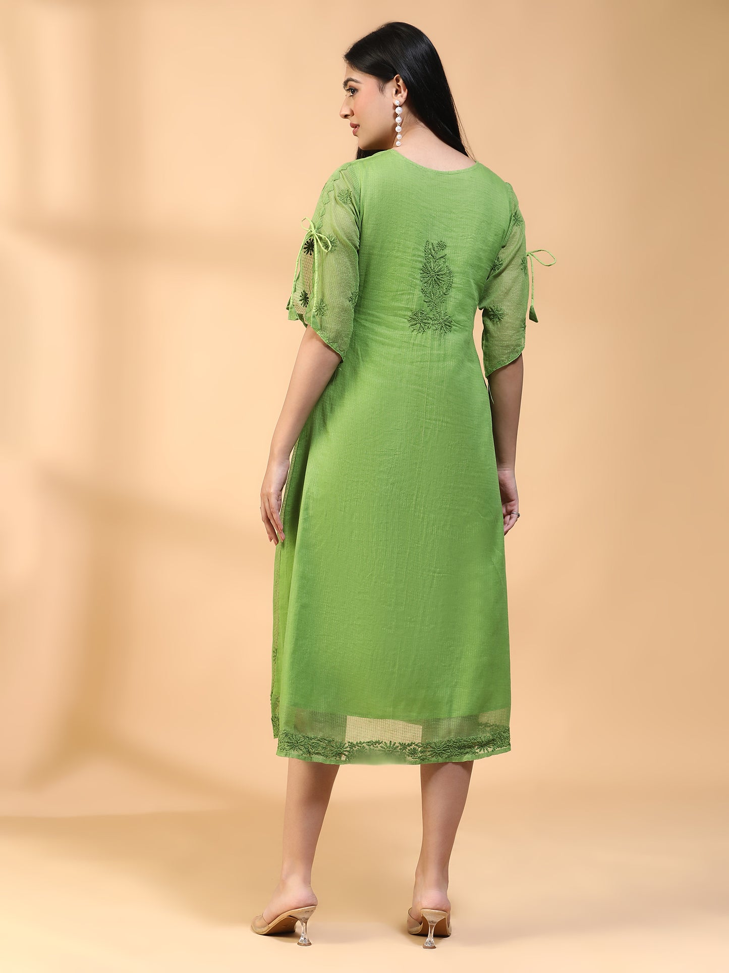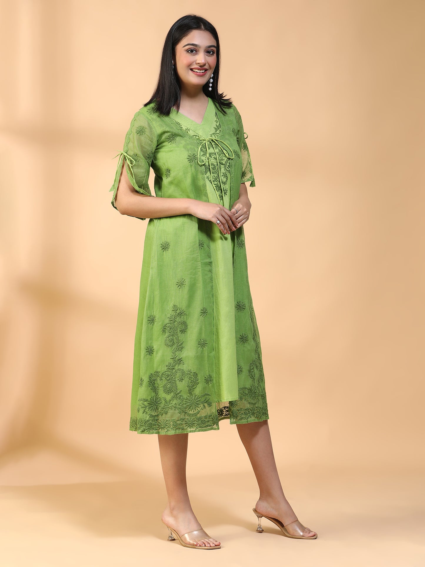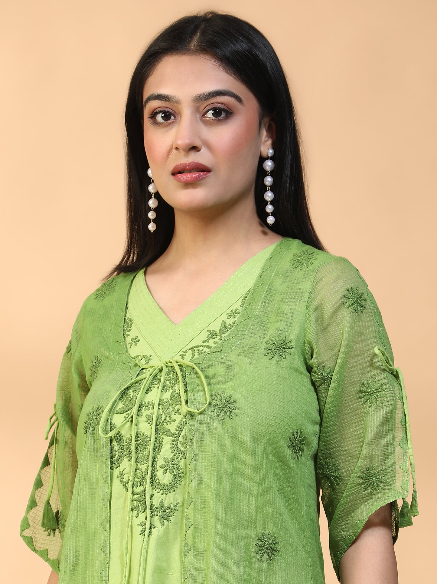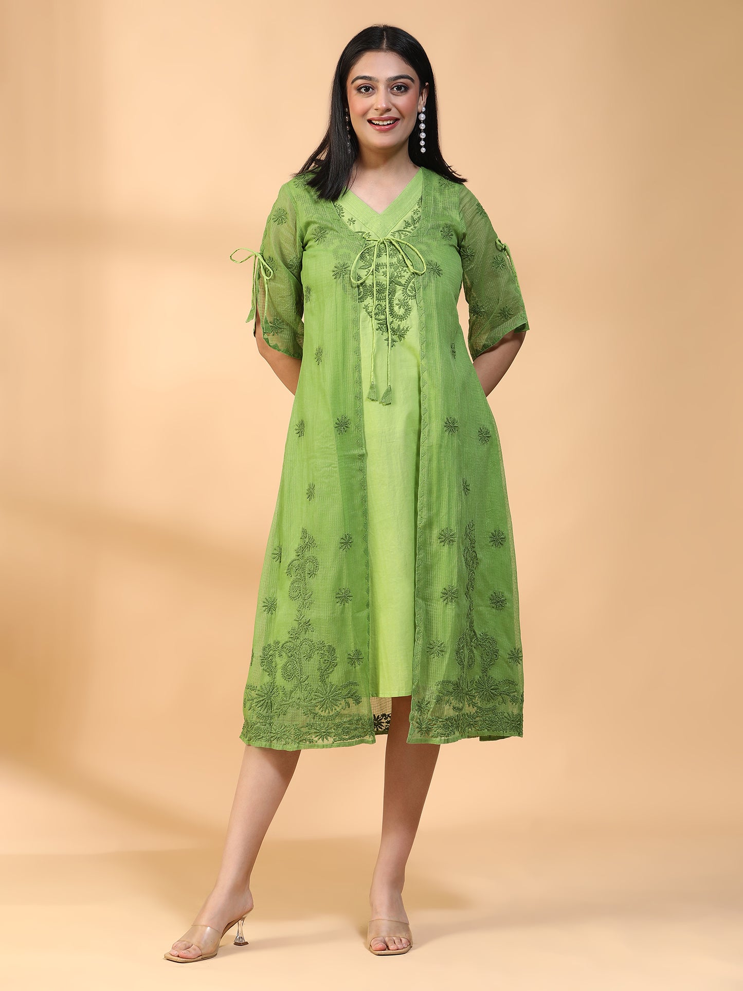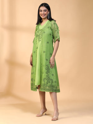 Hand Embroidered Green Cotton Lucknowi Chikankari A-line Kurta with Attached Jacket CH0012