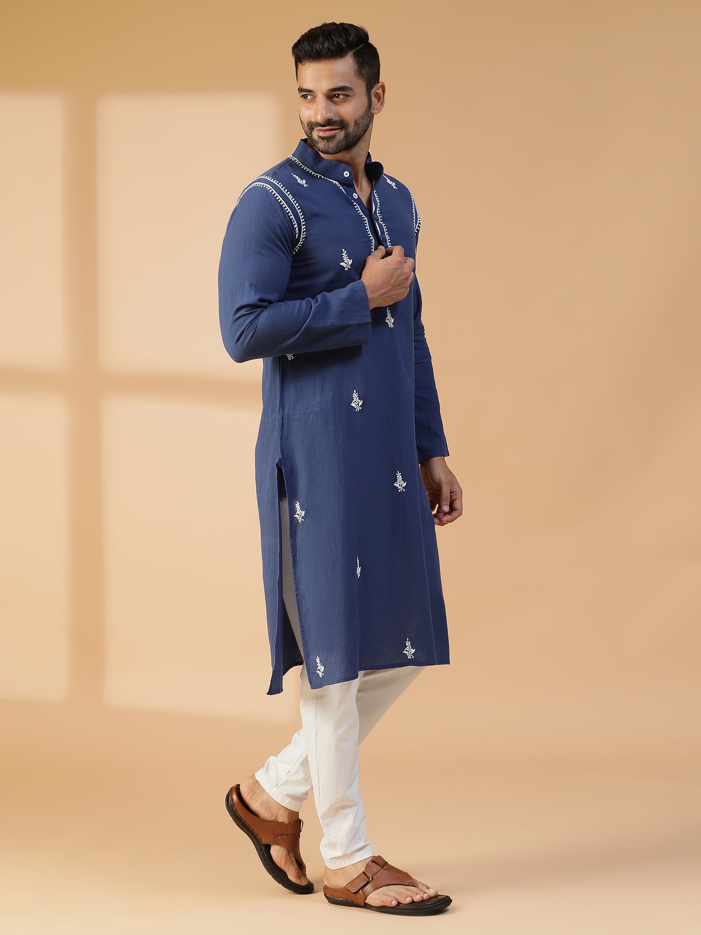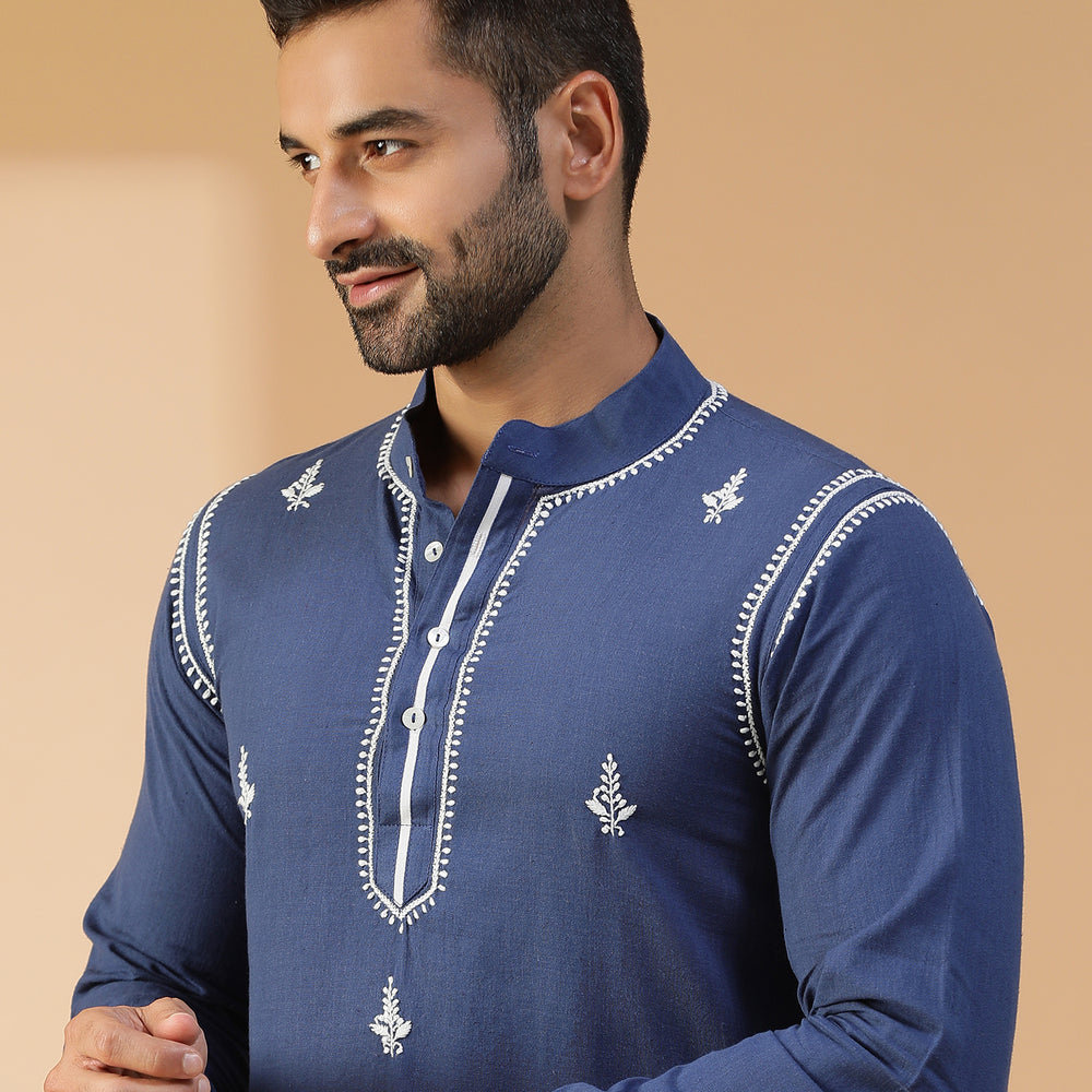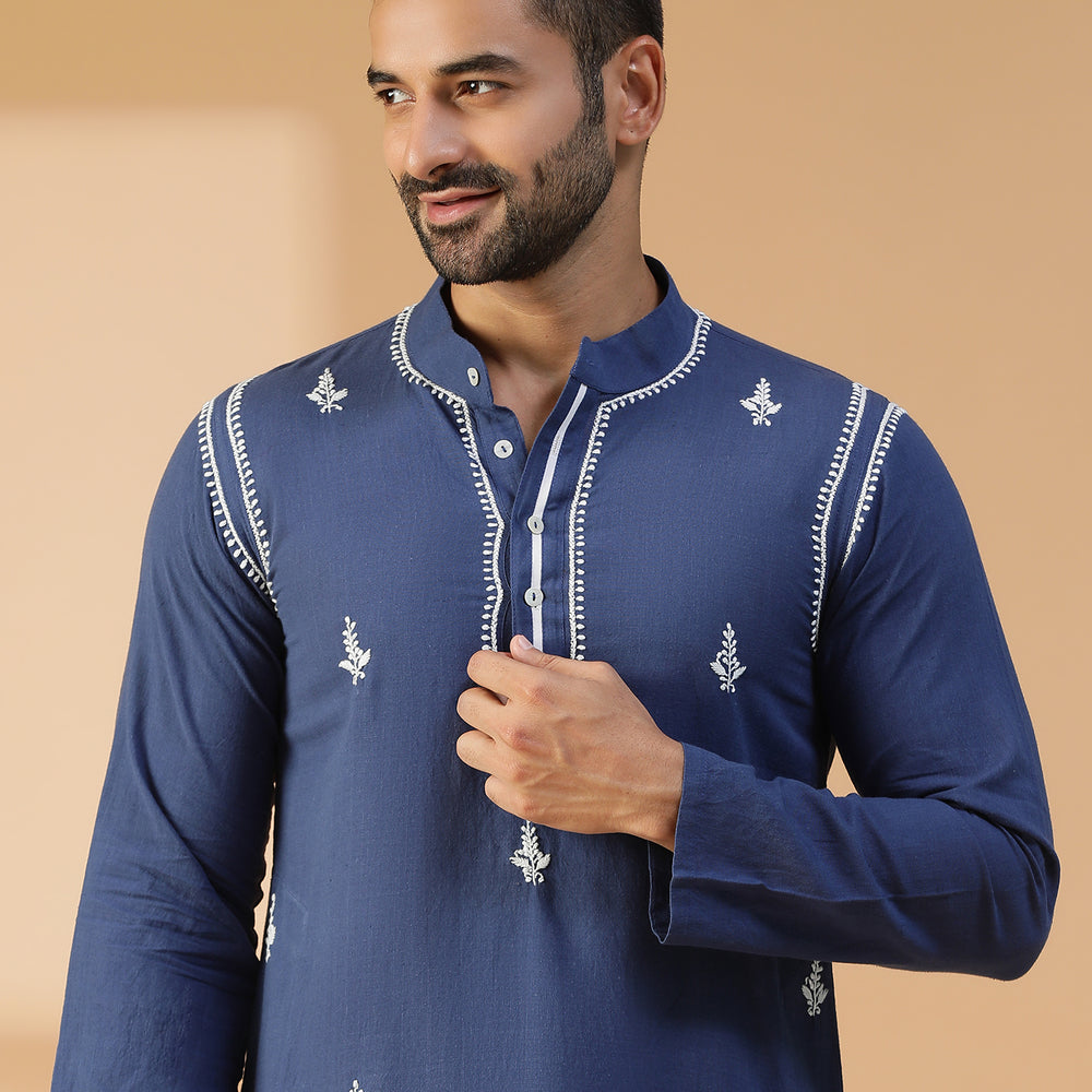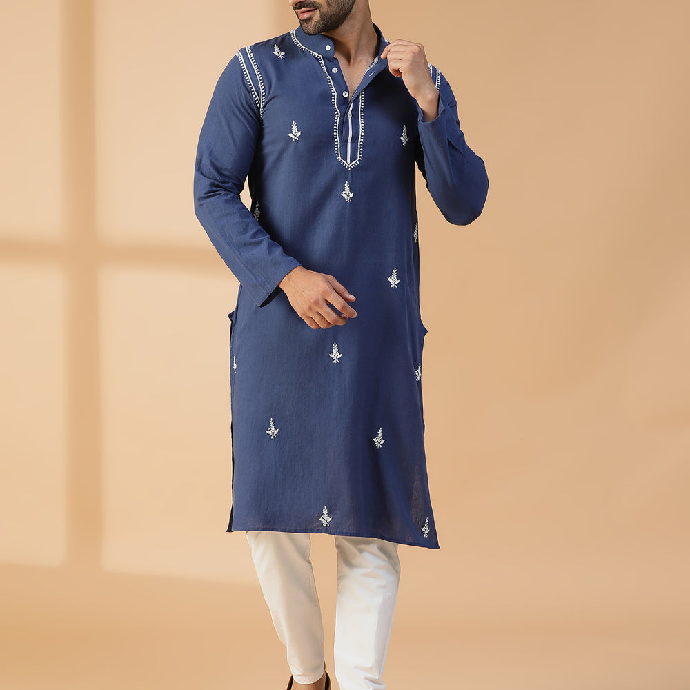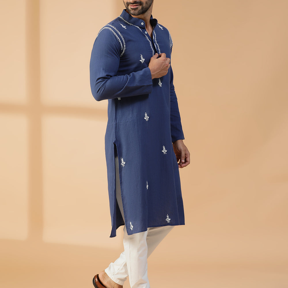 Hand Embroidered Indigo Lucknowi Chikankari Cotton A-Line Men's Kurta CH0301