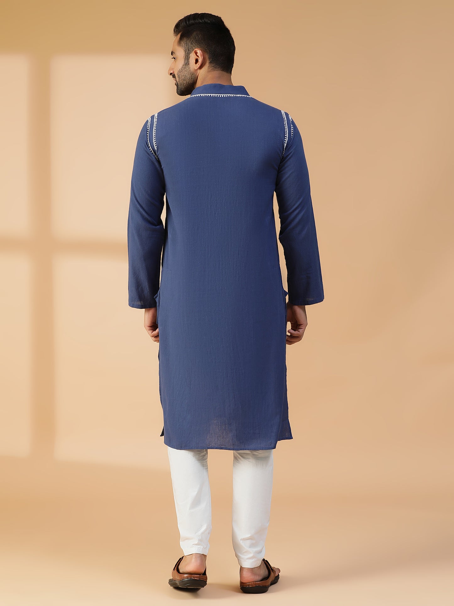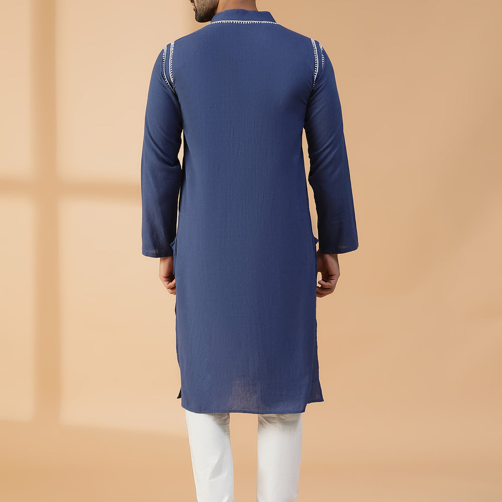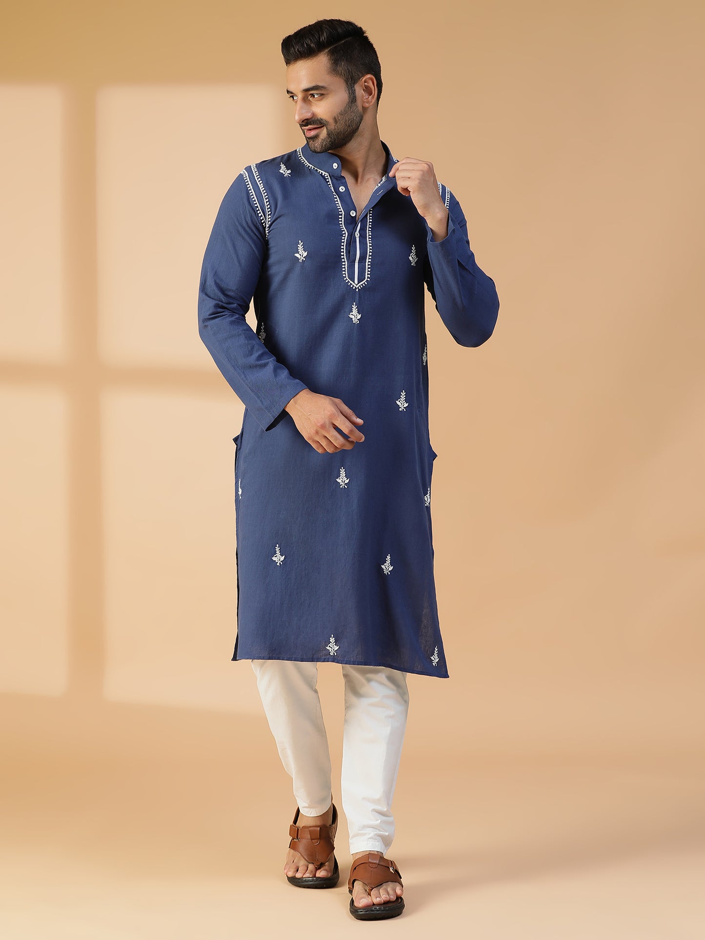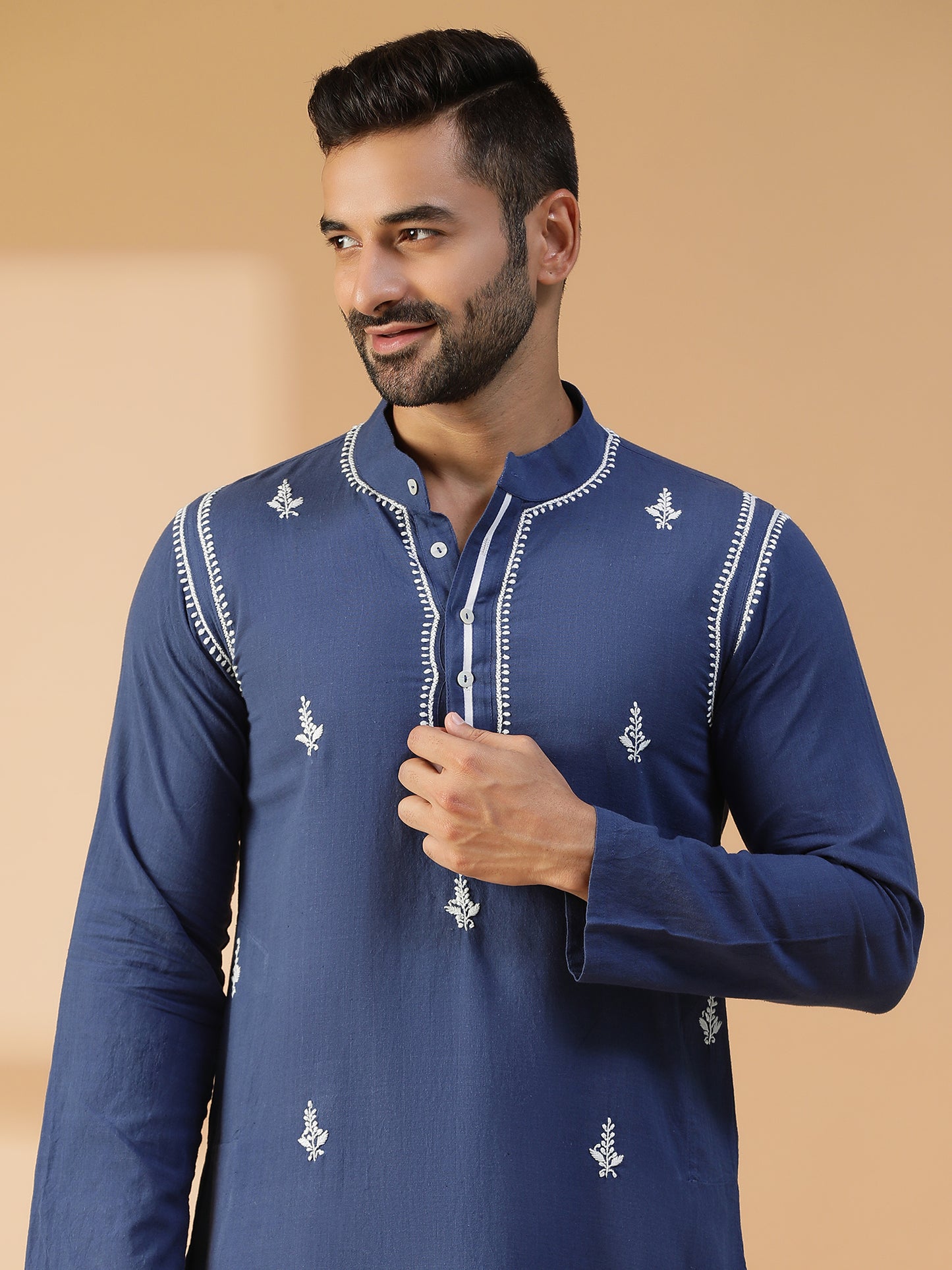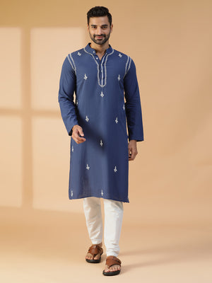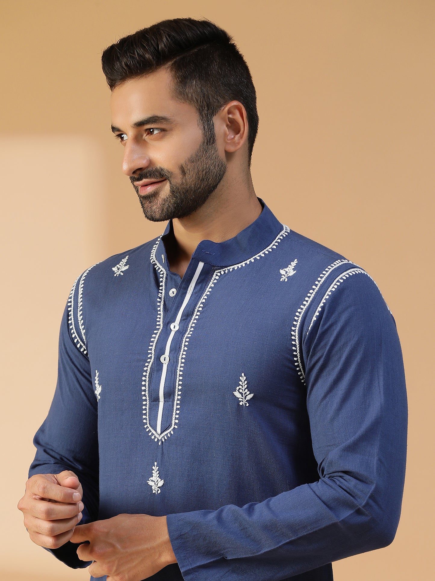 Hand Embroidered Indigo Lucknowi Chikankari Cotton A-Line Men's Kurta CH0301