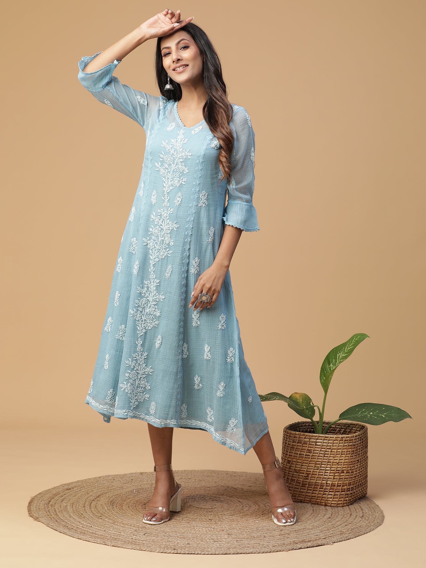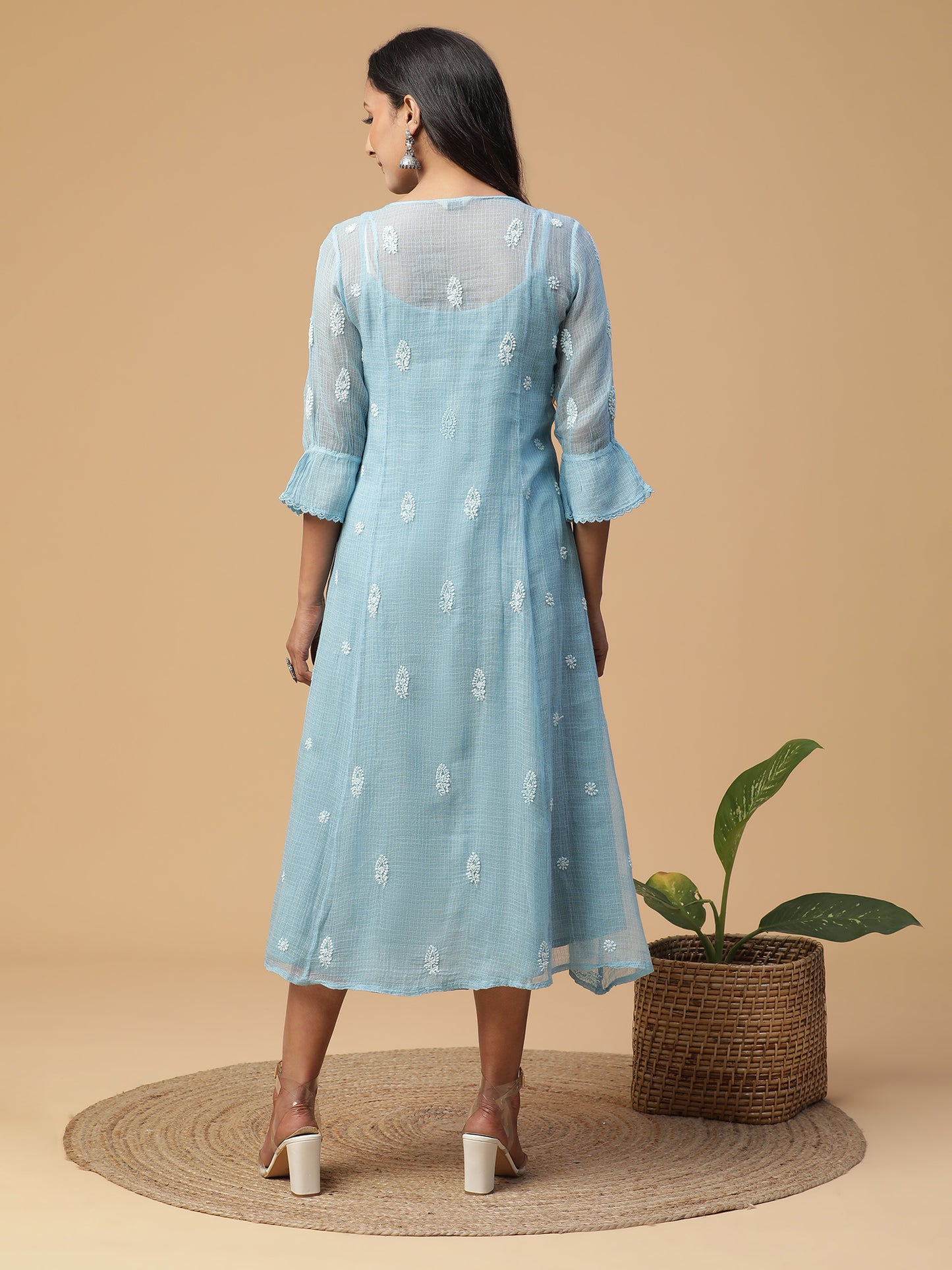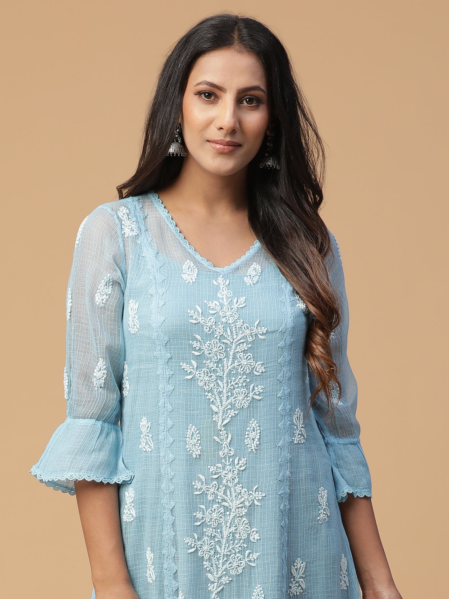 Hand Embroidered Powder Blue Lucknow Chikankari A-line Kota Doria kurta with Applique work CH0053NA