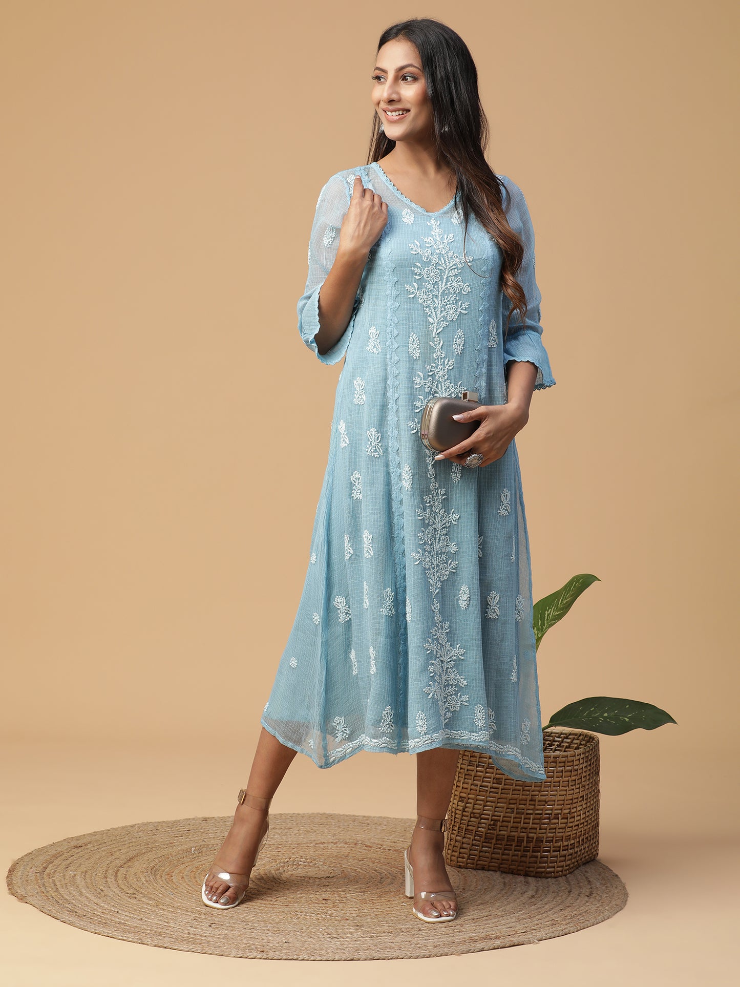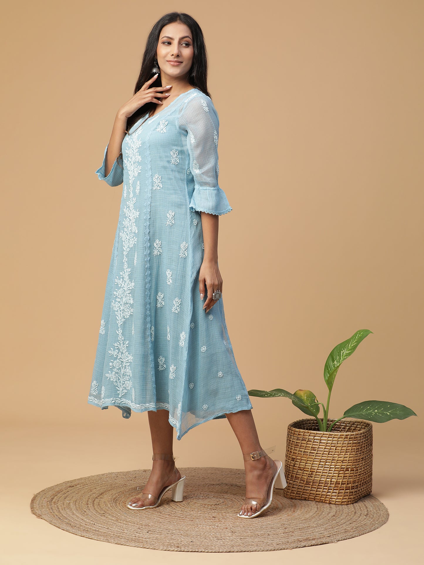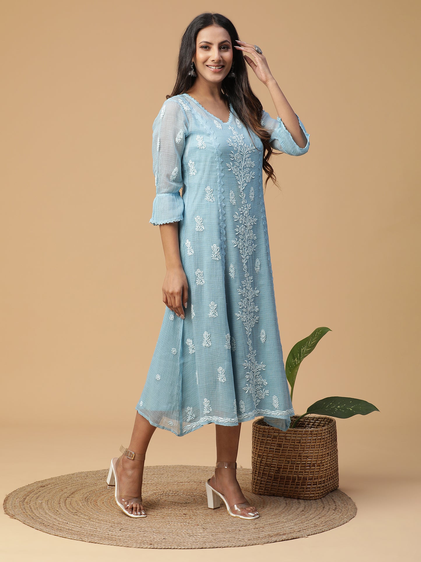 Hand Embroidered Powder Blue Lucknow Chikankari A-line Kota Doria kurta with Applique work CH0053NA