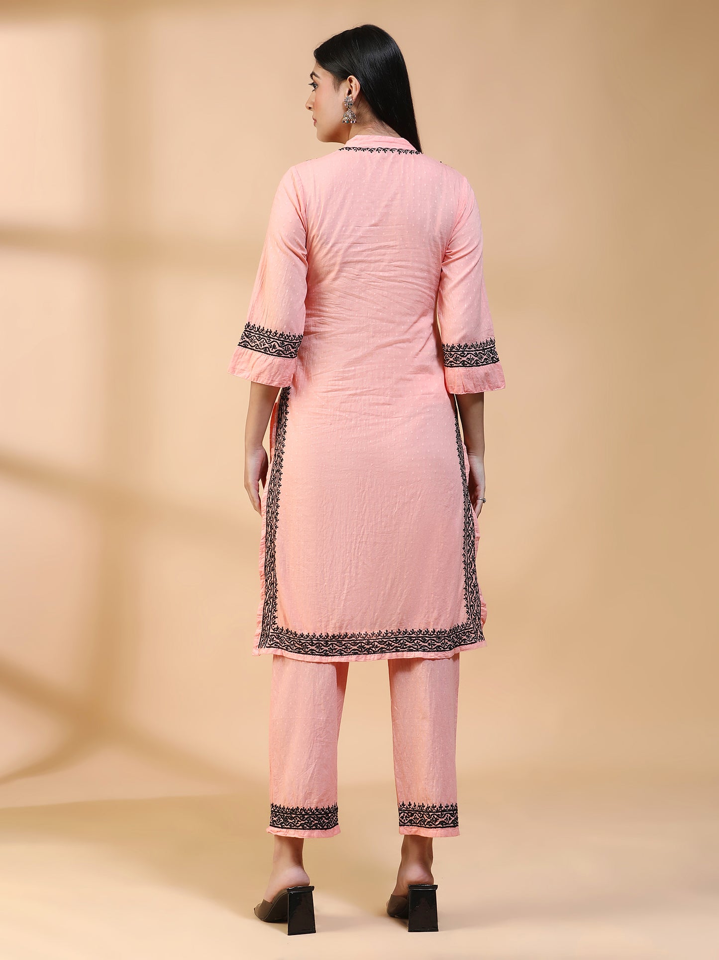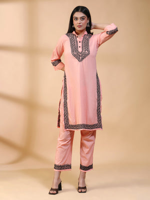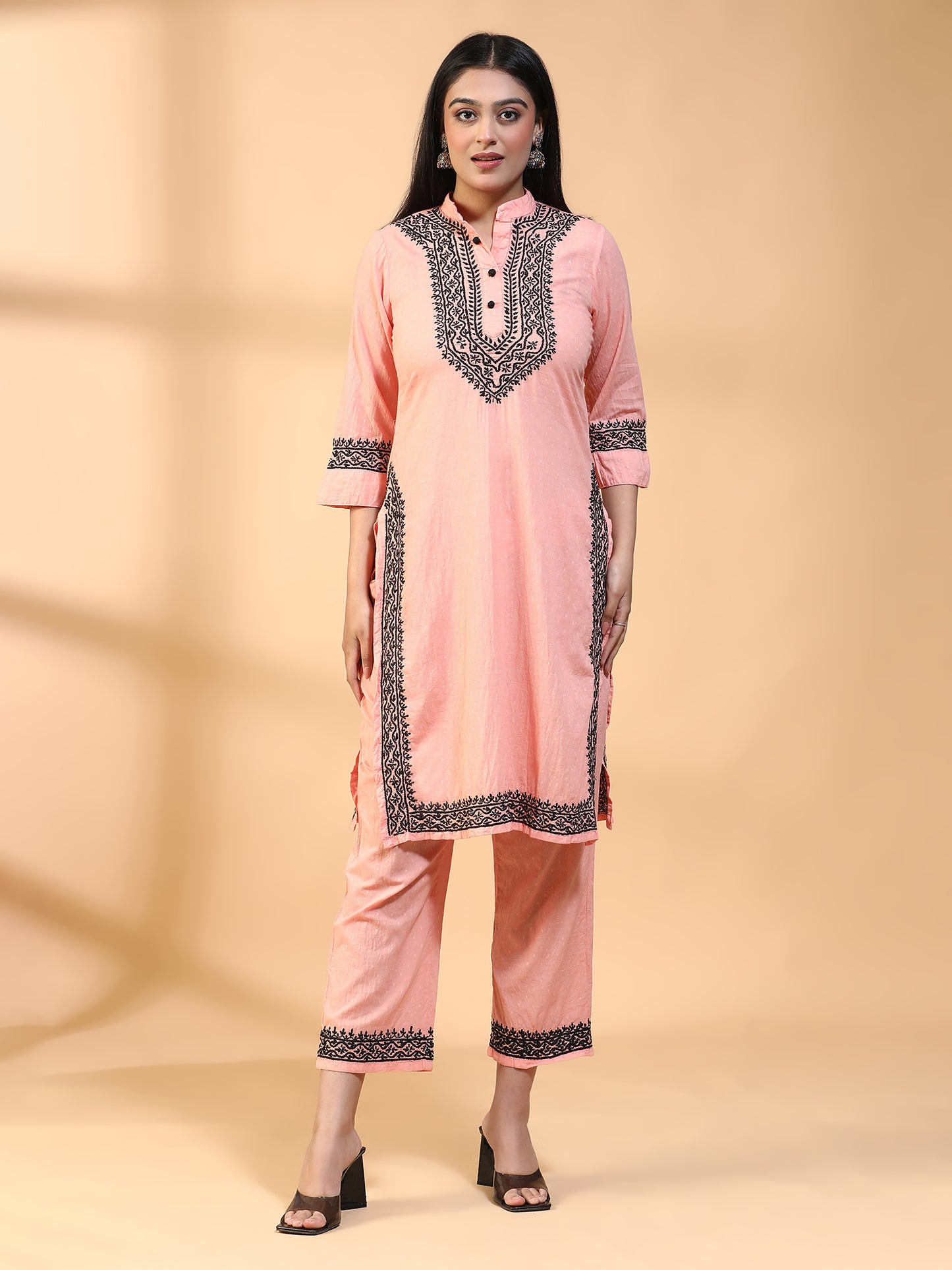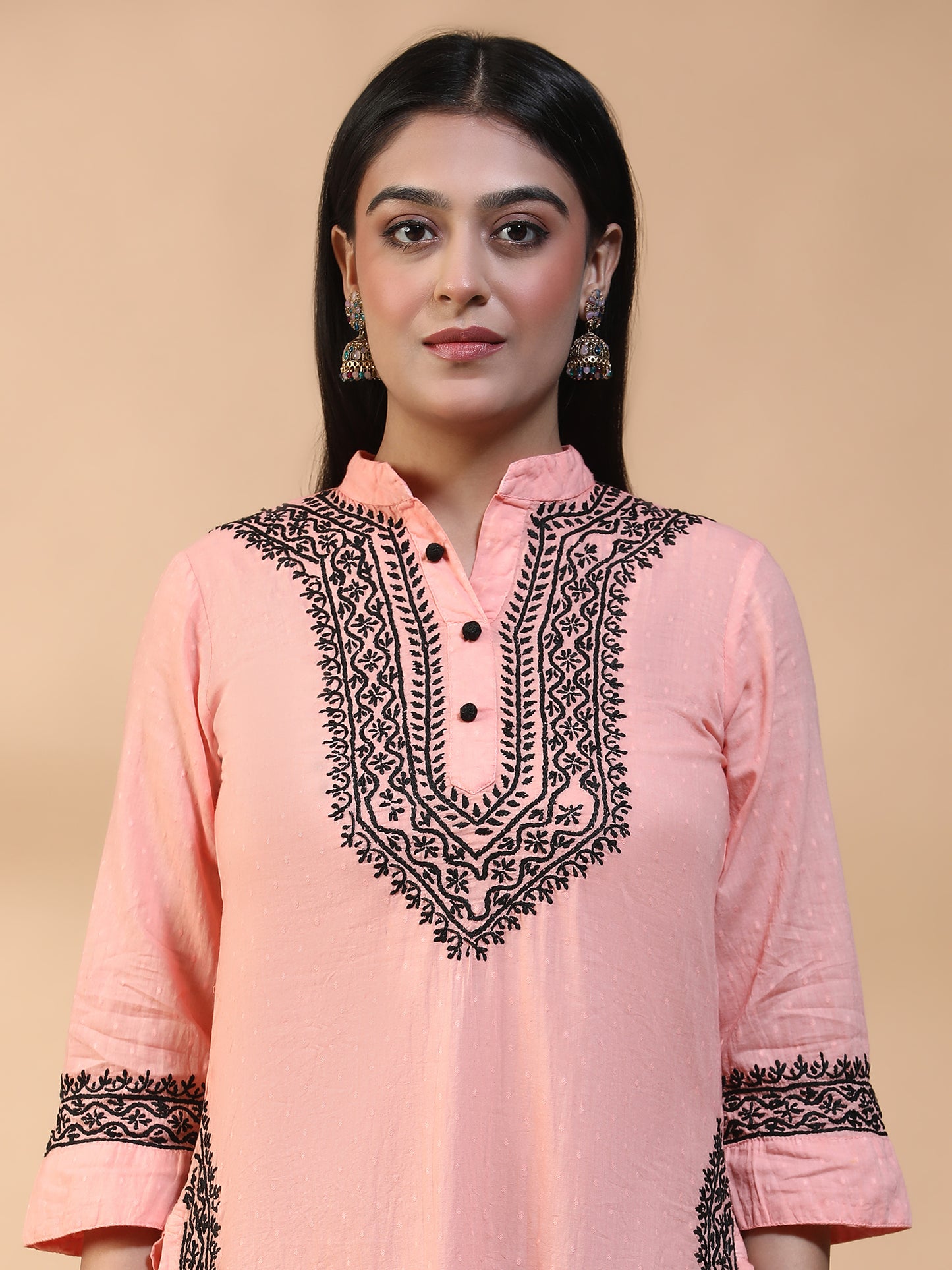Hand Embroidered Cotton Dobby Lucknow Chikankari Peach Kurta Set With Mandarin Collar PECH0215
