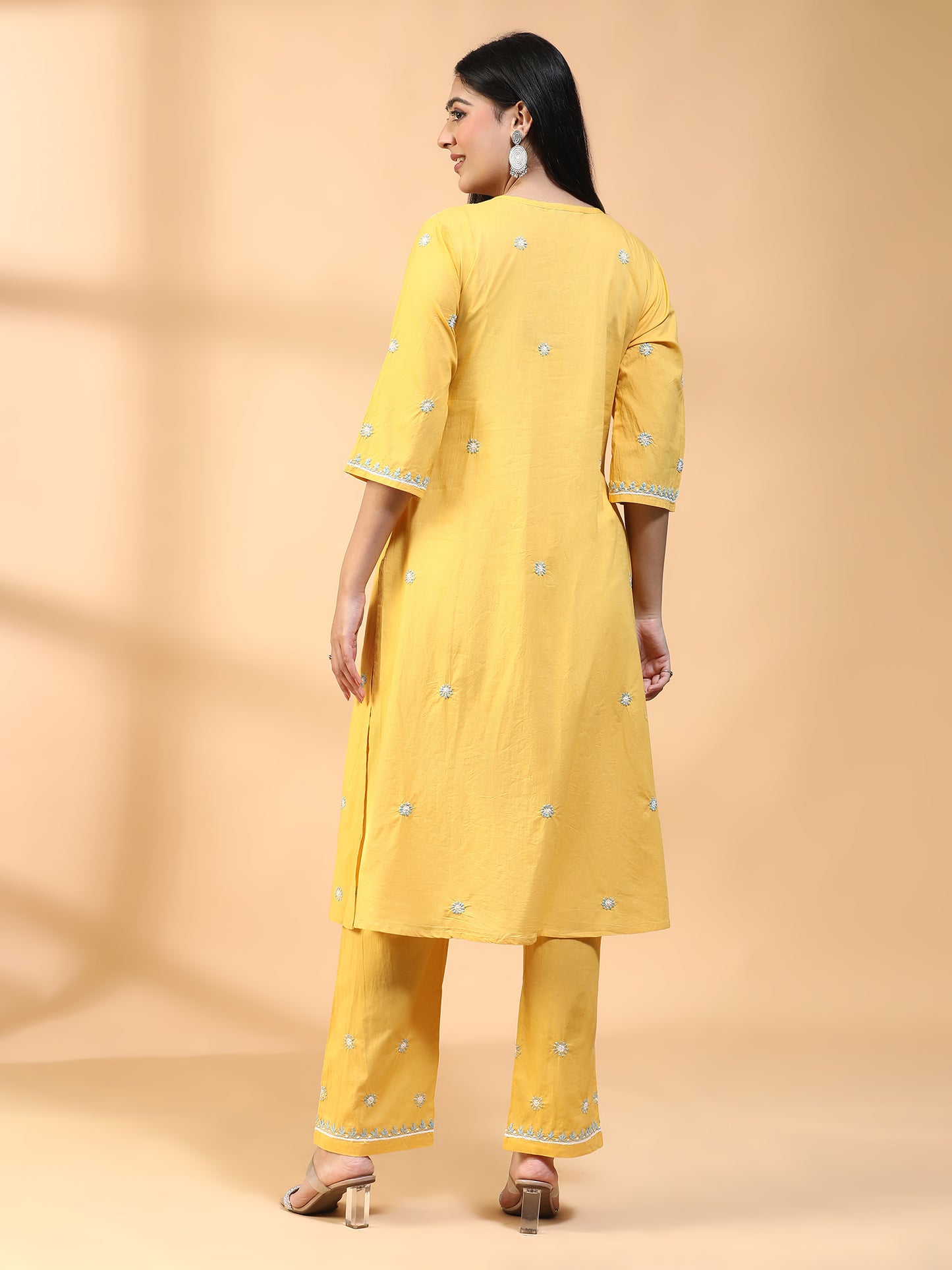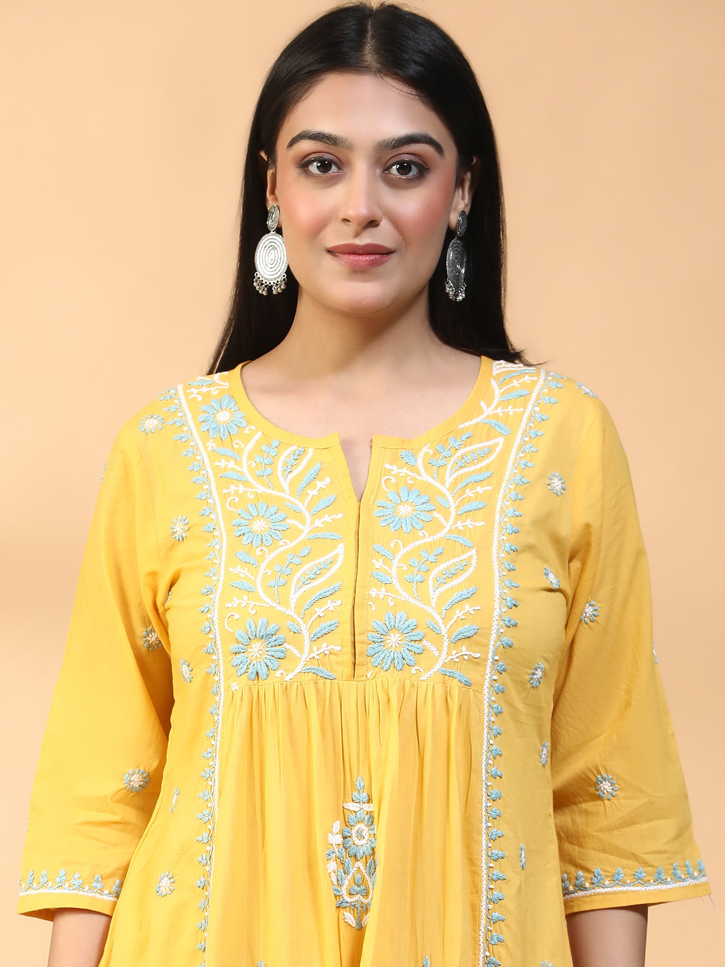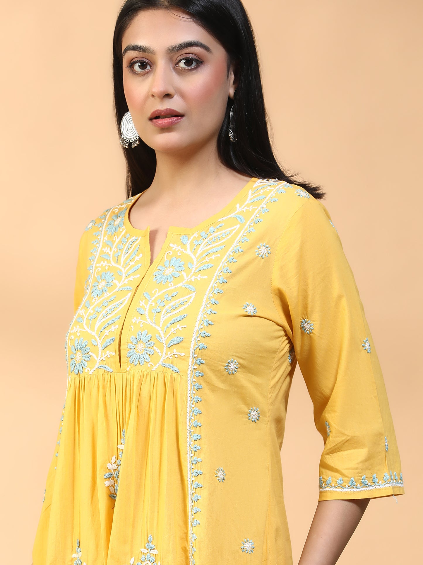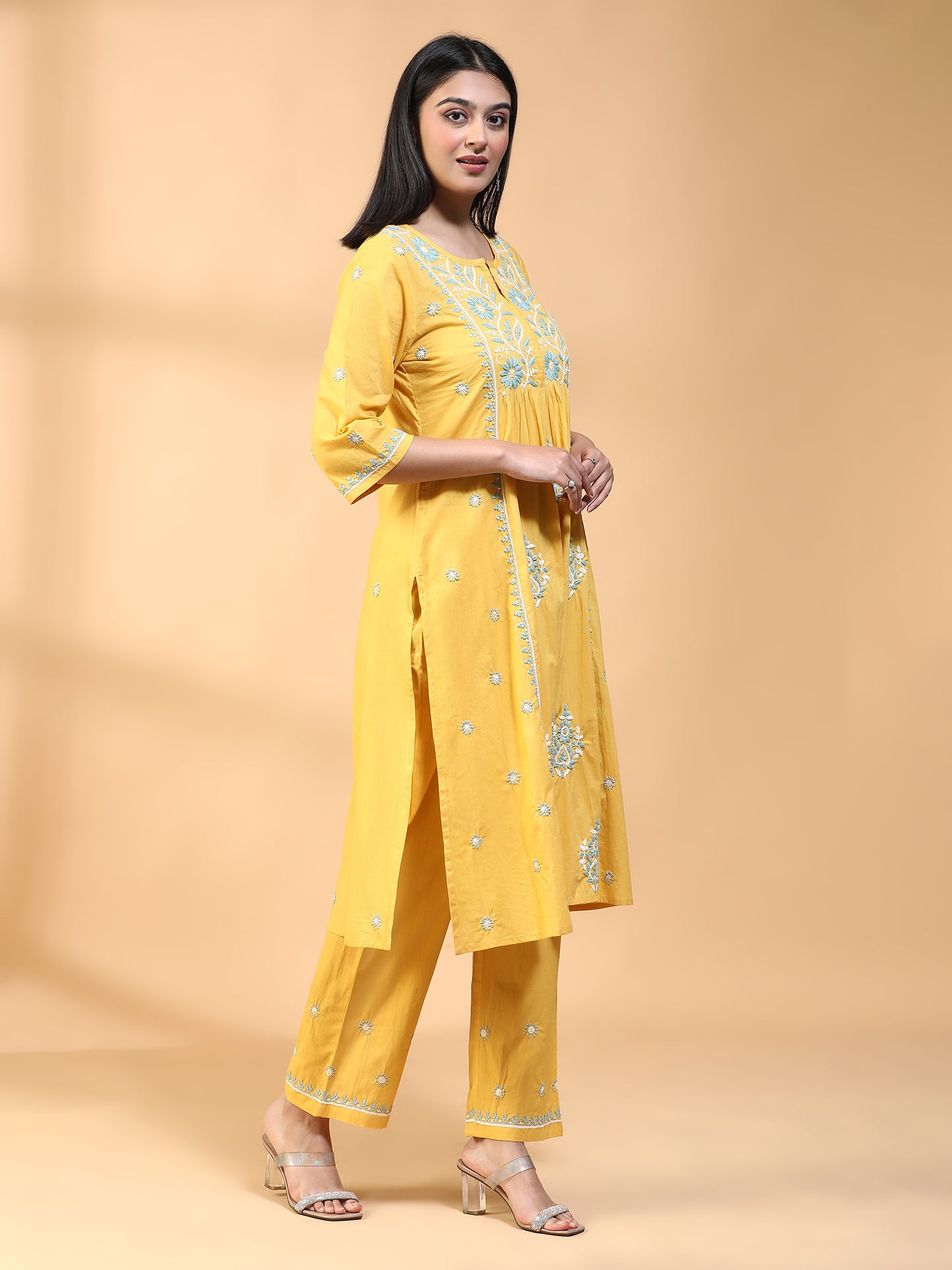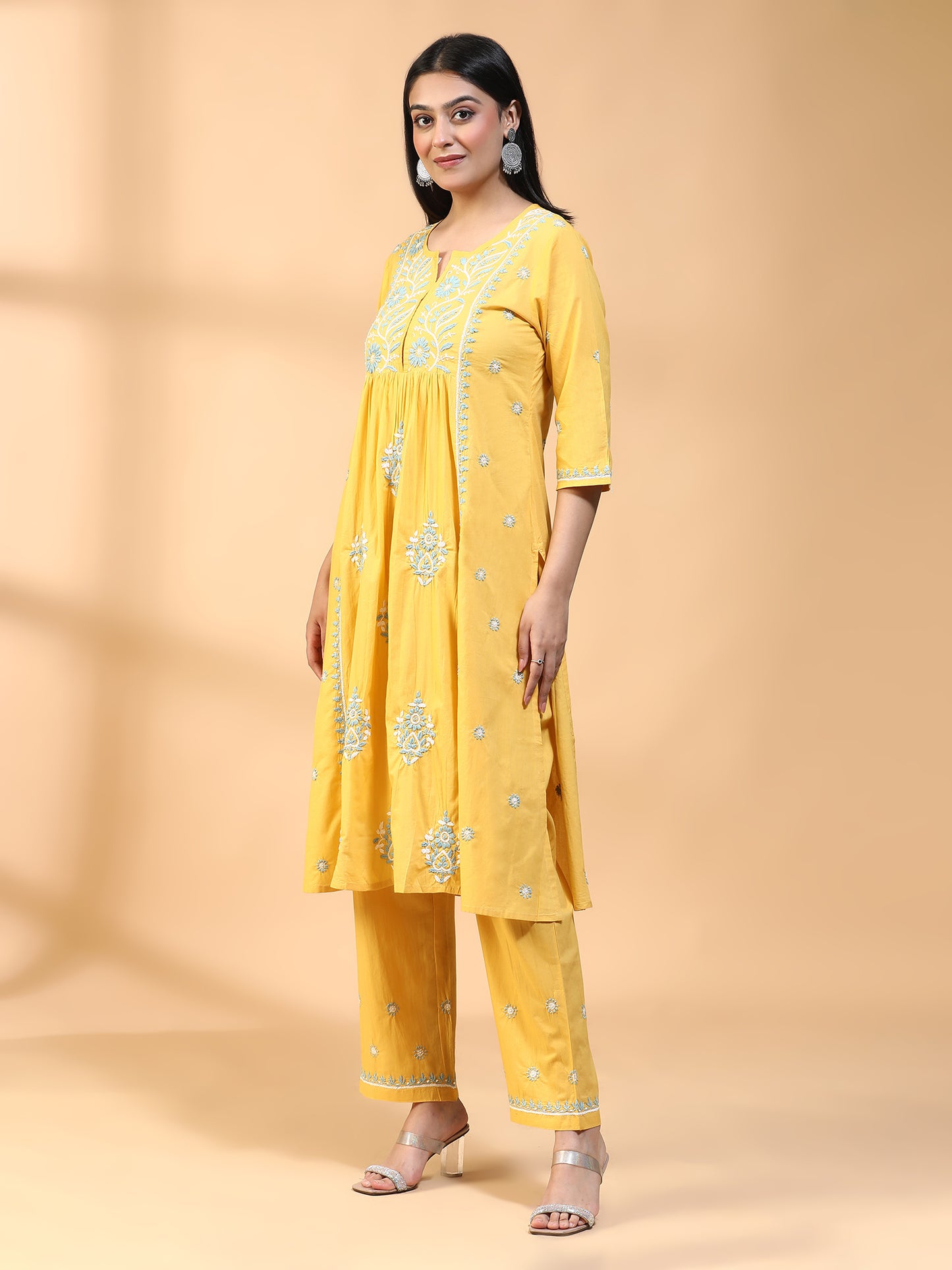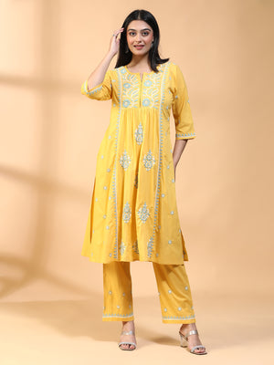 Hand Embroidered Lucknowi Chikankari Yellow Gathethred Kurta Set CH0322